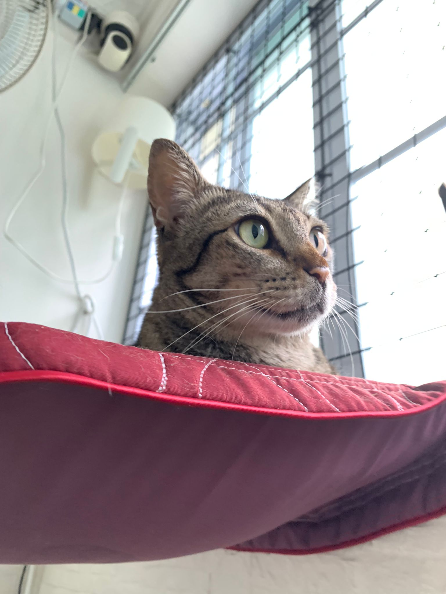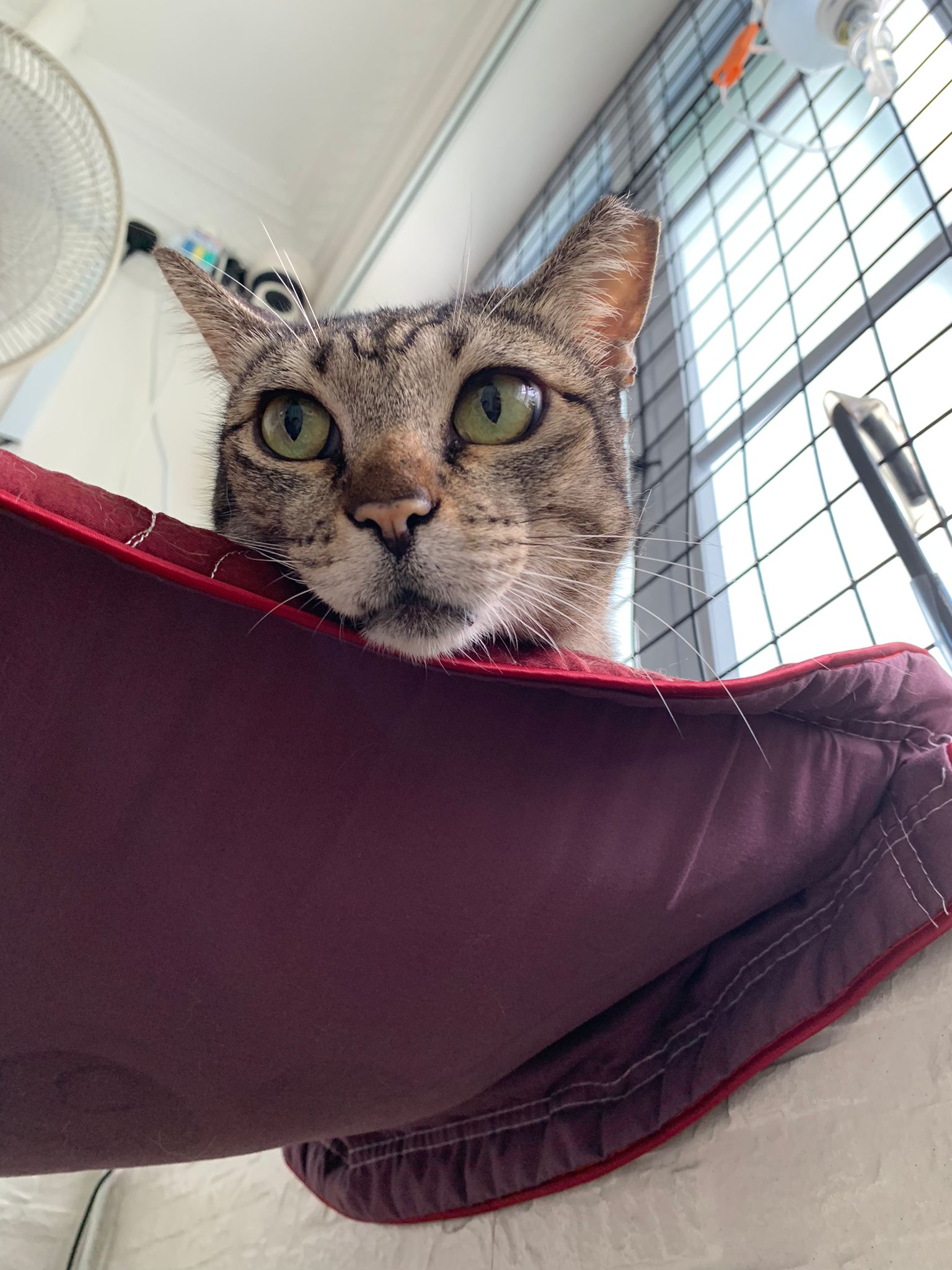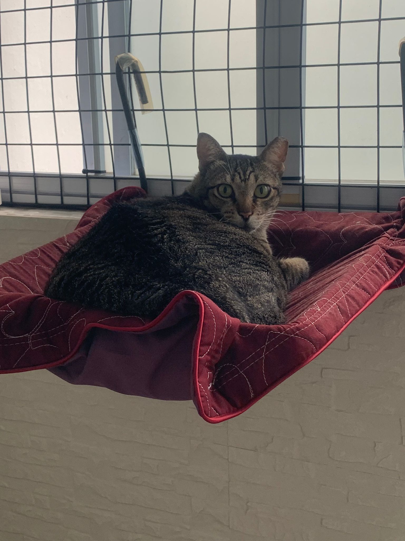 Mel on hanging bed And only meow meow when I’m doing stuff. Carry her down to eat, don’t know how to come down? Serve tuna w chicken ham.