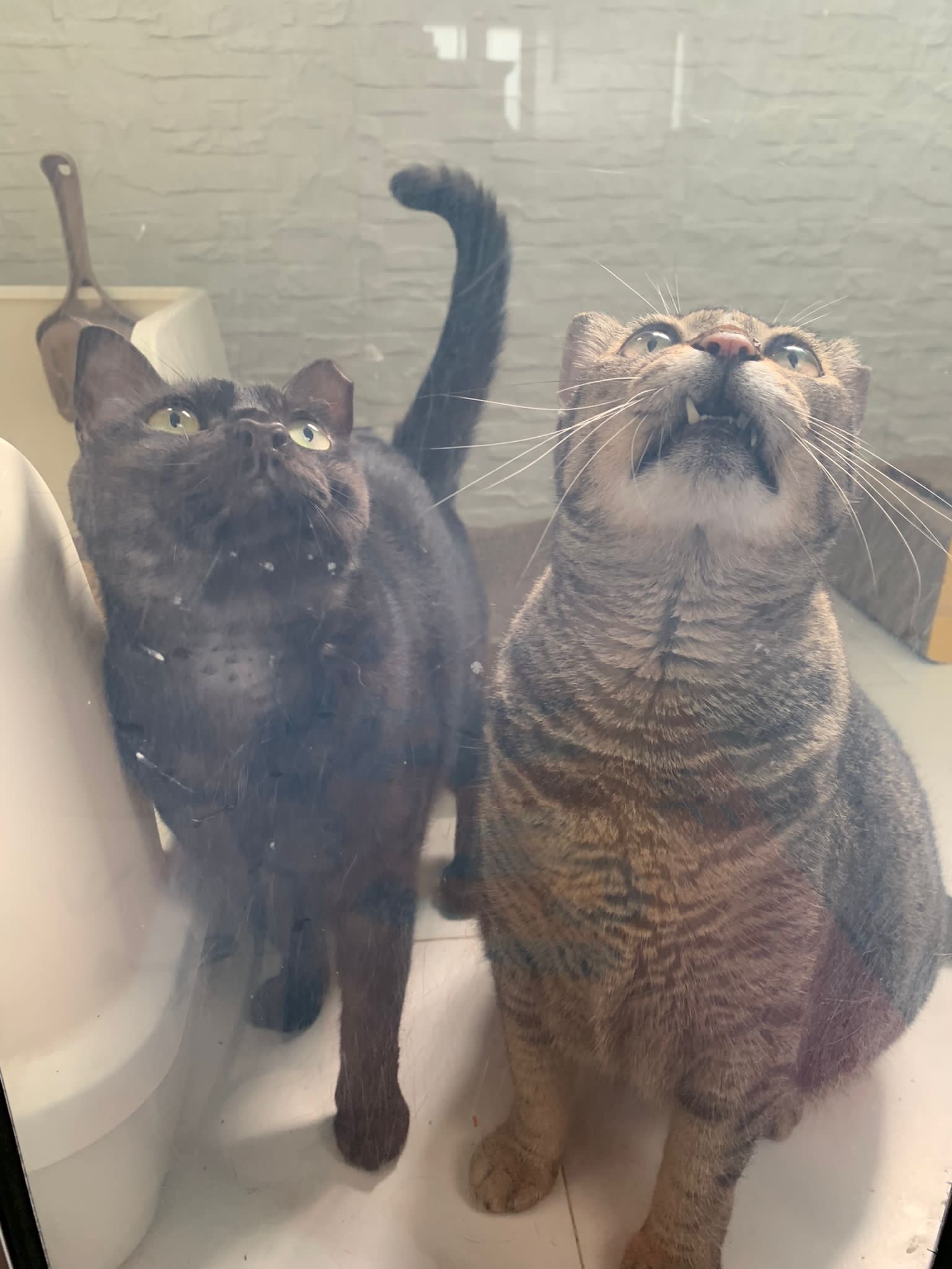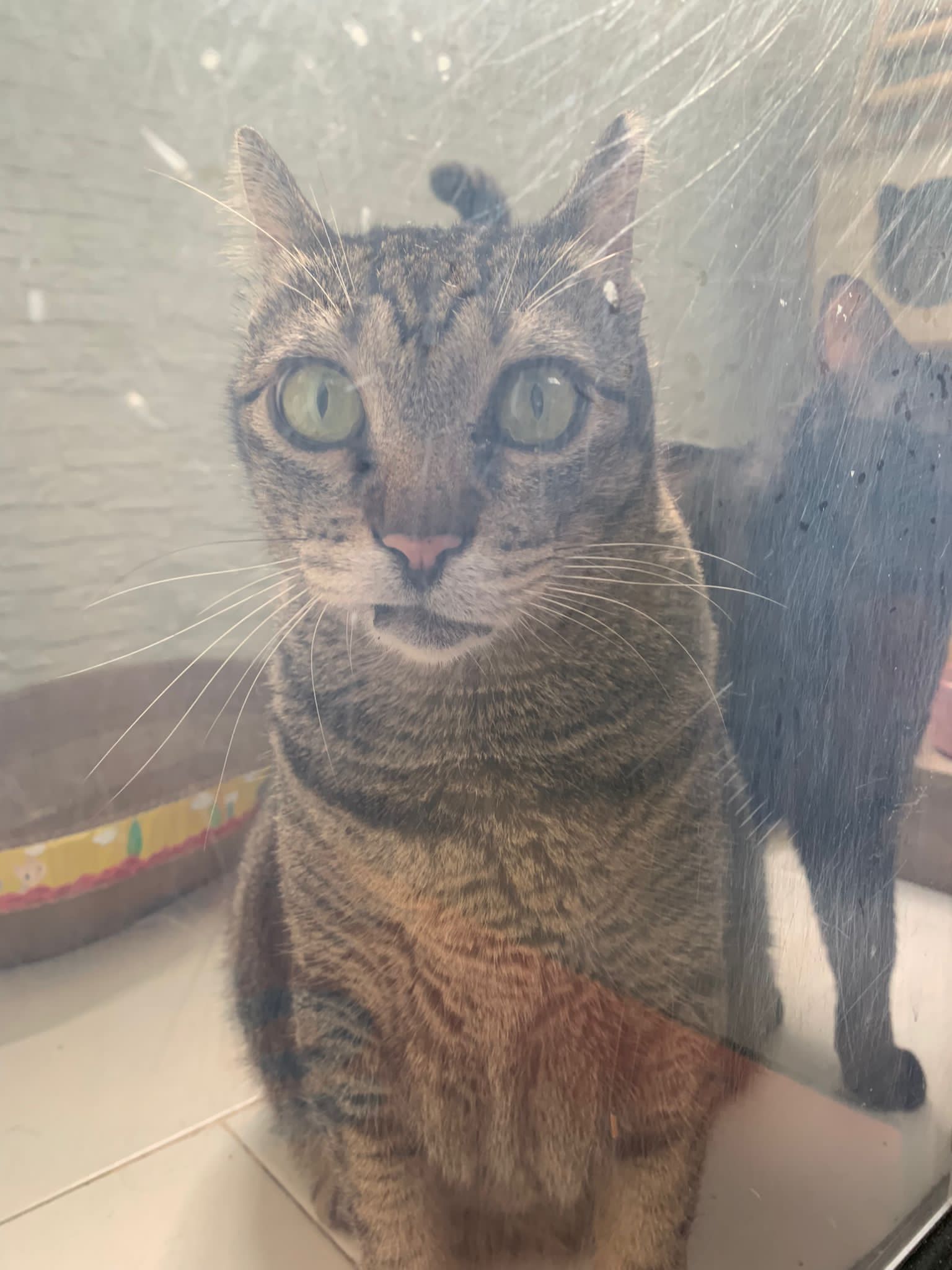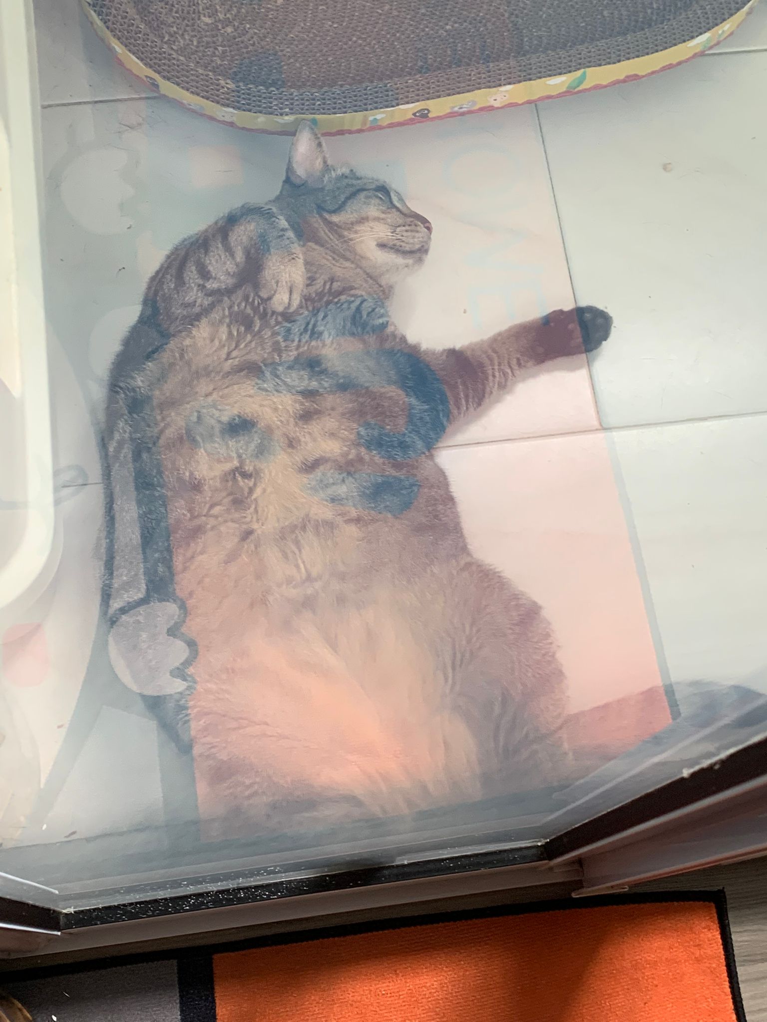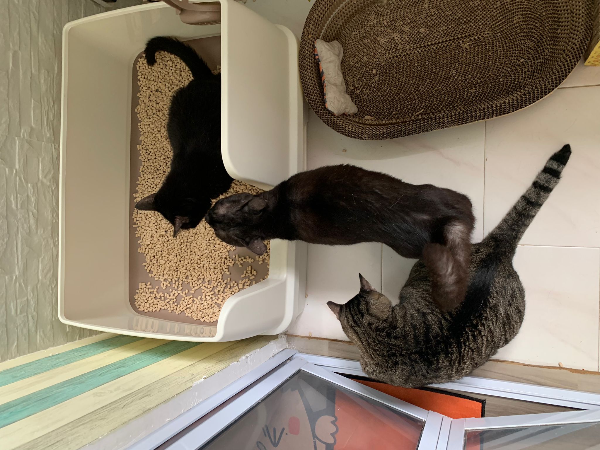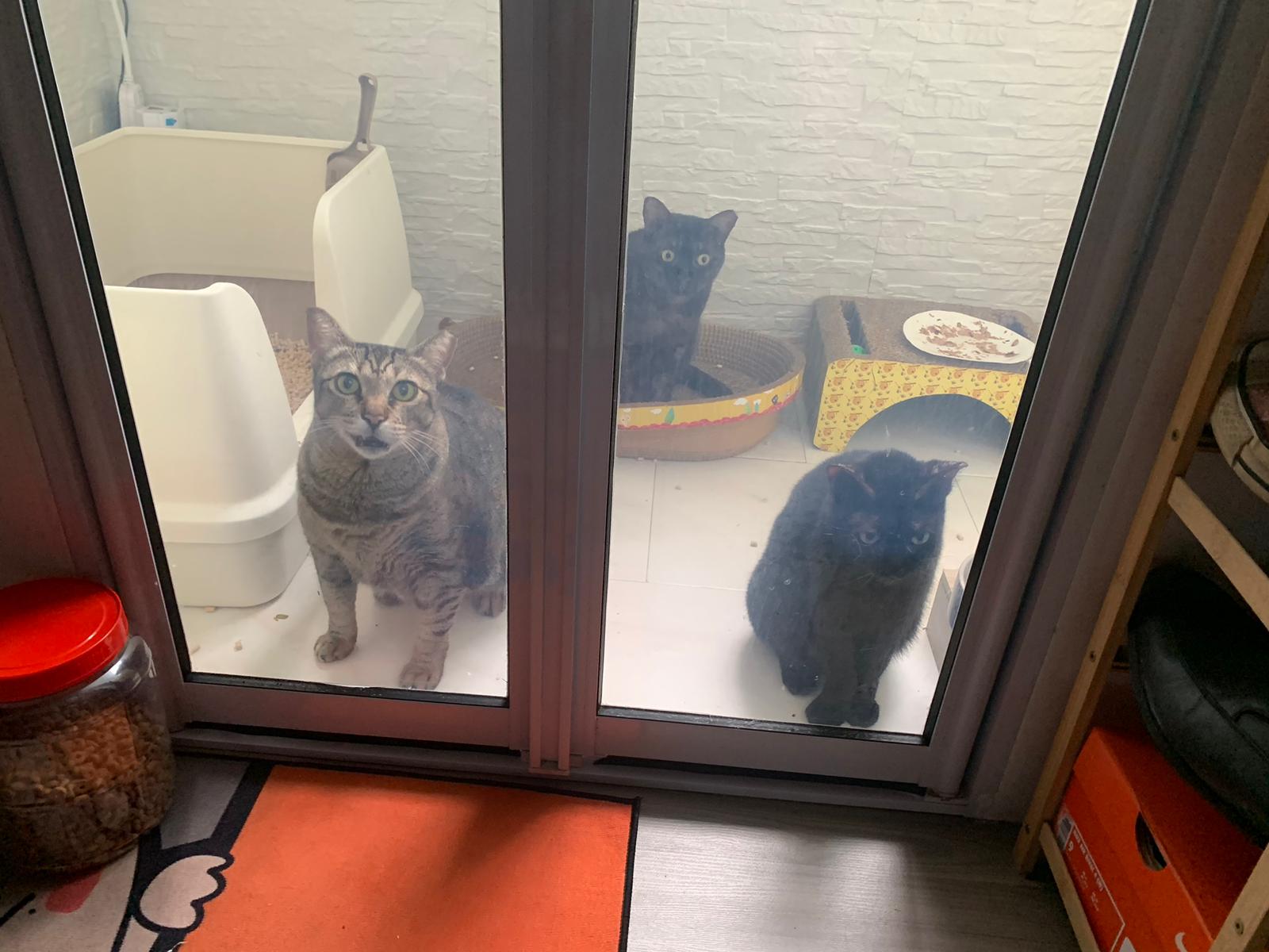 10.50am: cleaning day. Their room condo dirty cos of the stains made by mainly Blackie. They like totoro comfy room so much that they don’t want to move to kitchen, so big can roam they don’t want move. Mel and le le and Vince want to run out together – let the other 2 escape, Mel stay in n she hiss cos Duno who step on her. Got stay near glass panel n keep looking out to see their room service done alr or not, also got roam to the end of the kitchen to check things out