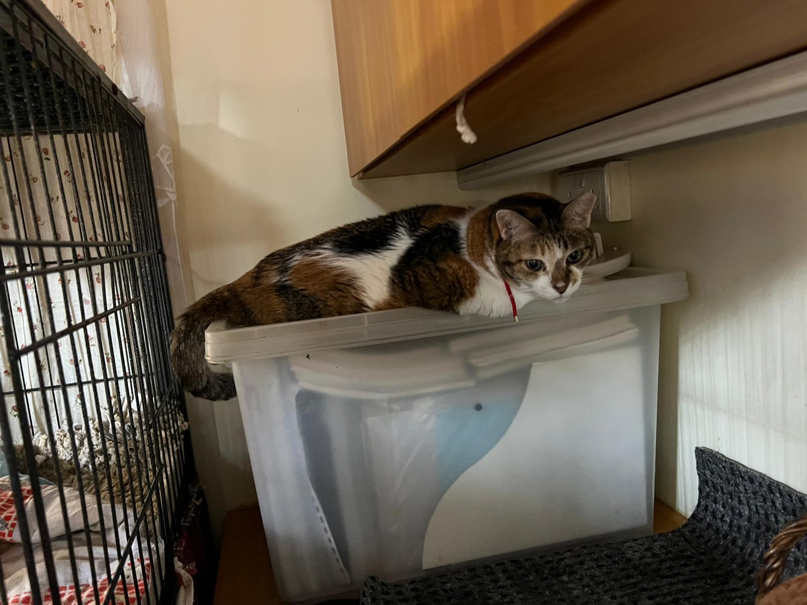 9.00am: I enter 猫房 and she is on the kitchen cabinet w mei.