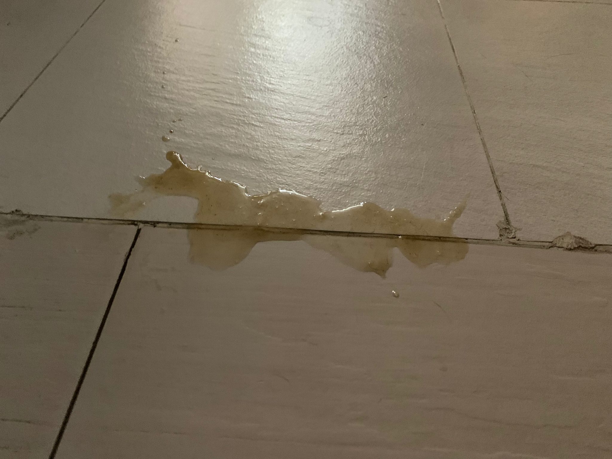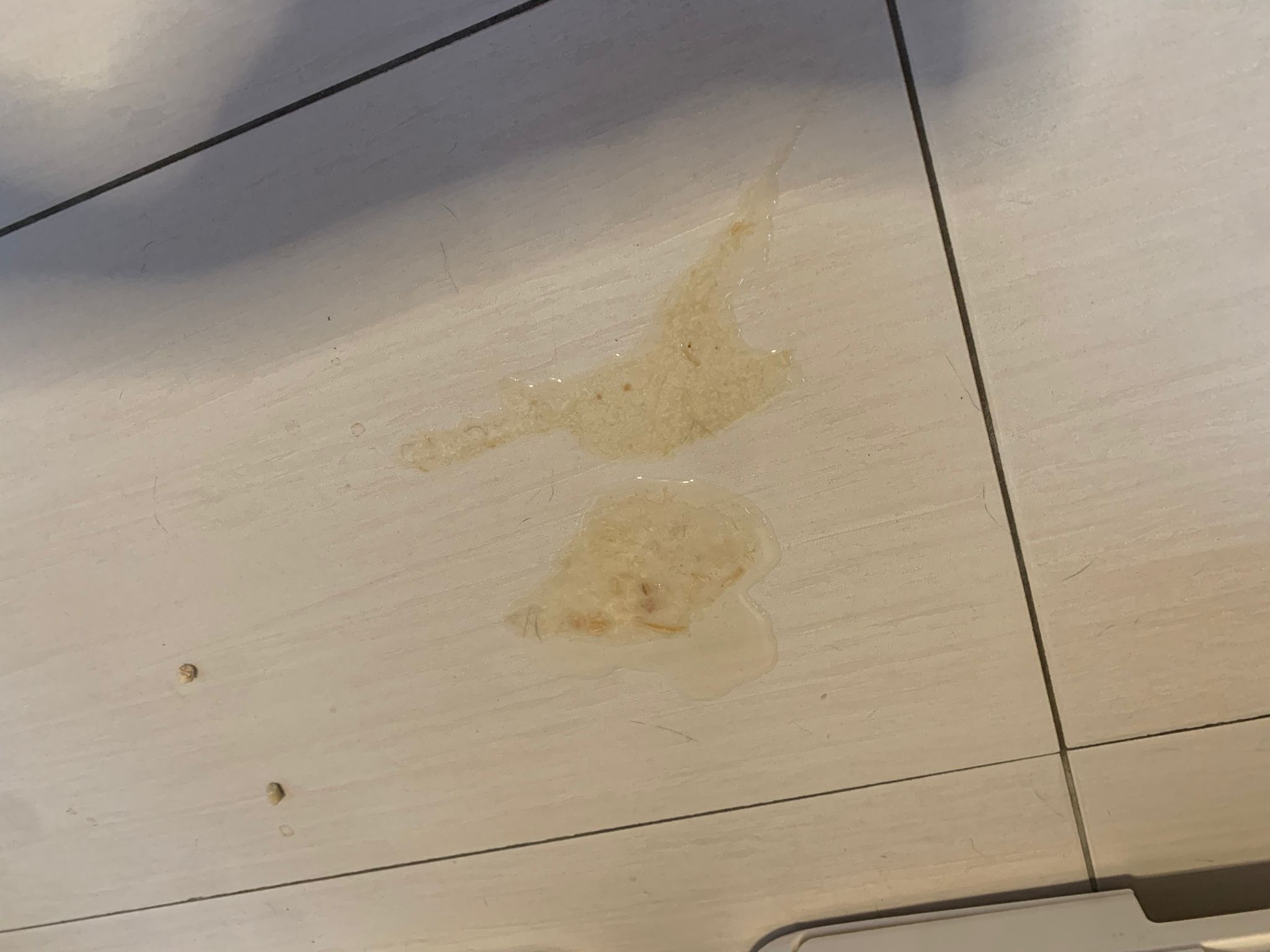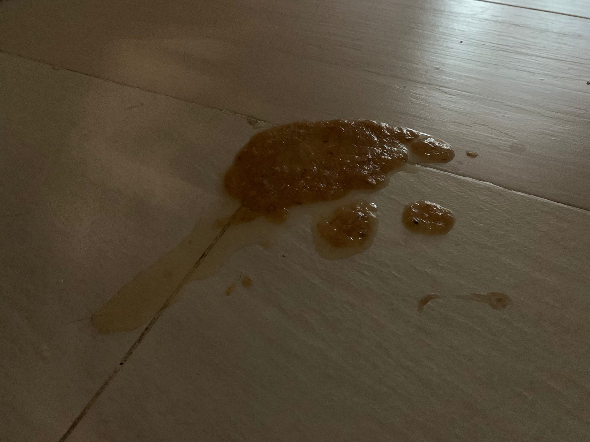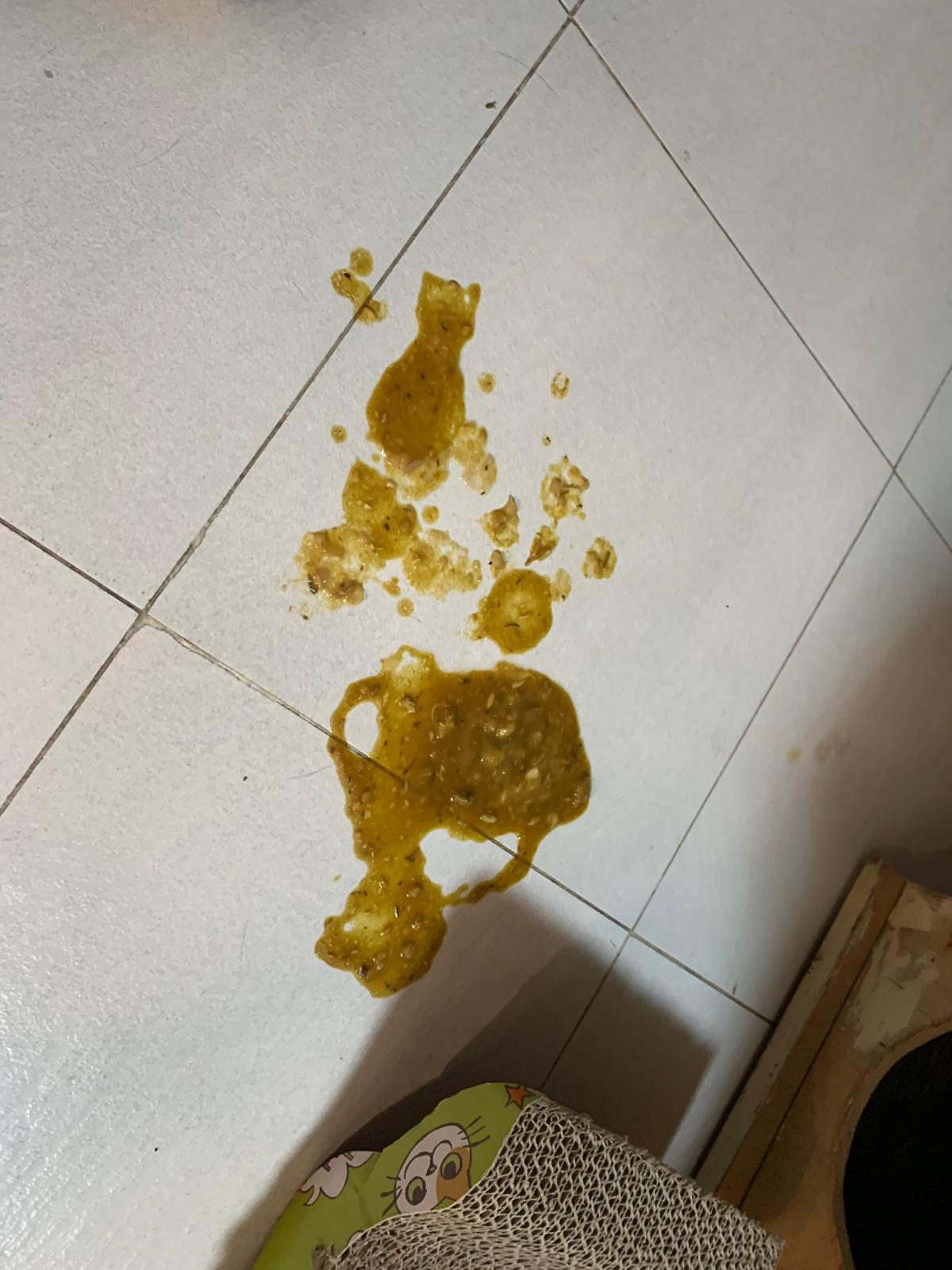 Found big splash of vomit liquid – but got 2 PCs of yesterday treat (John harm chicken breast, whole pc intact mean didn’t swallow)