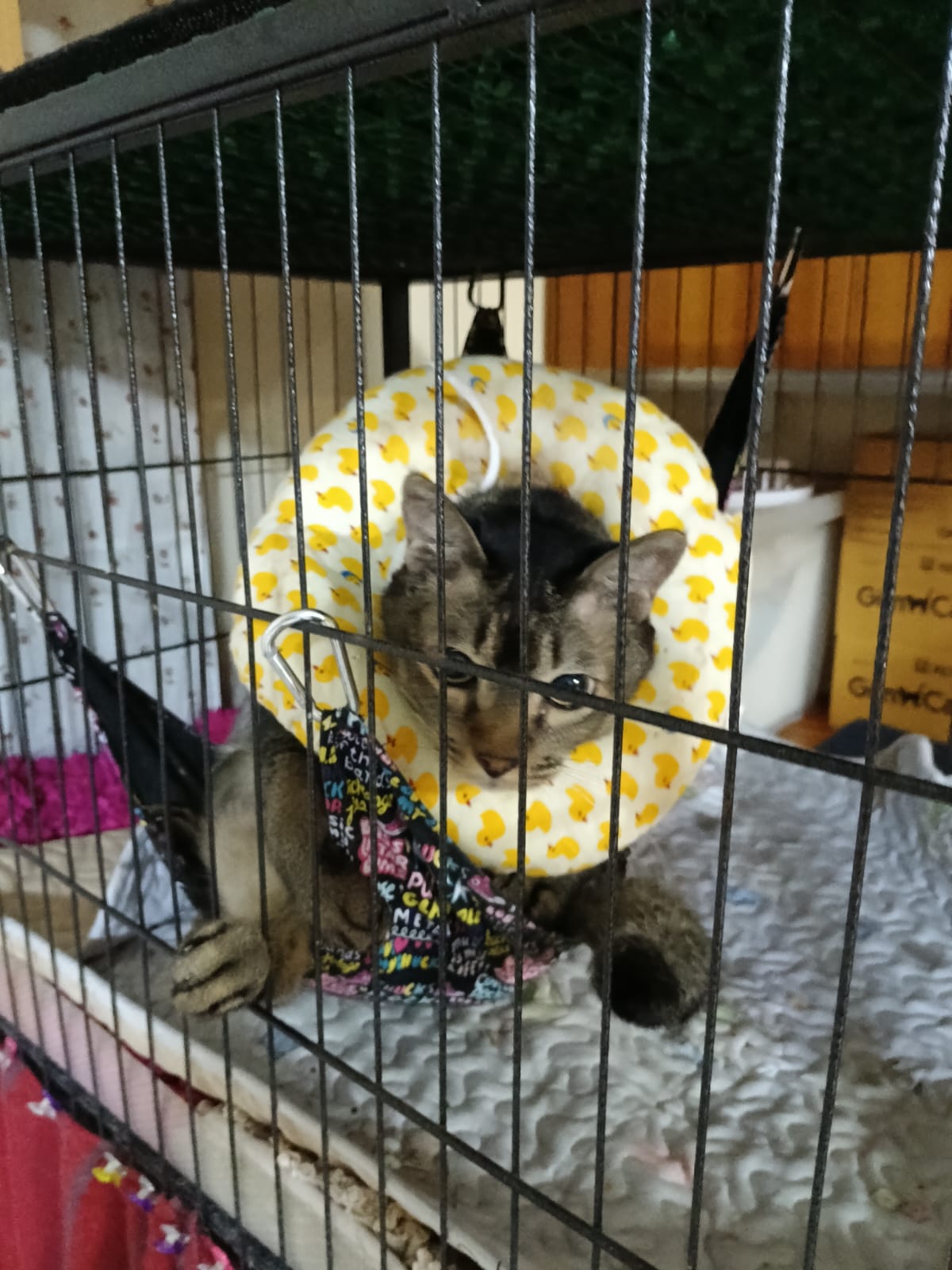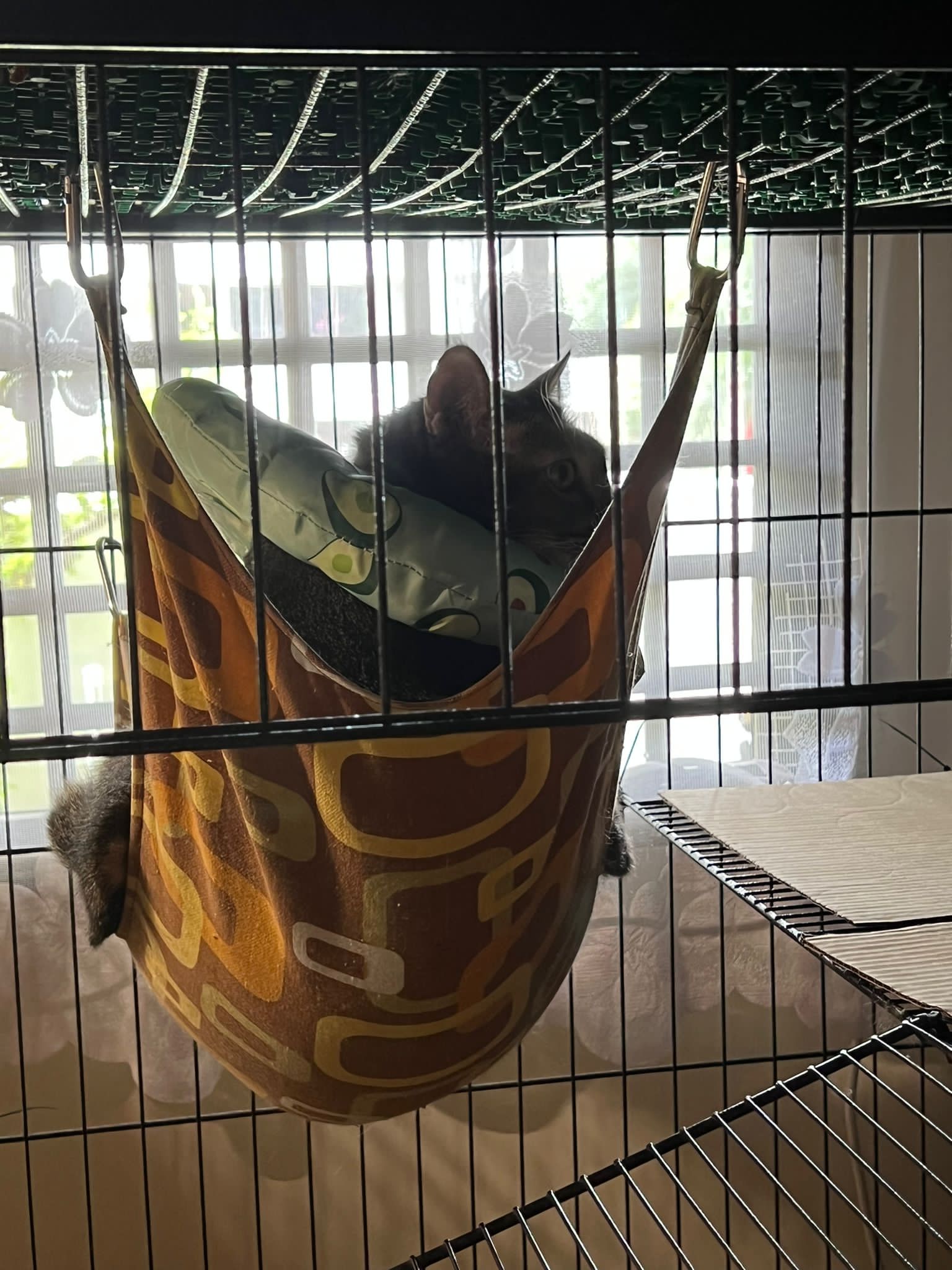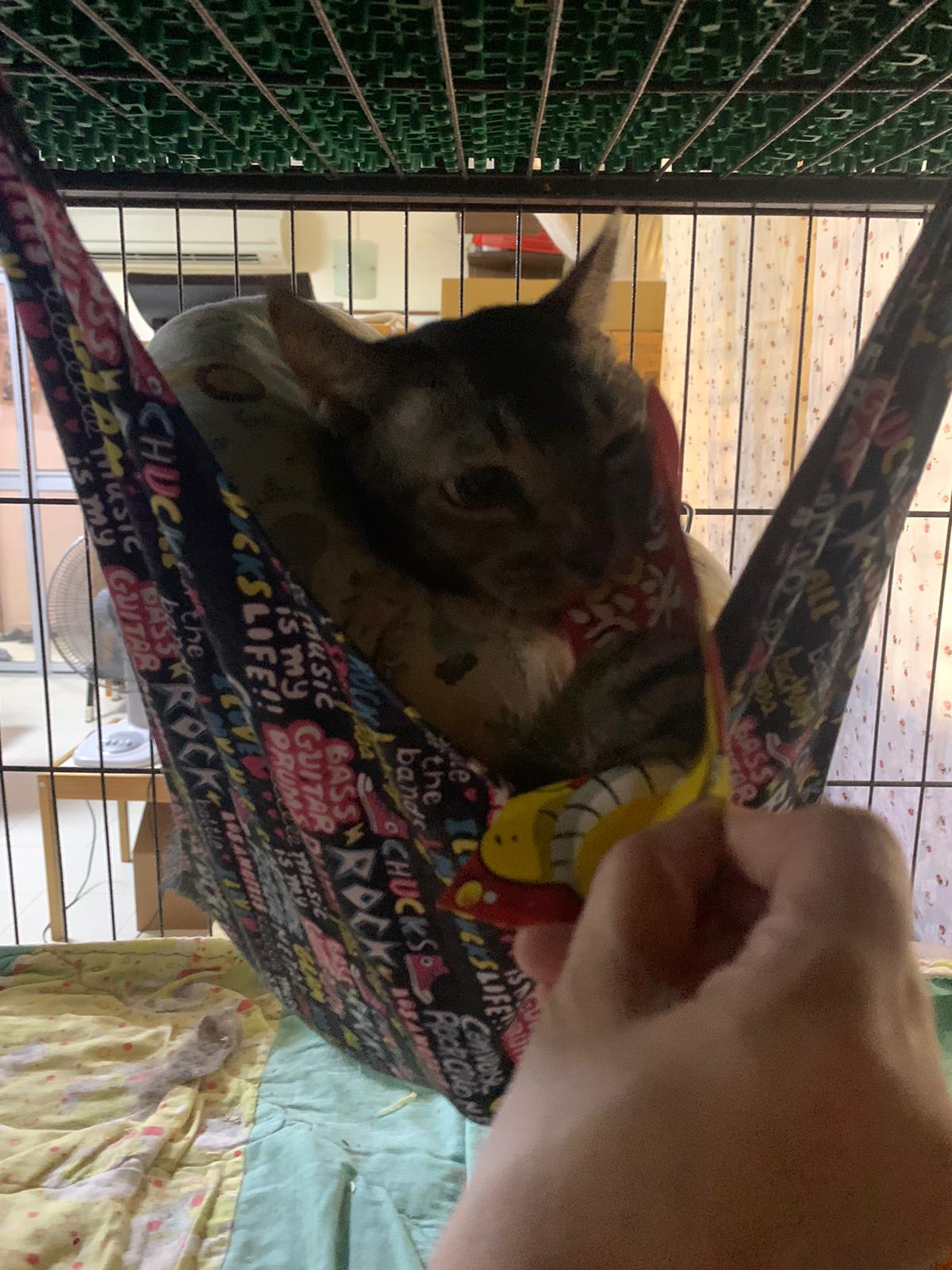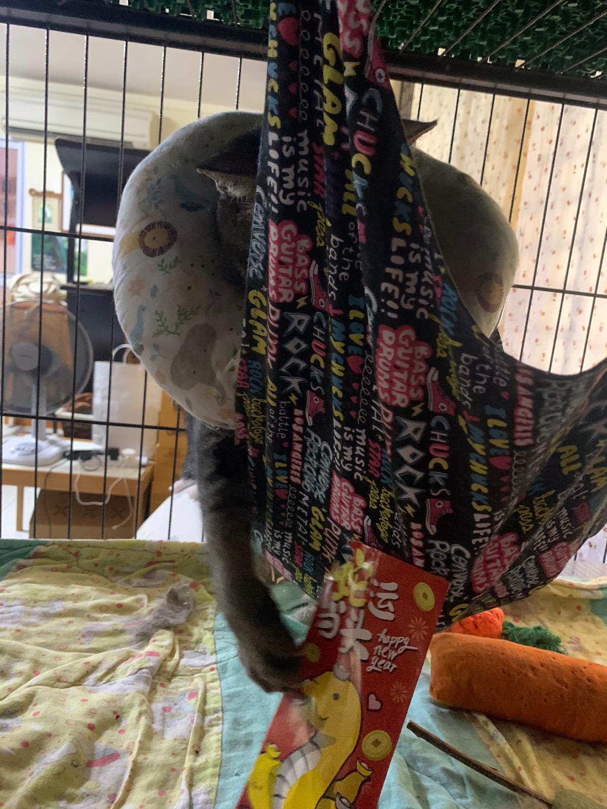 10am+: when I come in he is alr sit on hammock till I left. Fed him forti in cage. Didn’t find bad poo. No vomit.