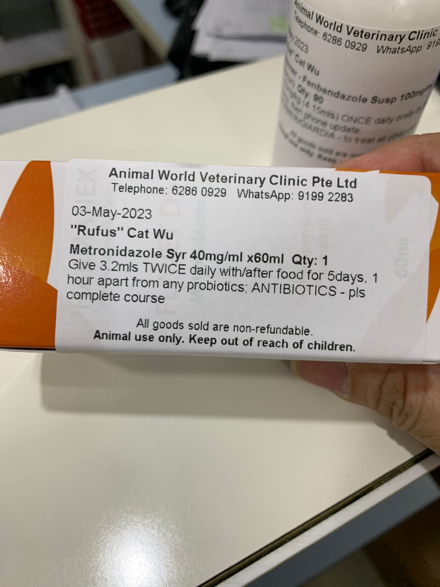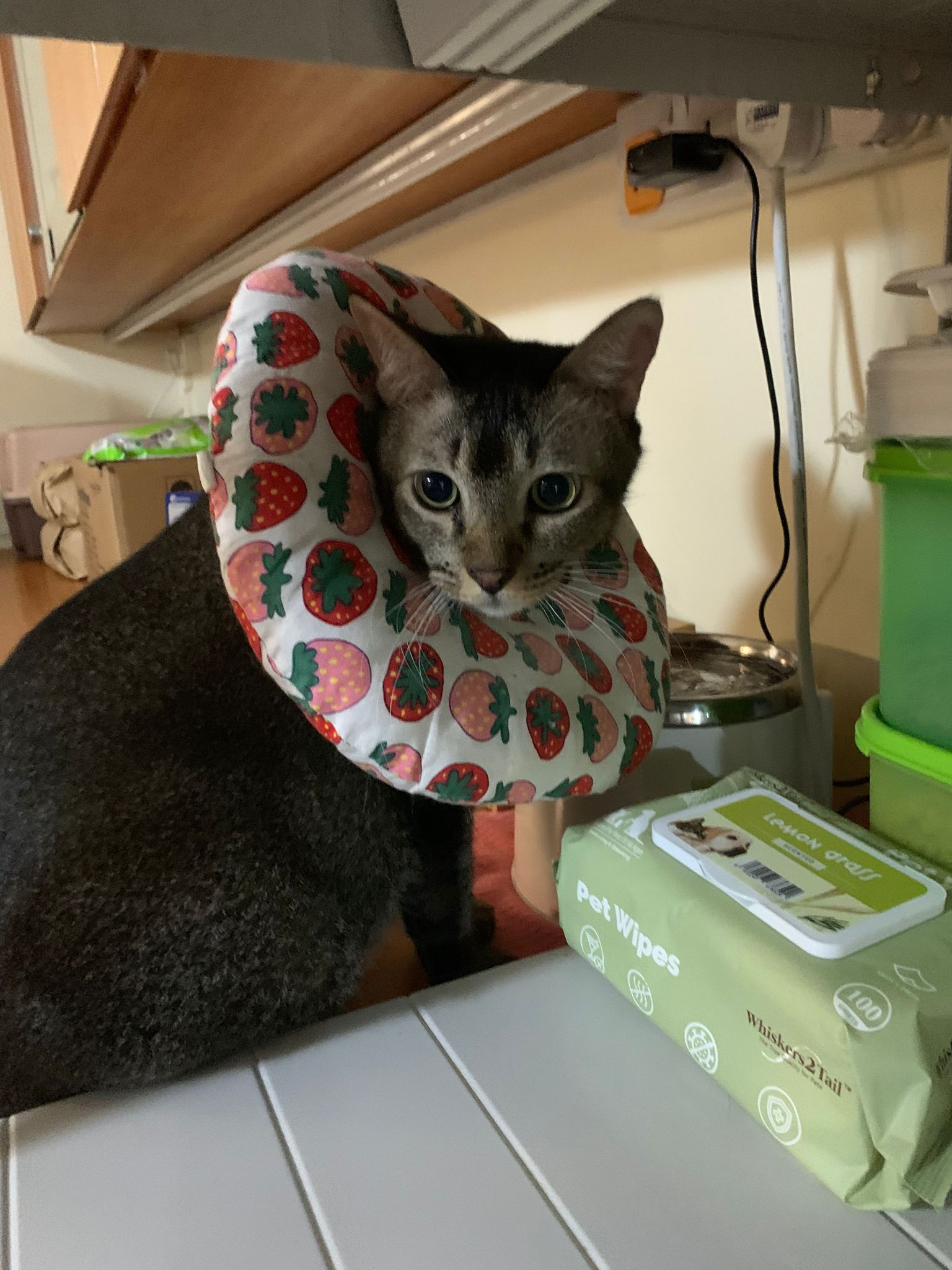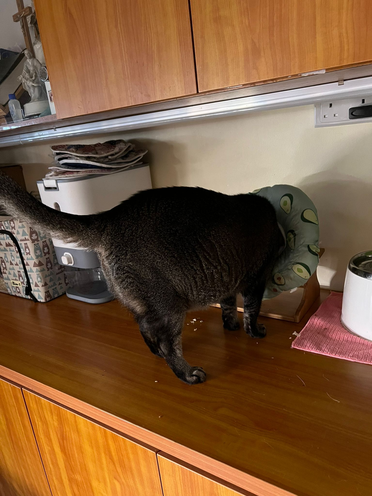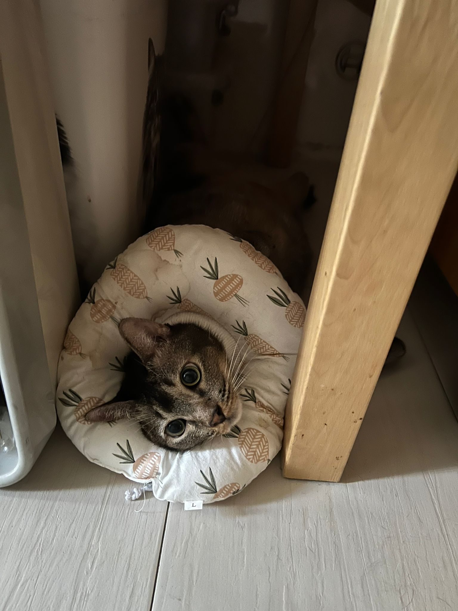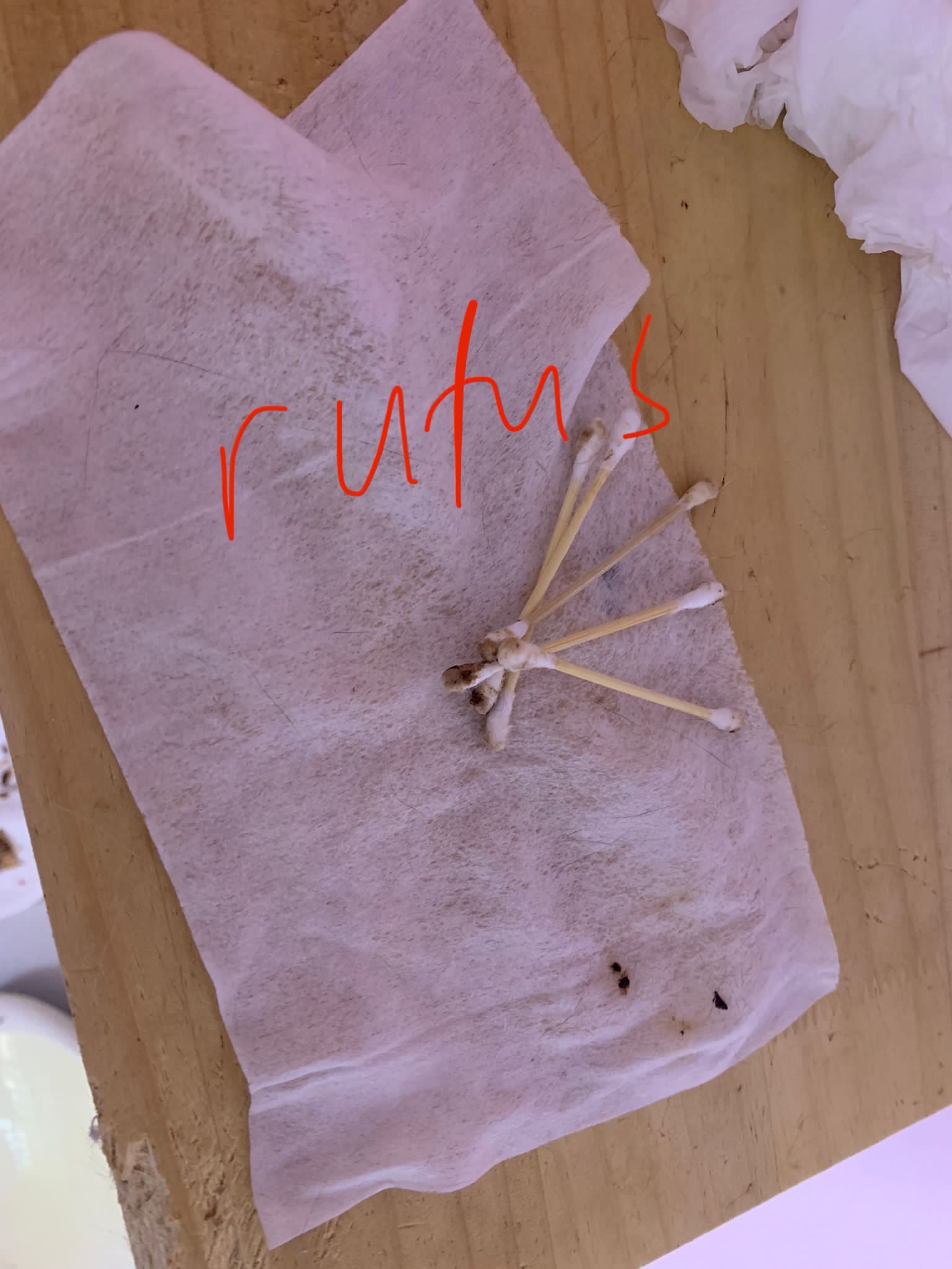 Rufus- probiotics given – ha he hide behind the kitchen cabinet I pull out n he come out.
