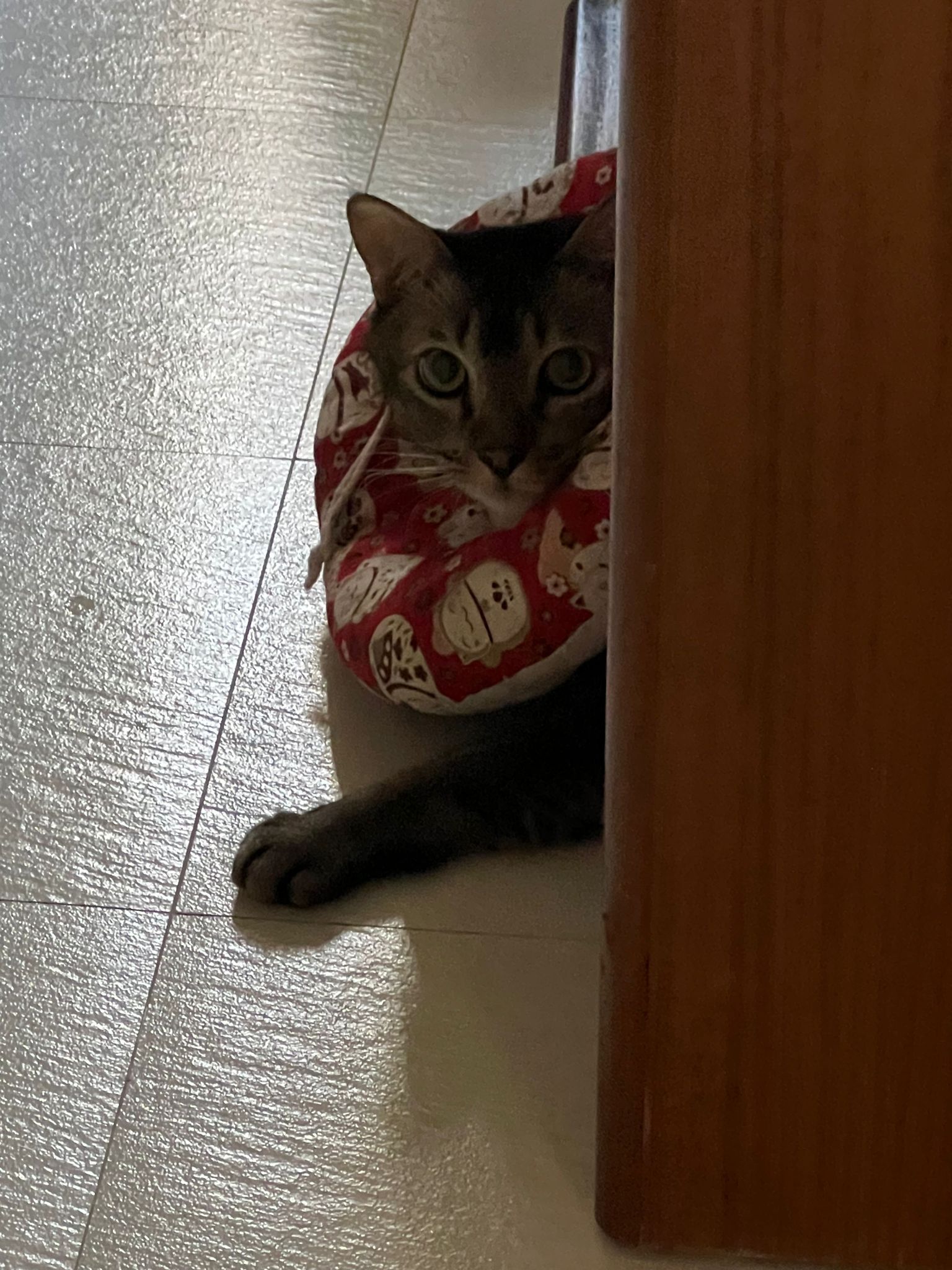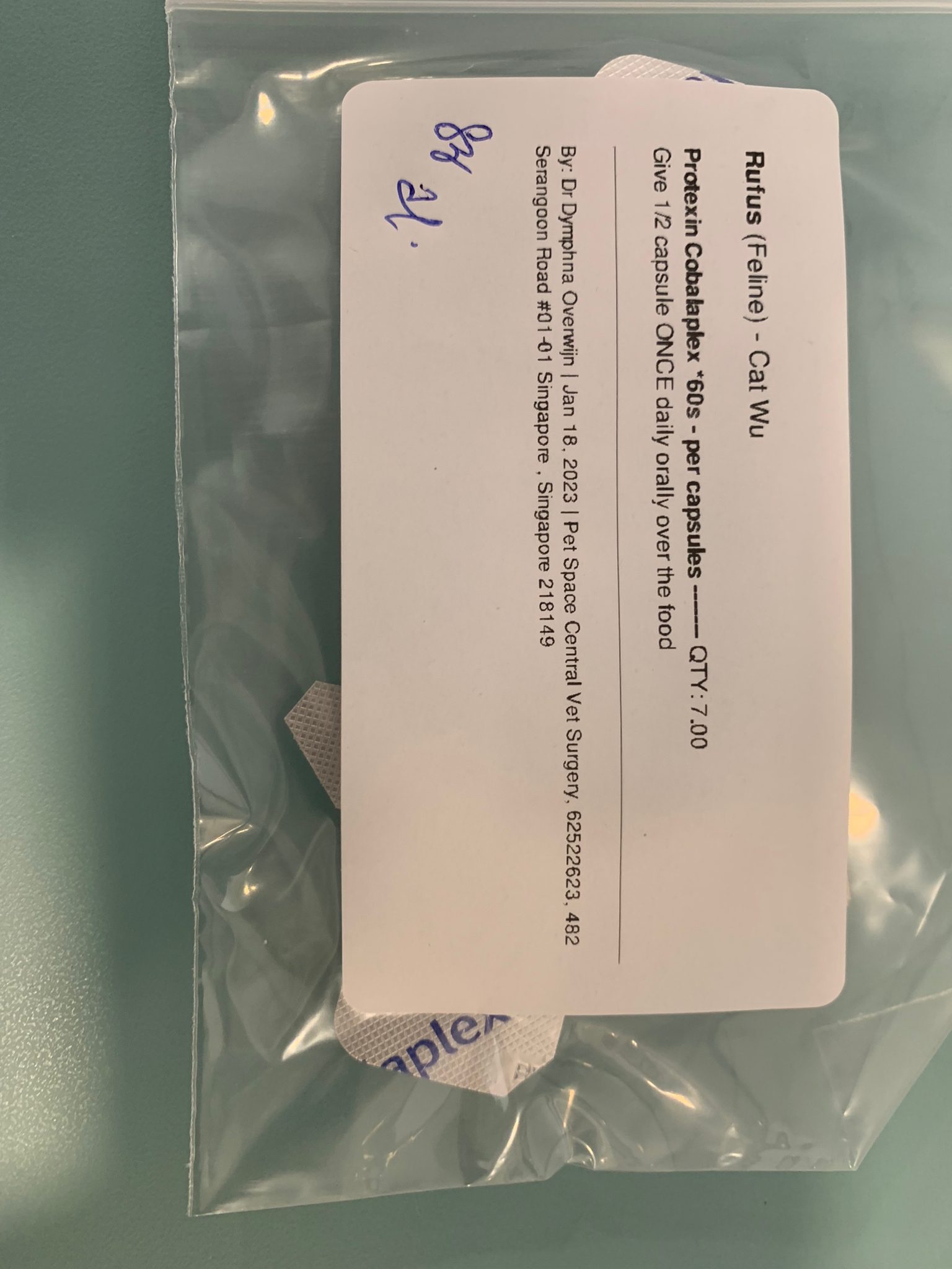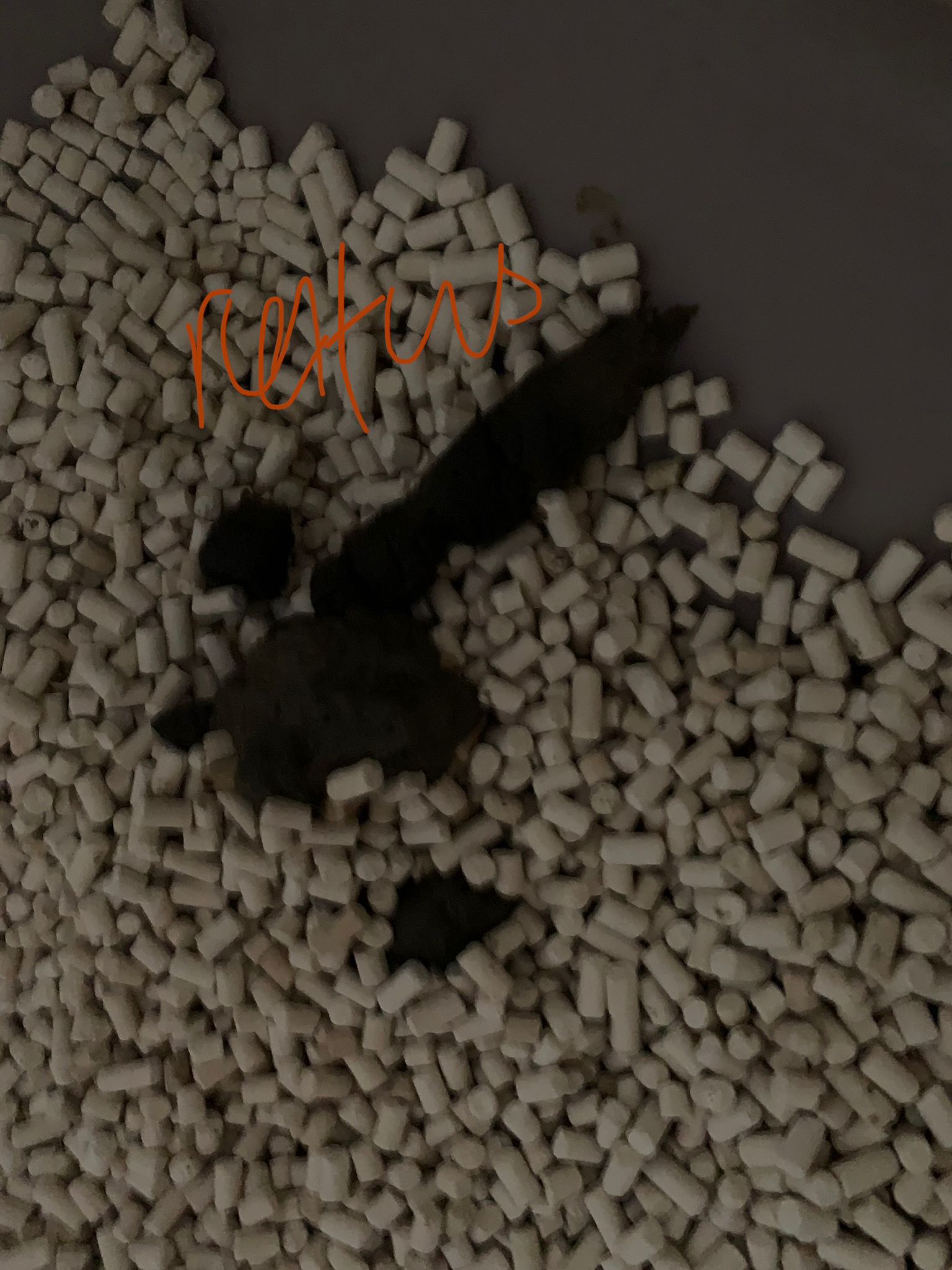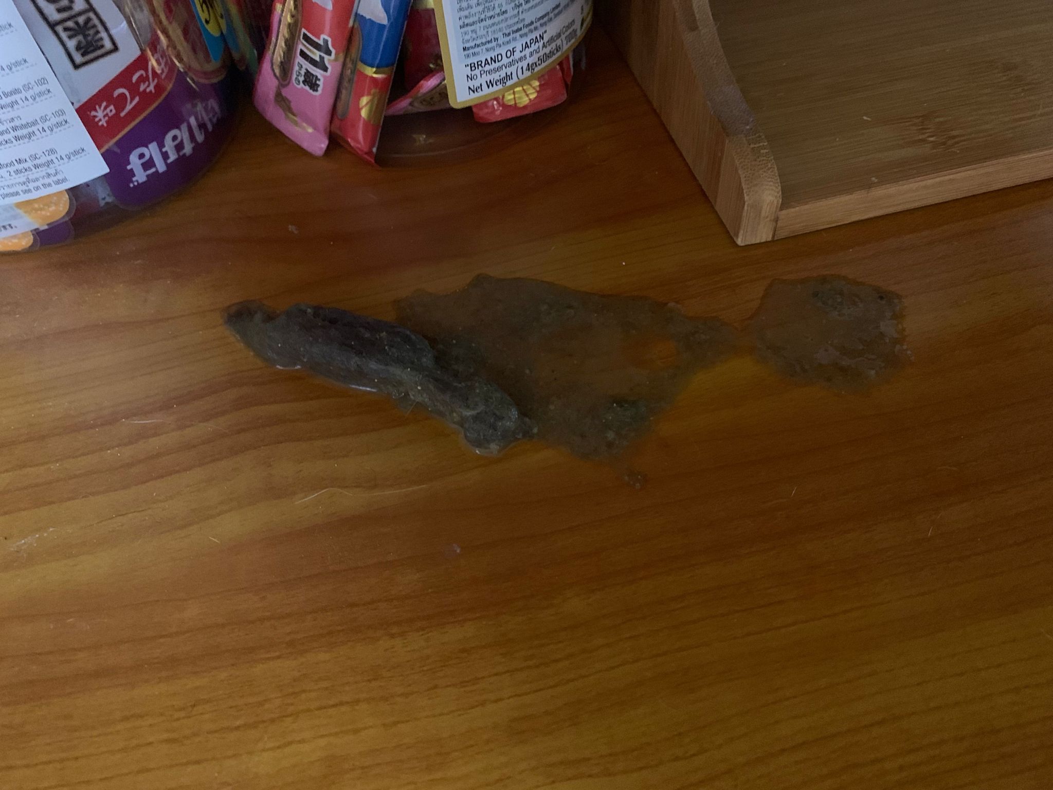 Rufus- probiotics given – ha he hide behind the kitchen cabinet I pull out n he come out.