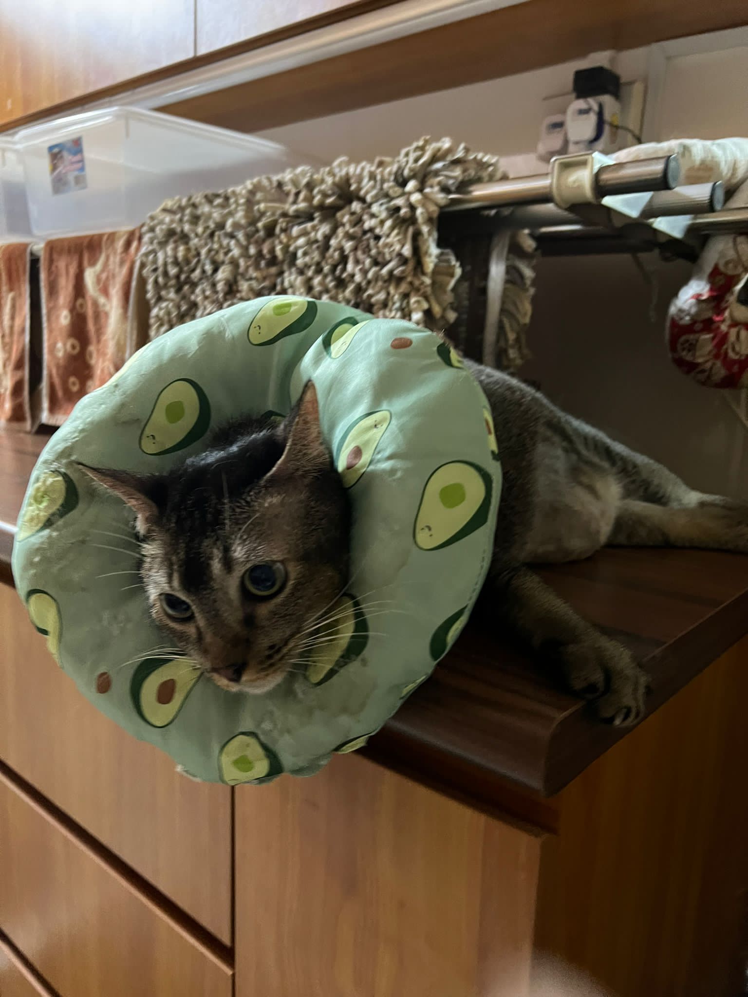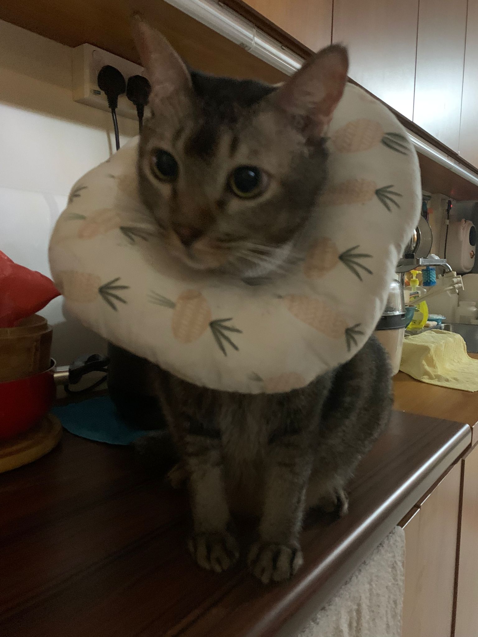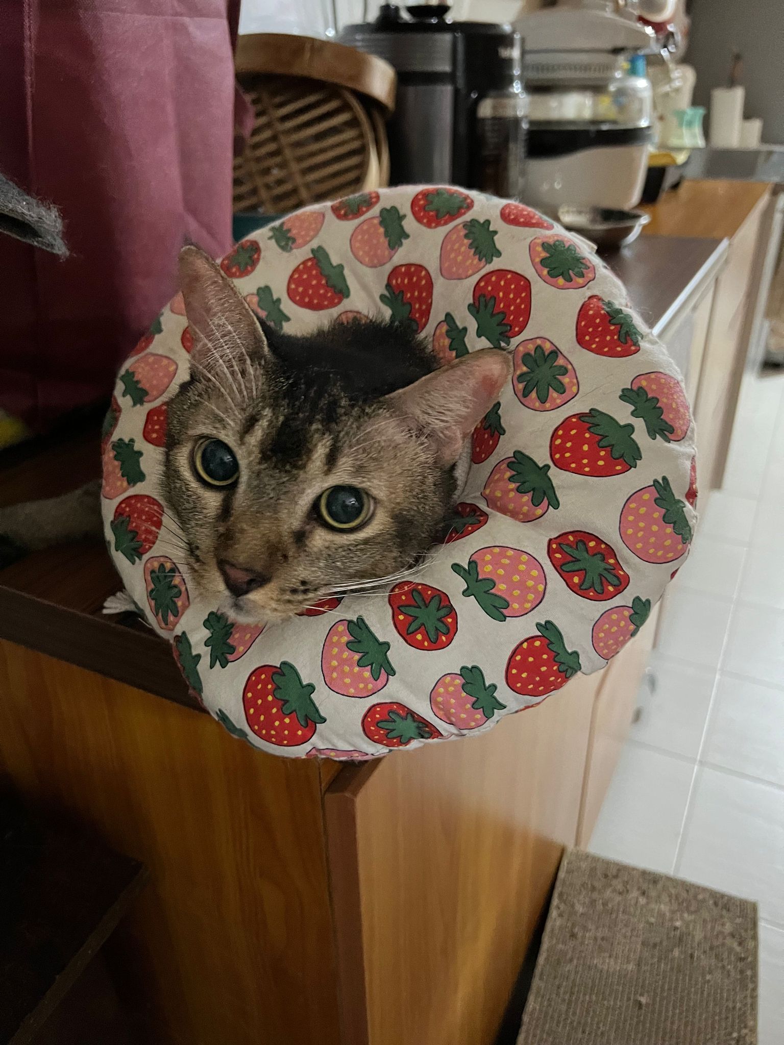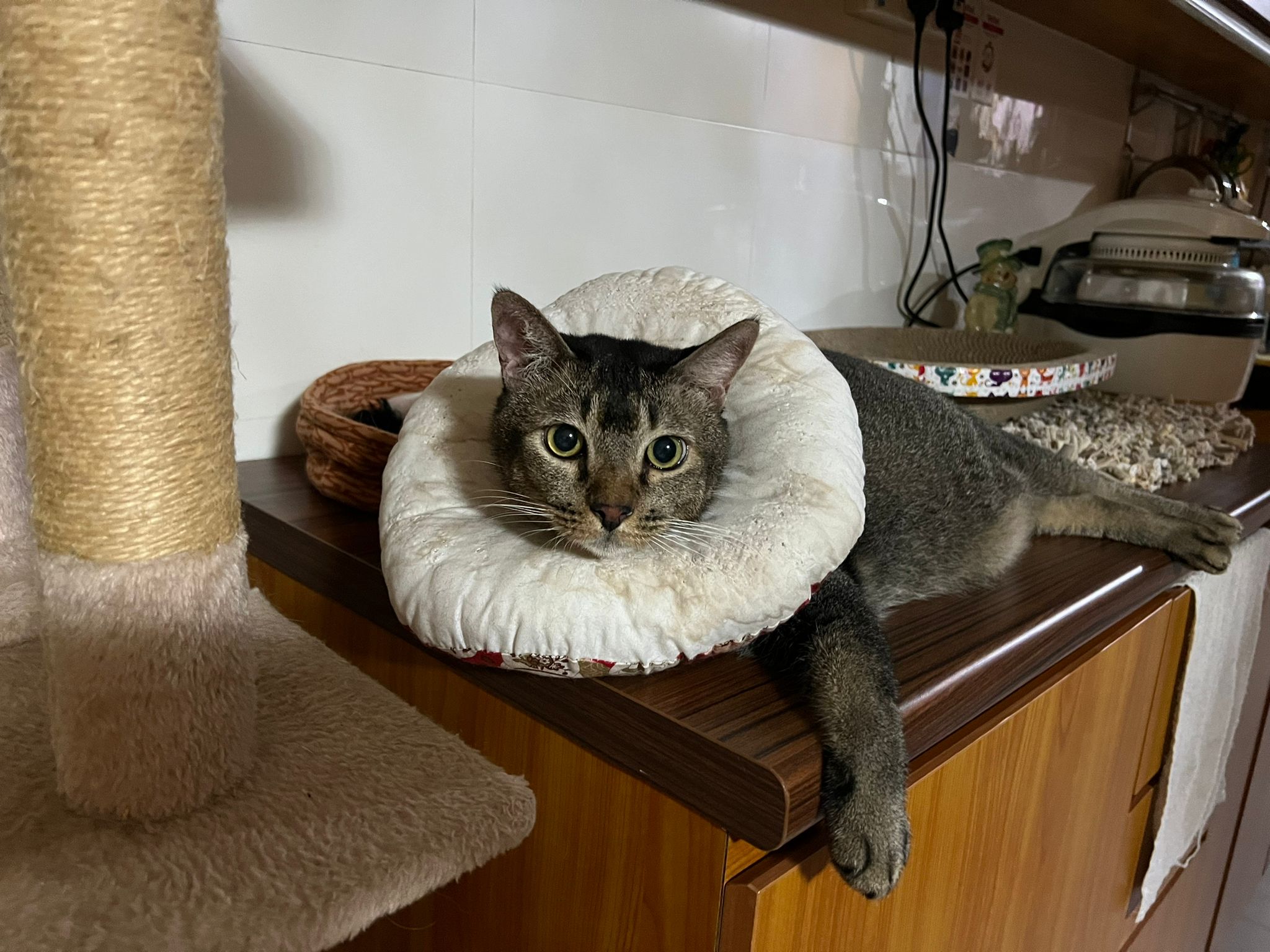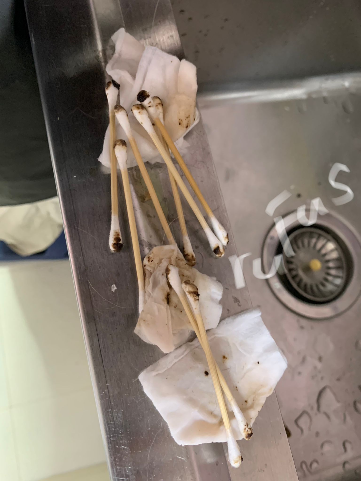 Rufus- probiotics given – ha he hide behind the kitchen cabinet I pull out n he come out.
