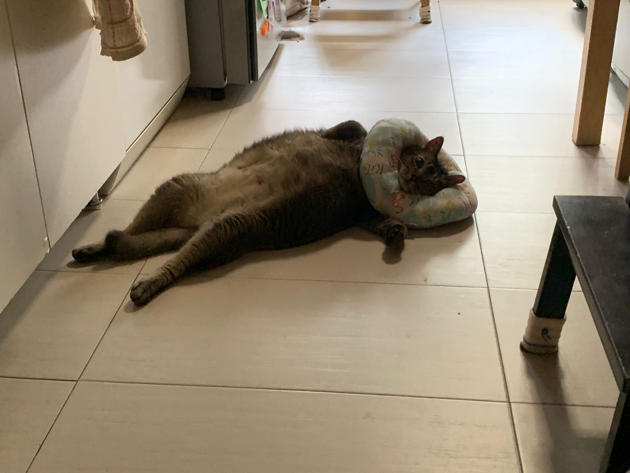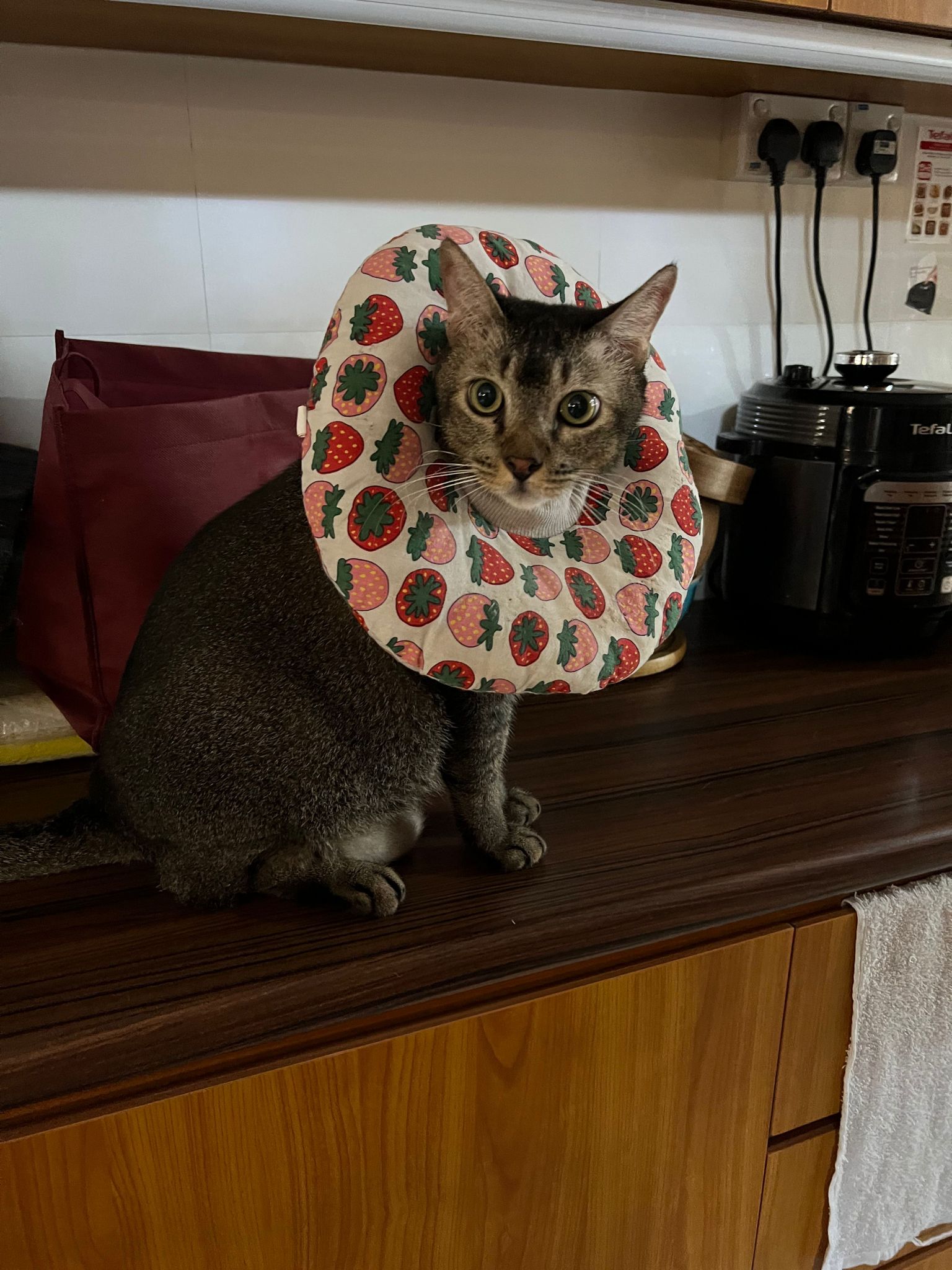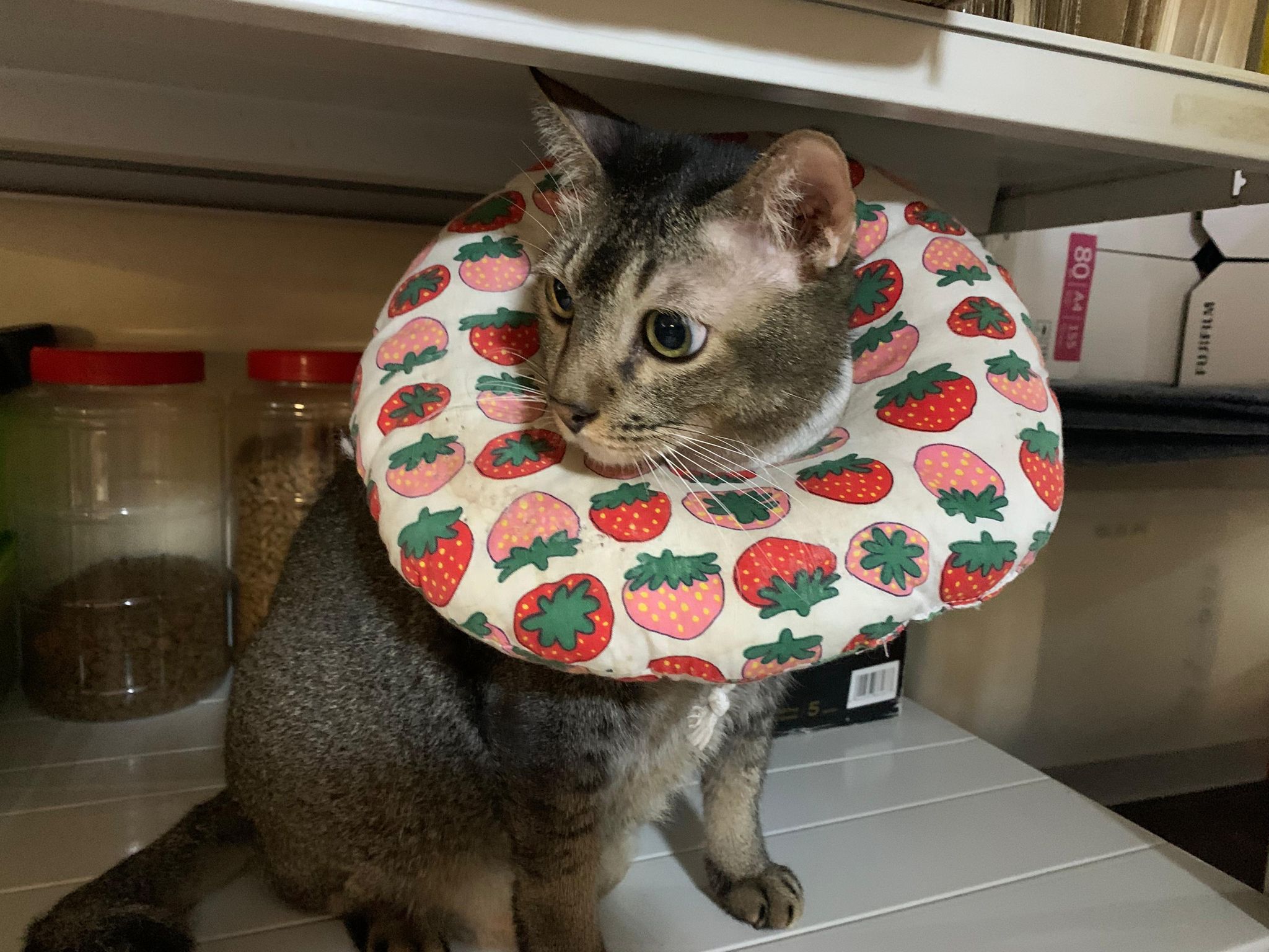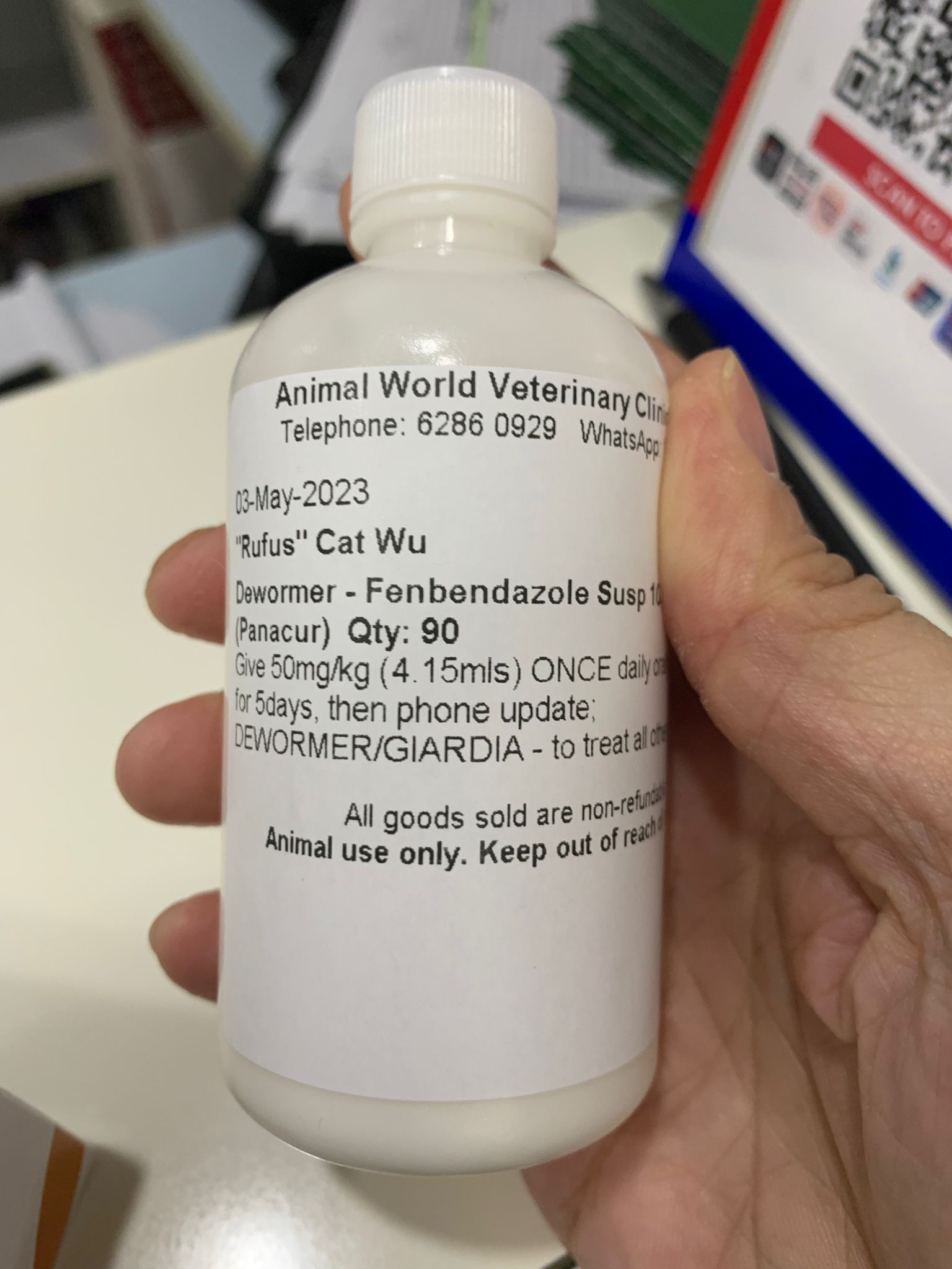 Rufus- probiotics given – ha he hide behind the kitchen cabinet I pull out n he come out.