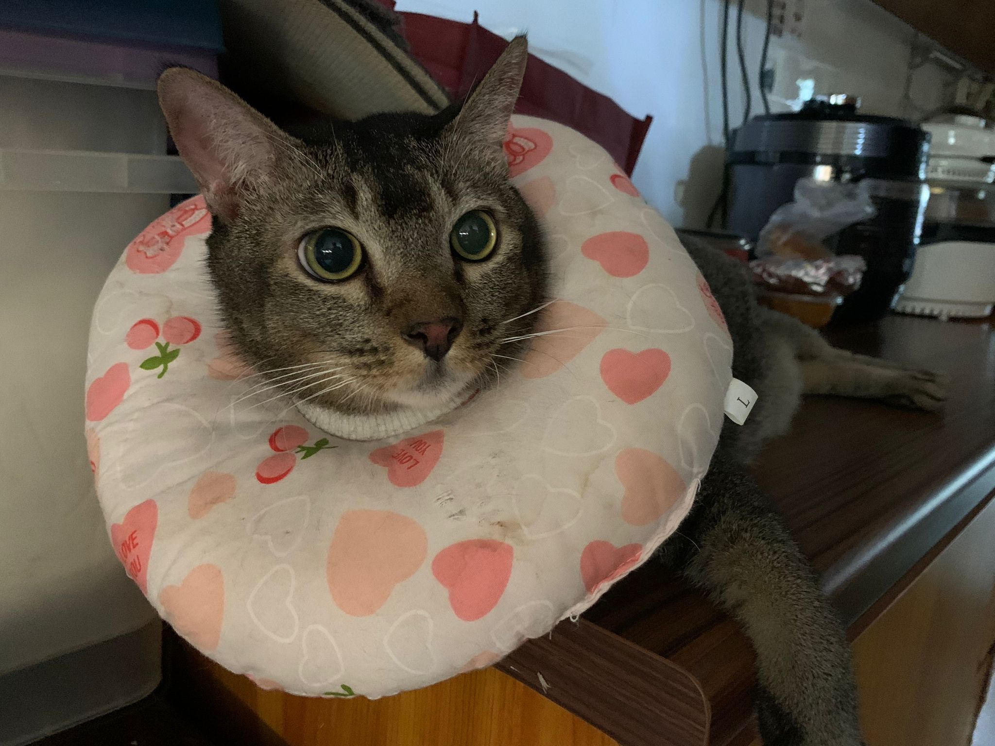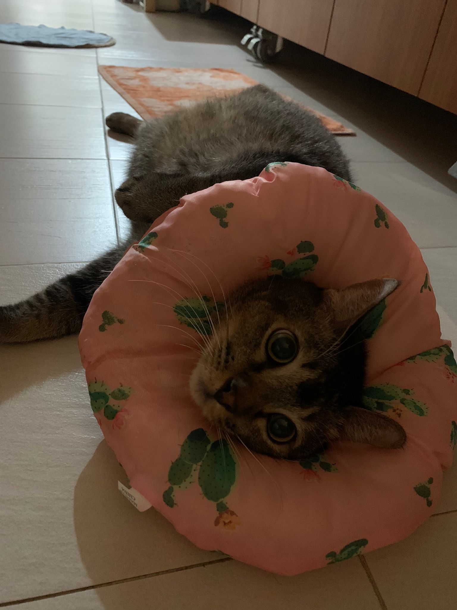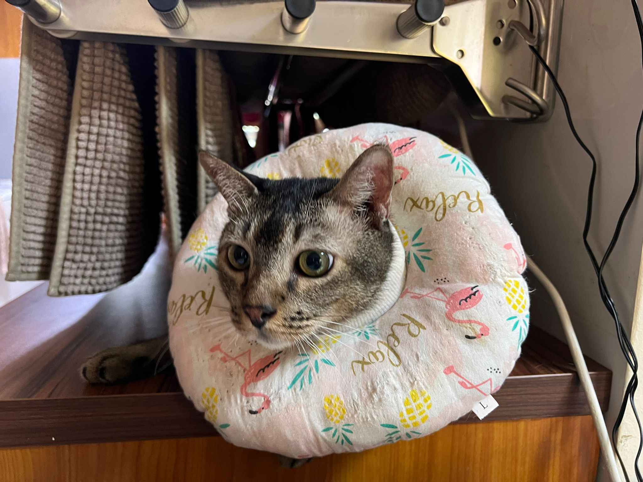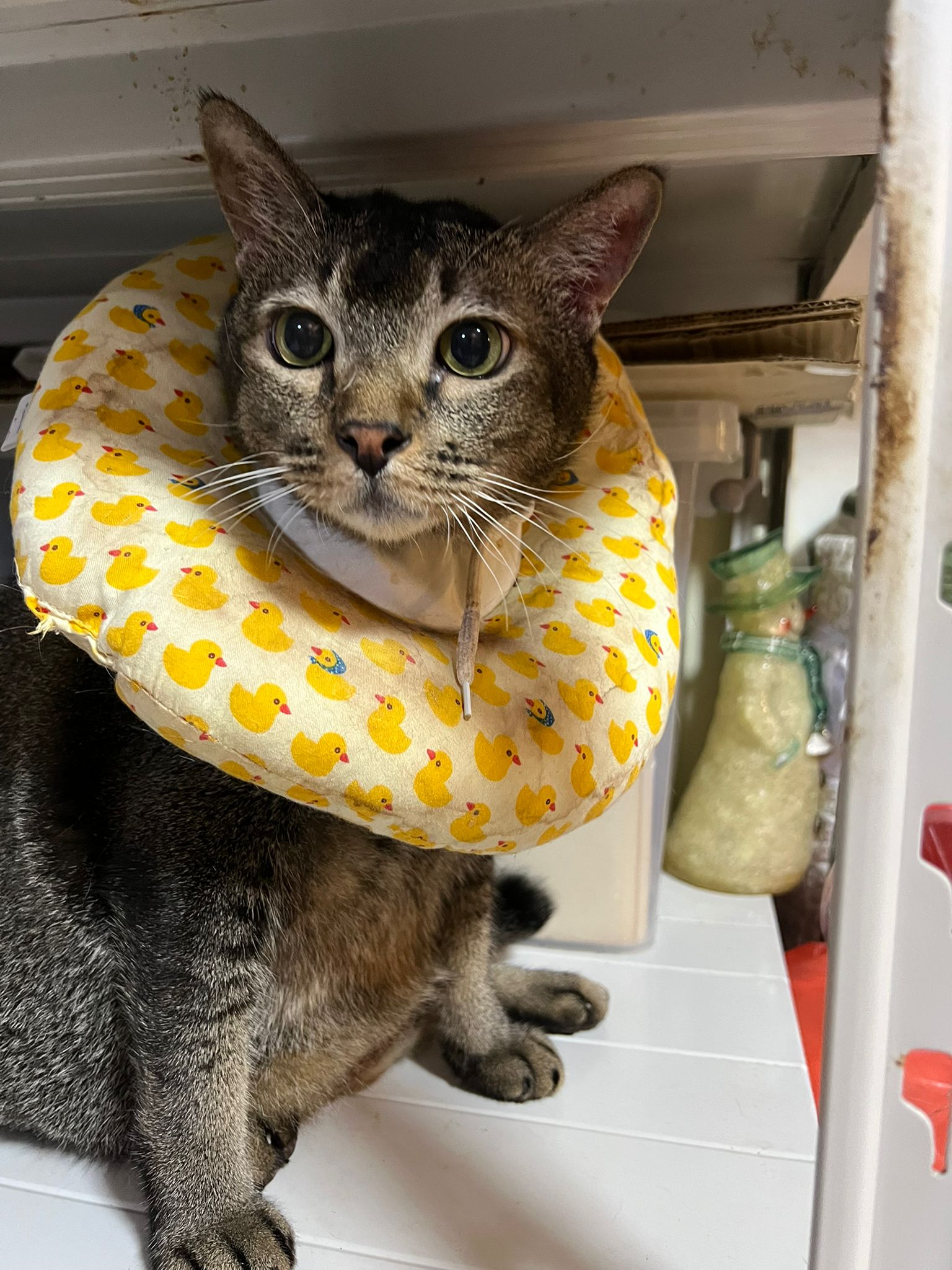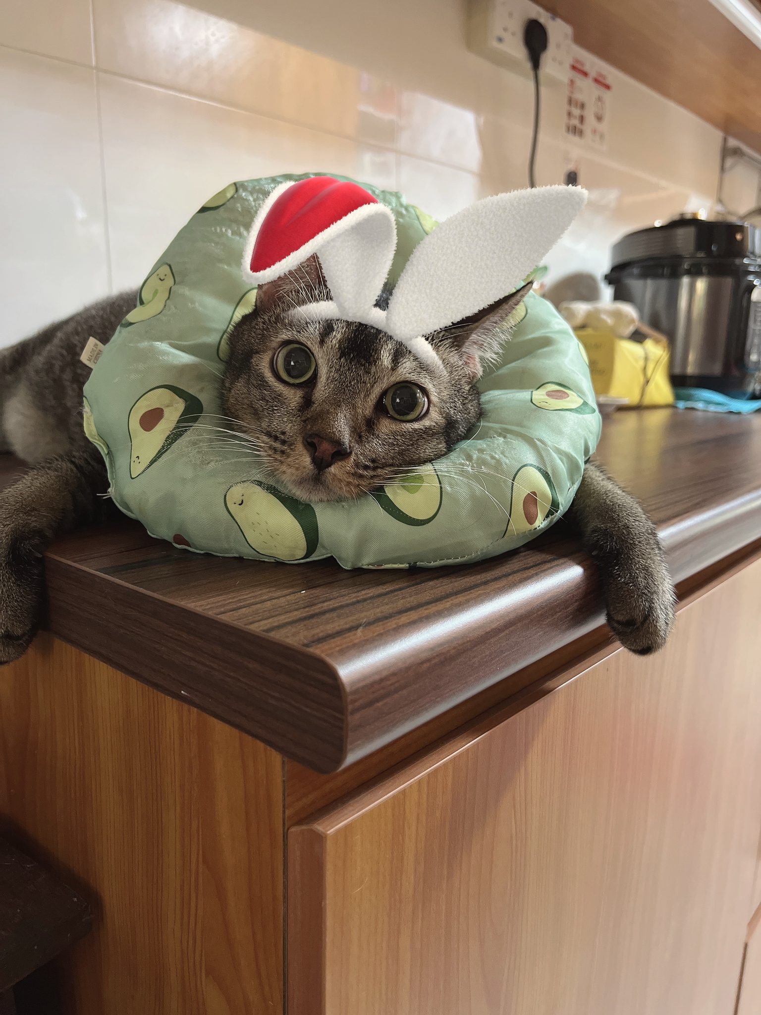 Rufus- probiotics given – ha he hide behind the kitchen cabinet I pull out n he come out.