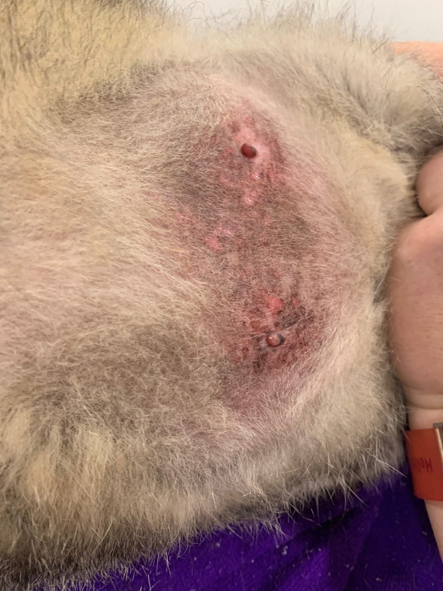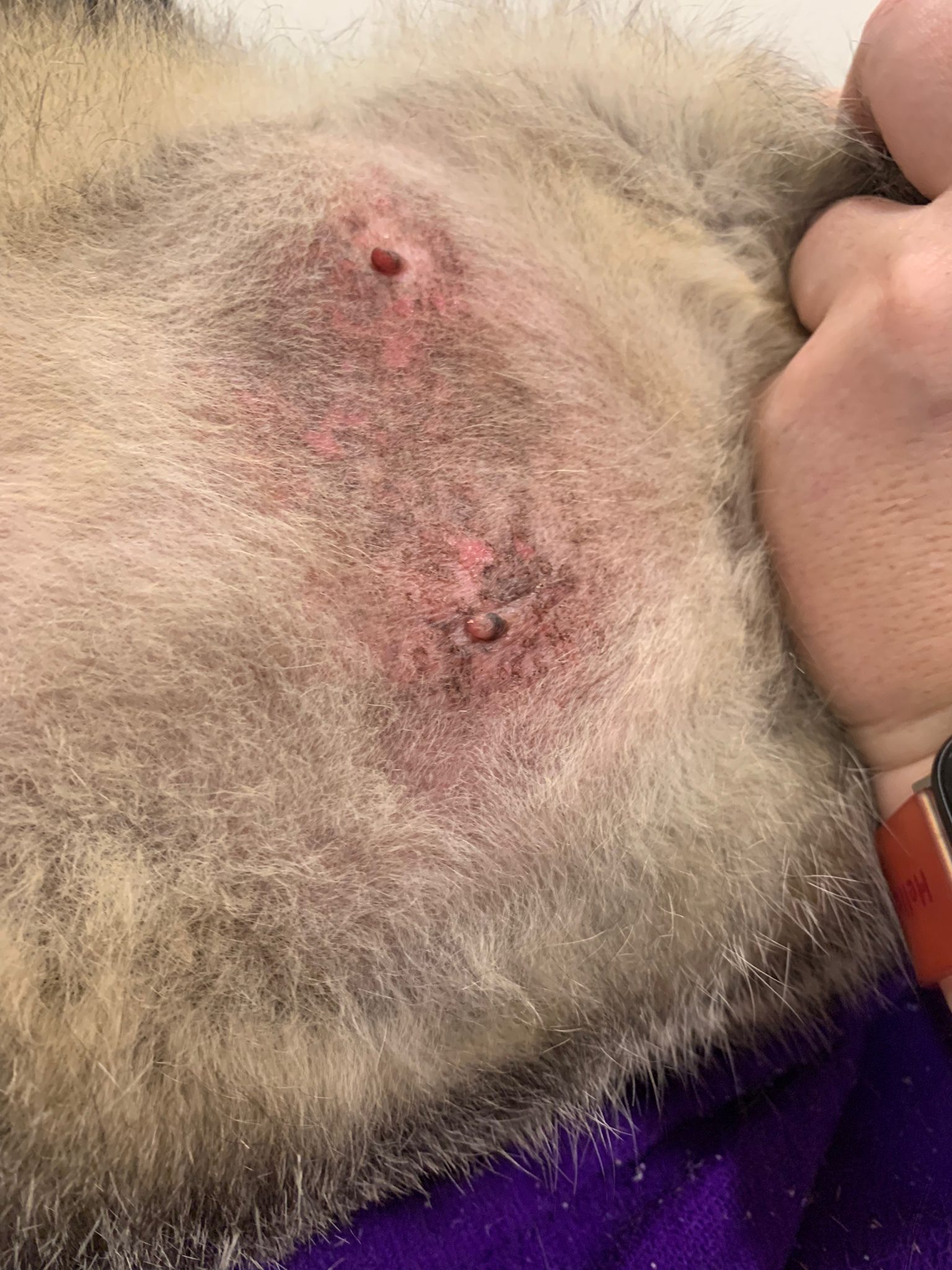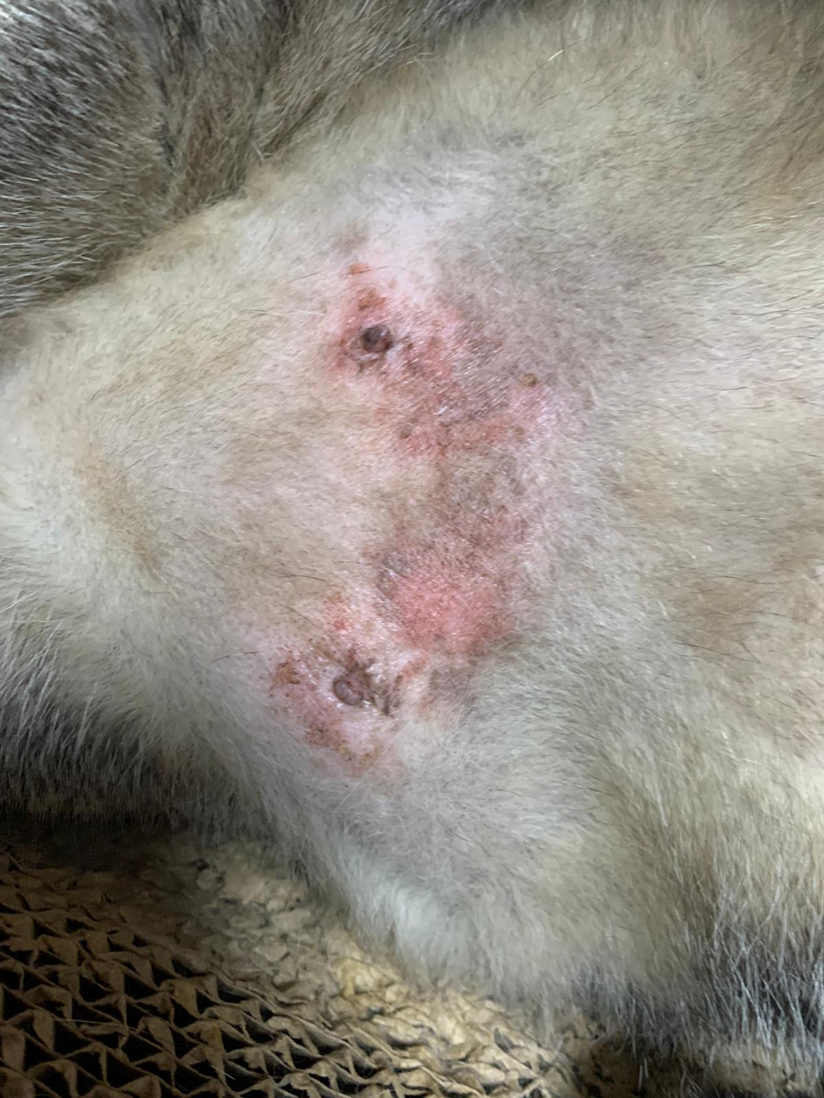 Information given by mummy: “got rashes since 2 years. He licks until it’s bald. Eating drinking – way more. Vomit almost daily. Eat fast. Don’t eat kibble and if he hungry will eat kibble and vomit. and Diarrhoea almost every other day.”