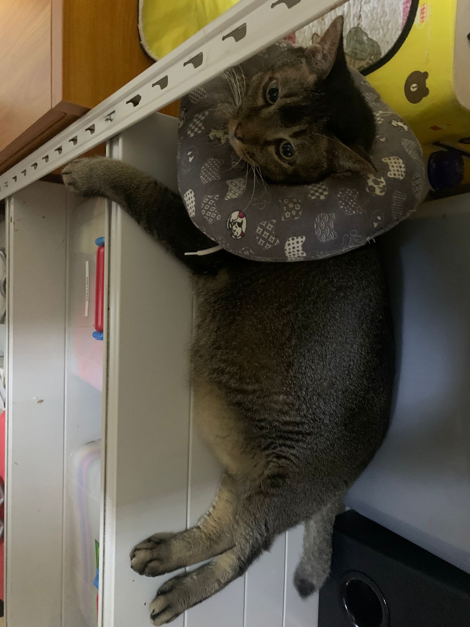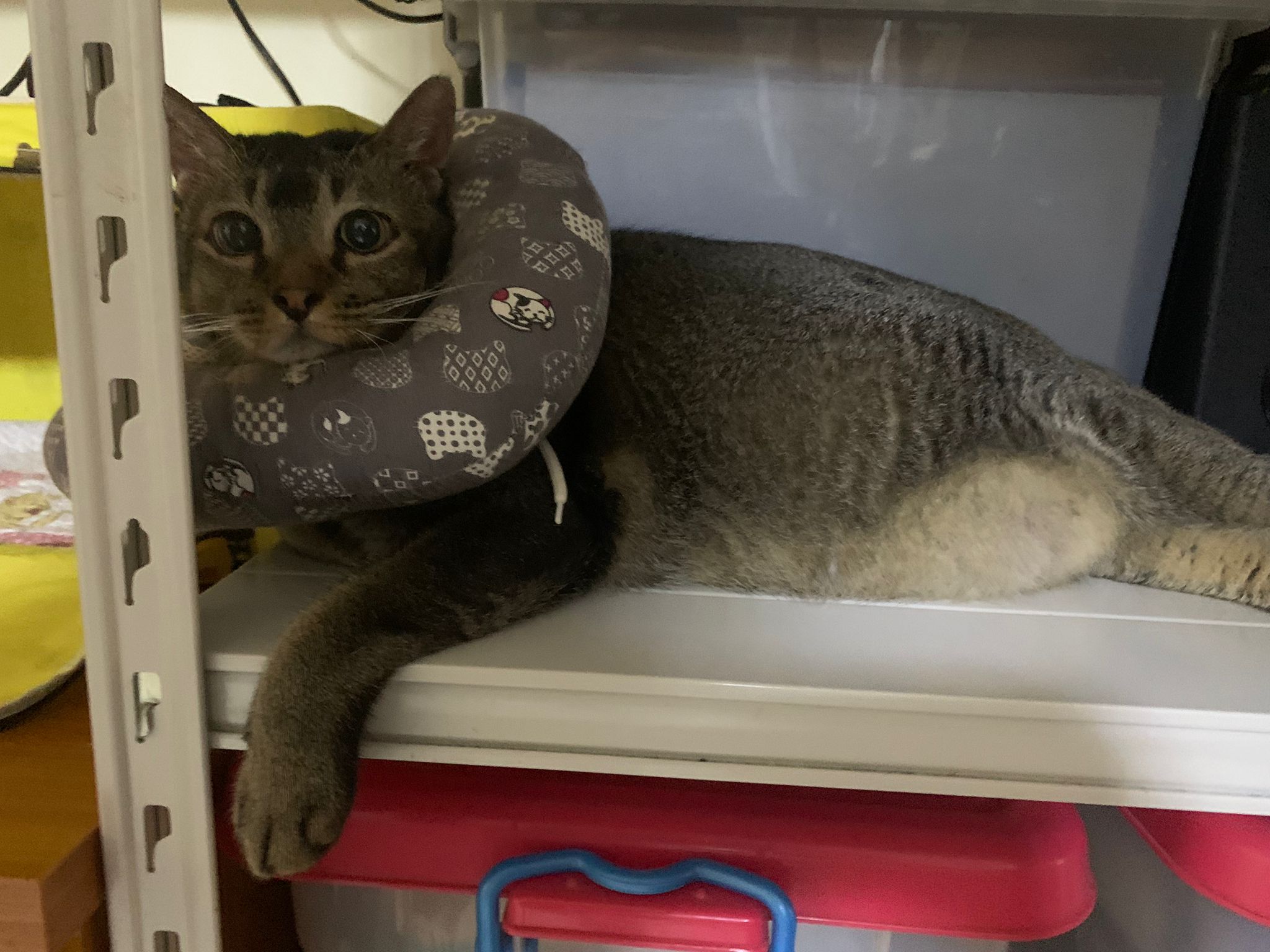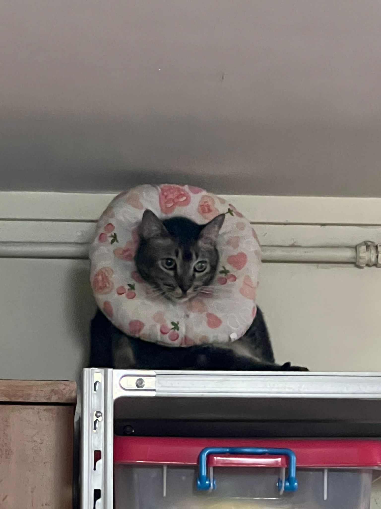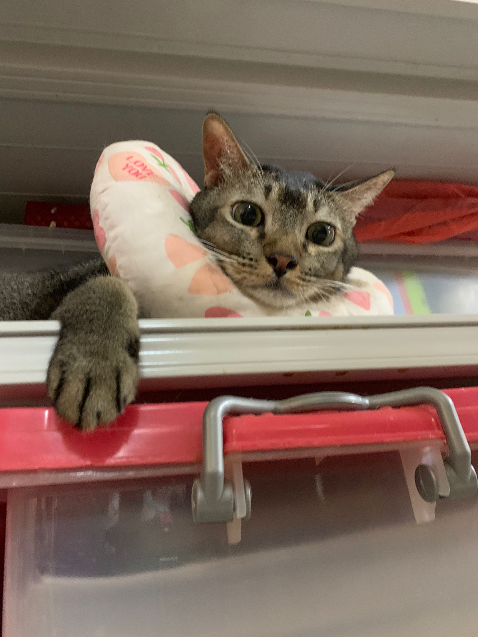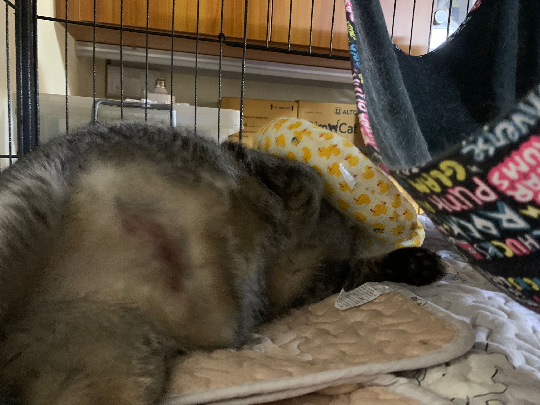 10pm+: up there on top of the metal cabinet sleeping. Didn’t wake up at all. Tummy moving.