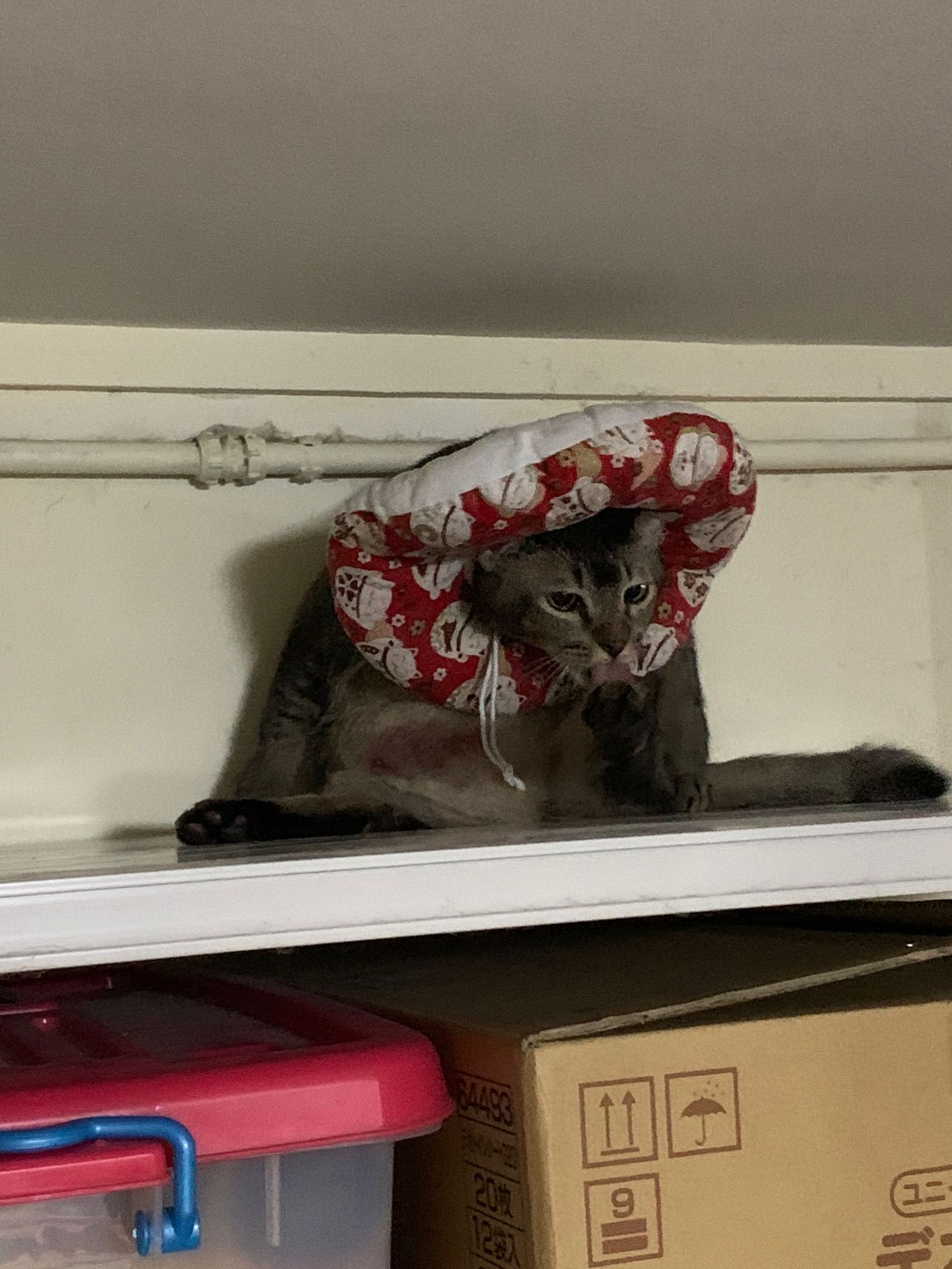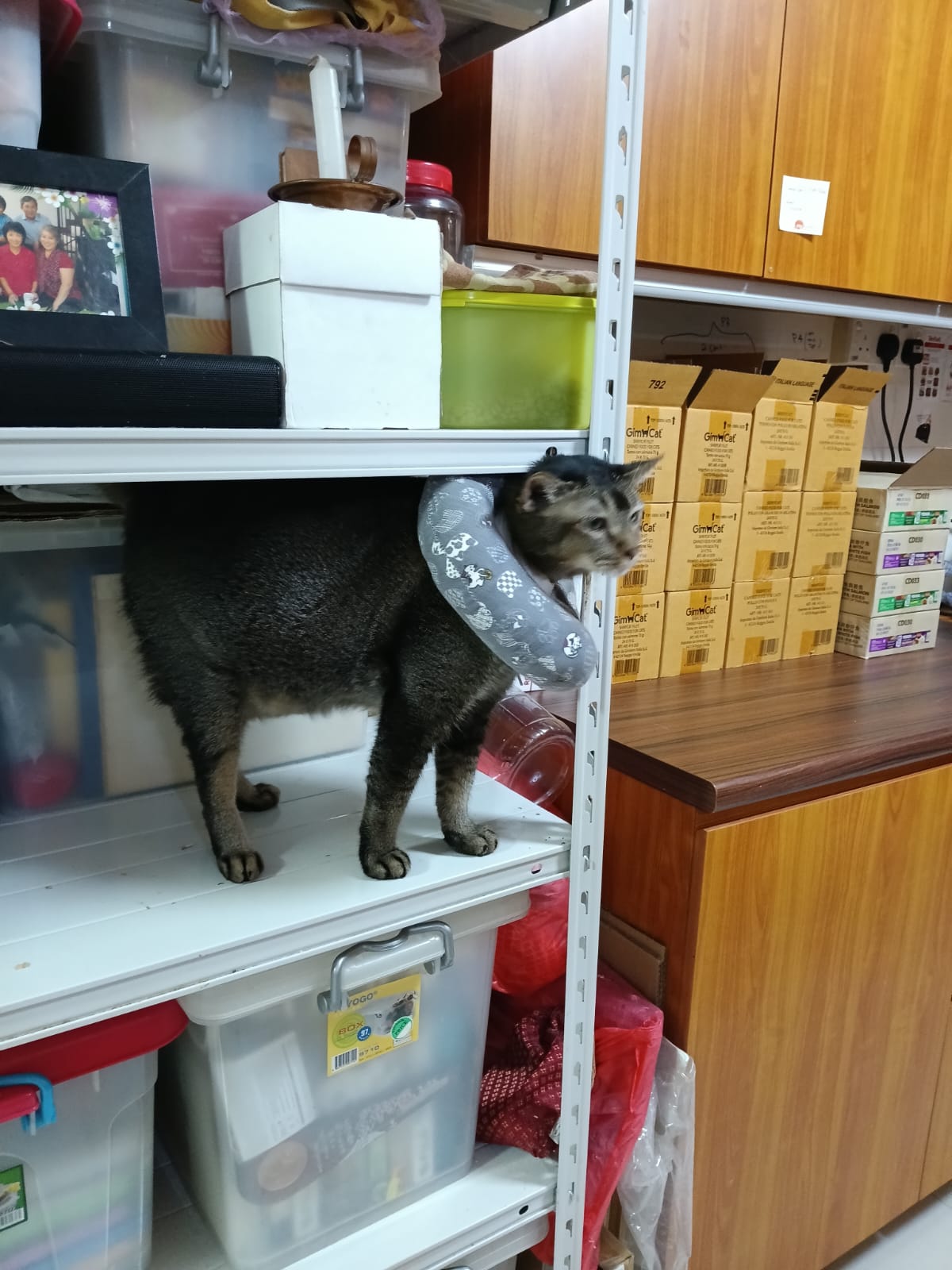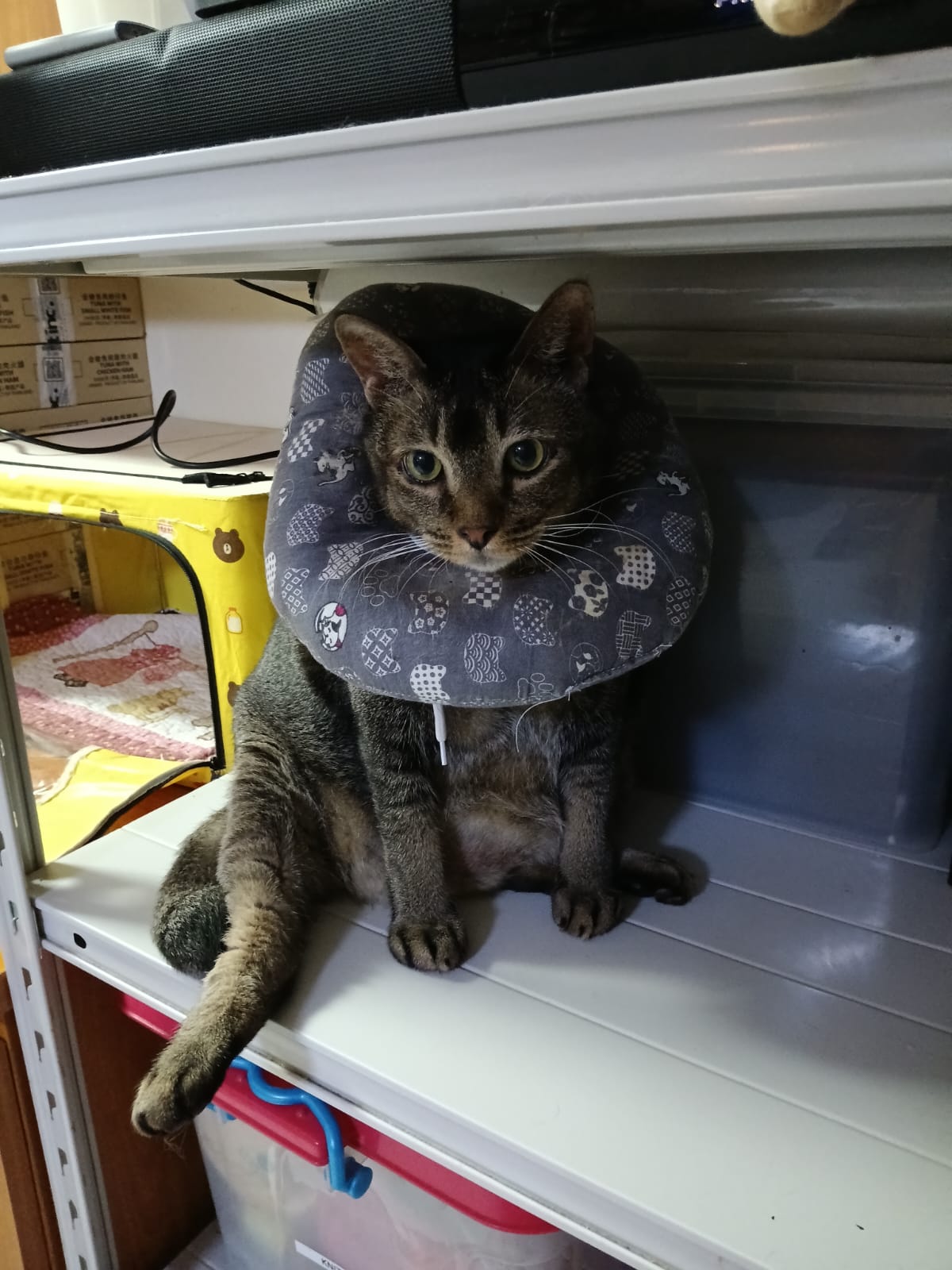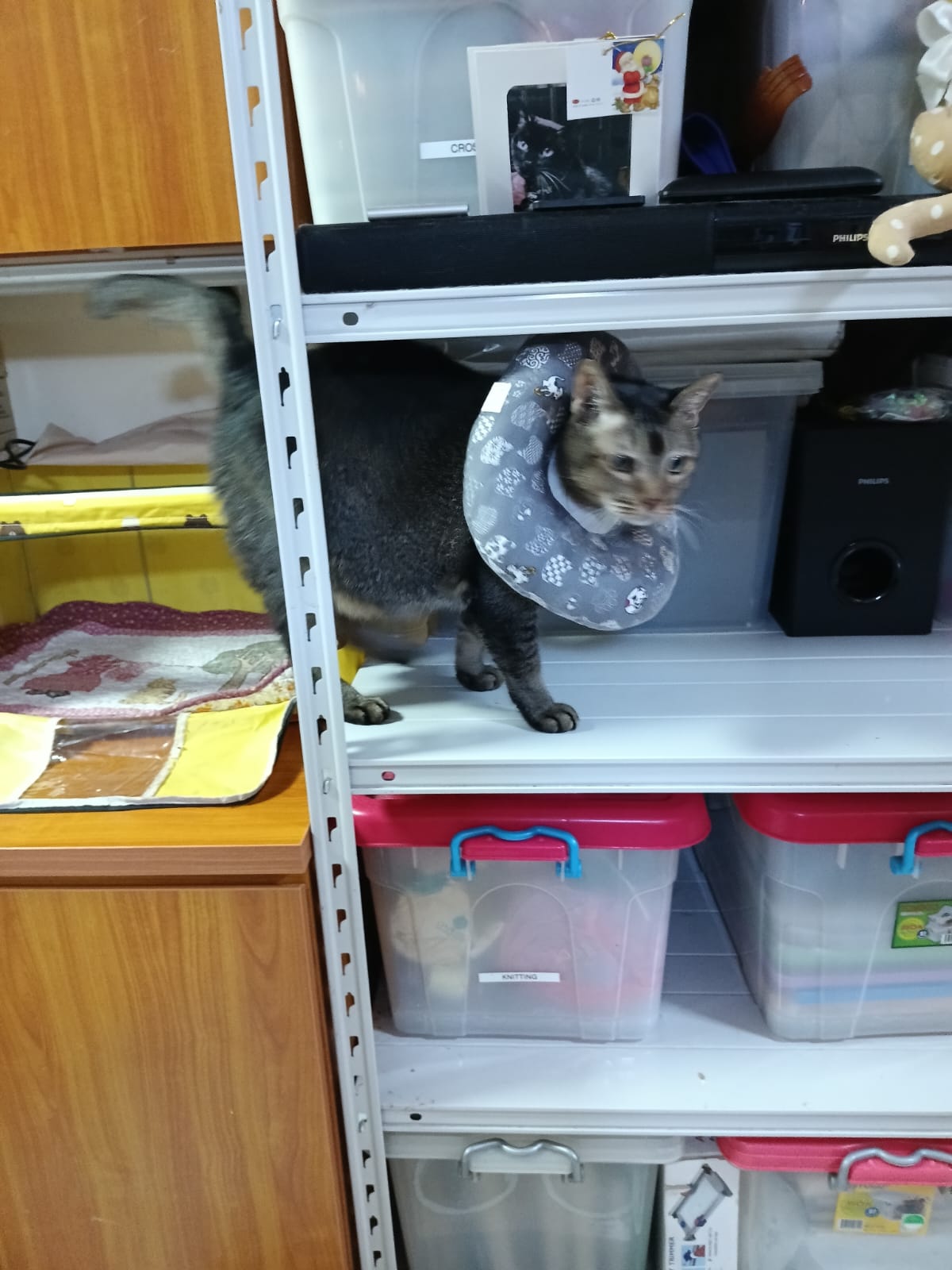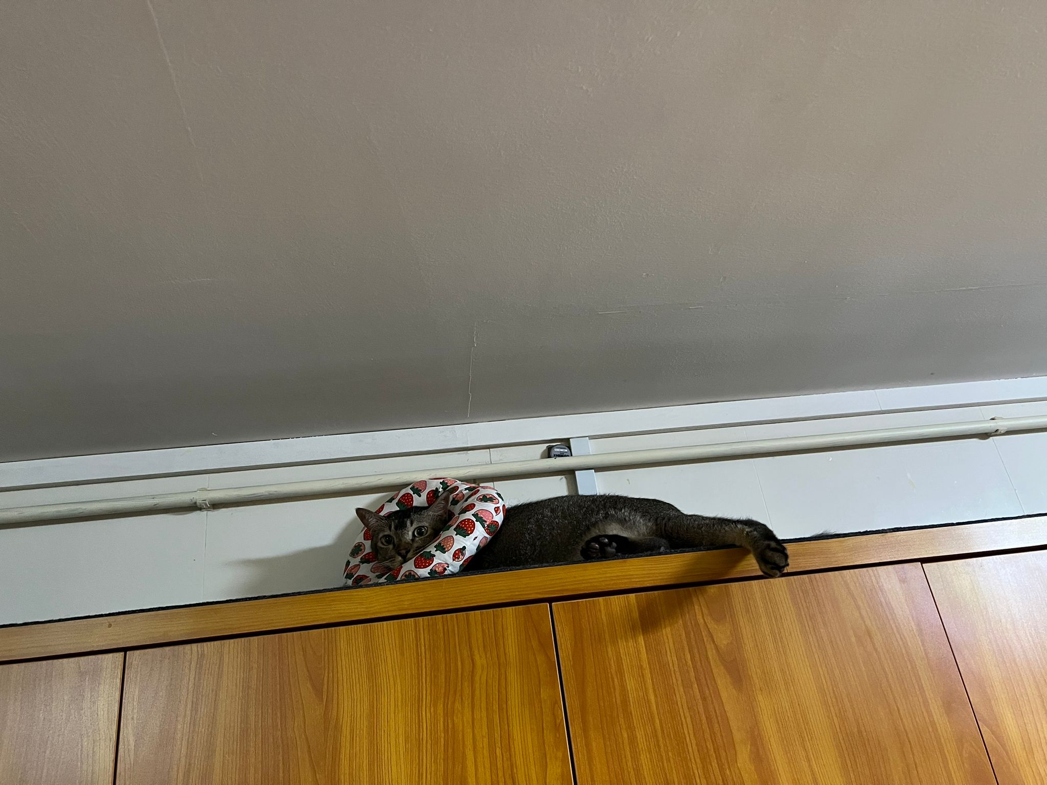 10pm+: up there on top of the metal cabinet sleeping. Didn’t wake up at all. Tummy moving.