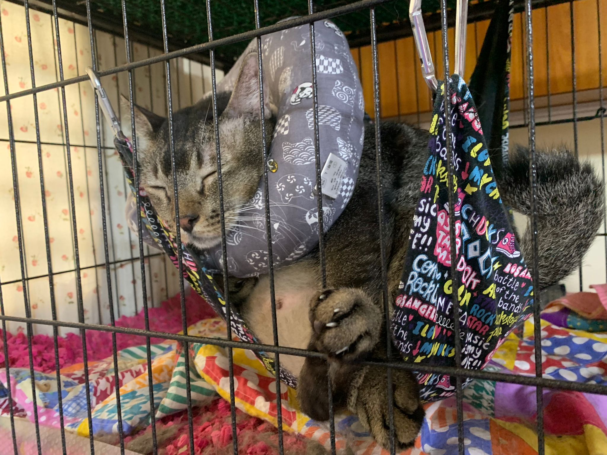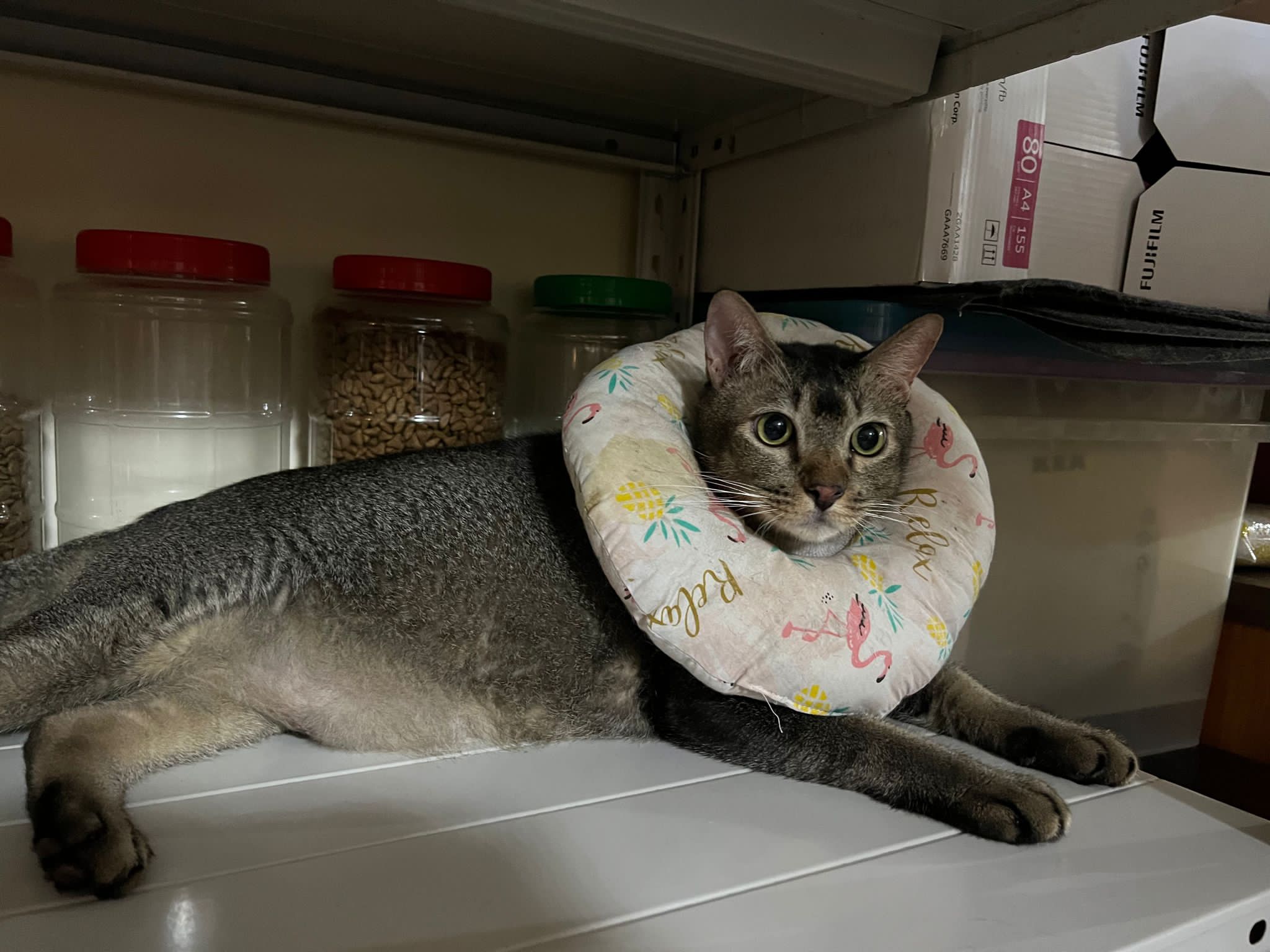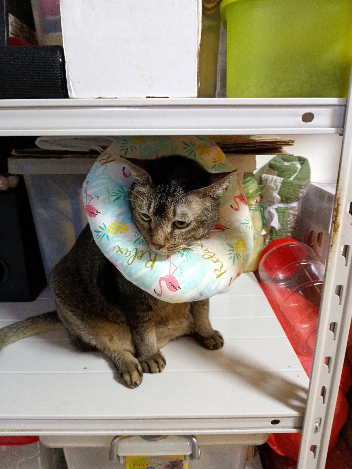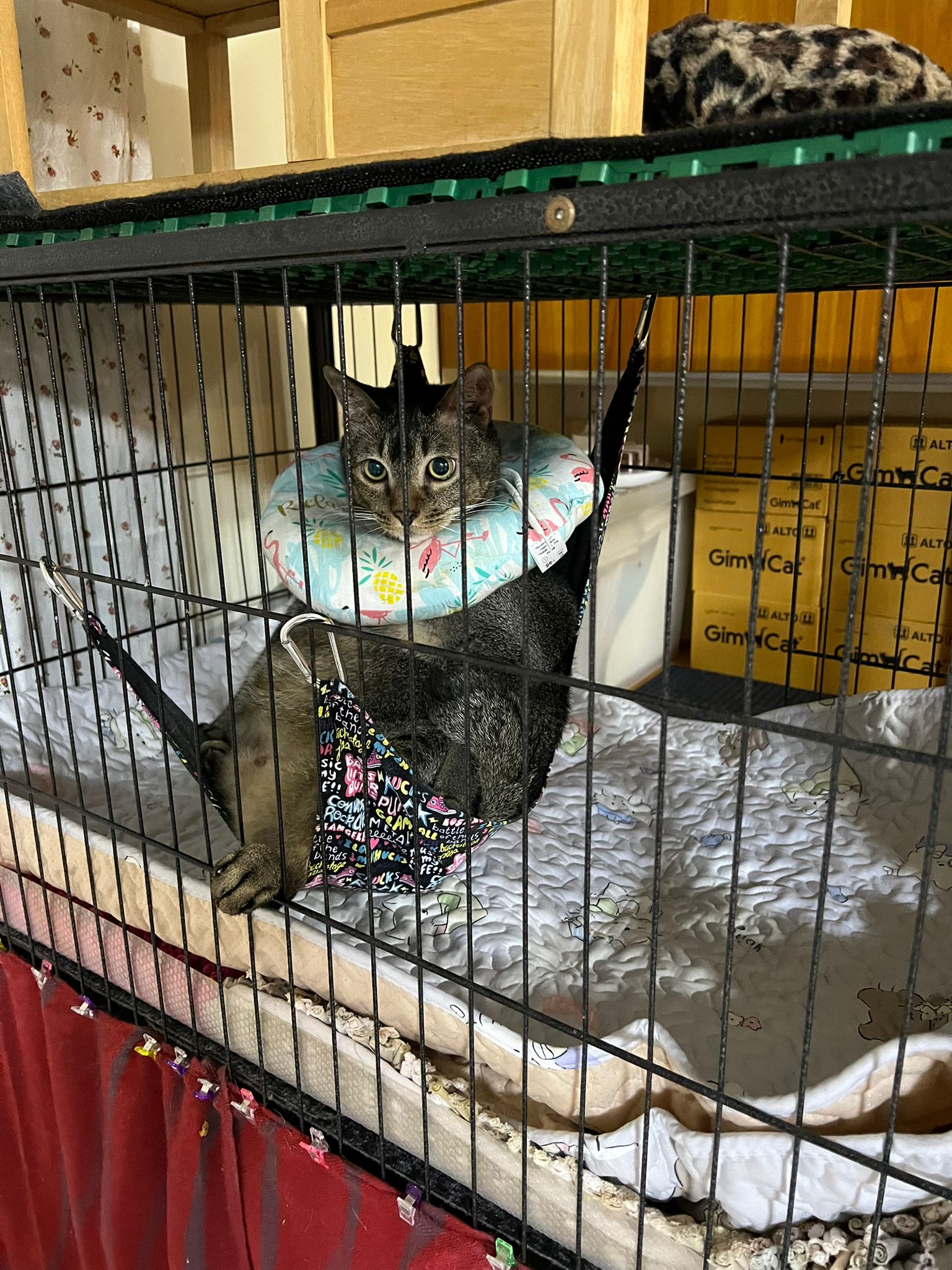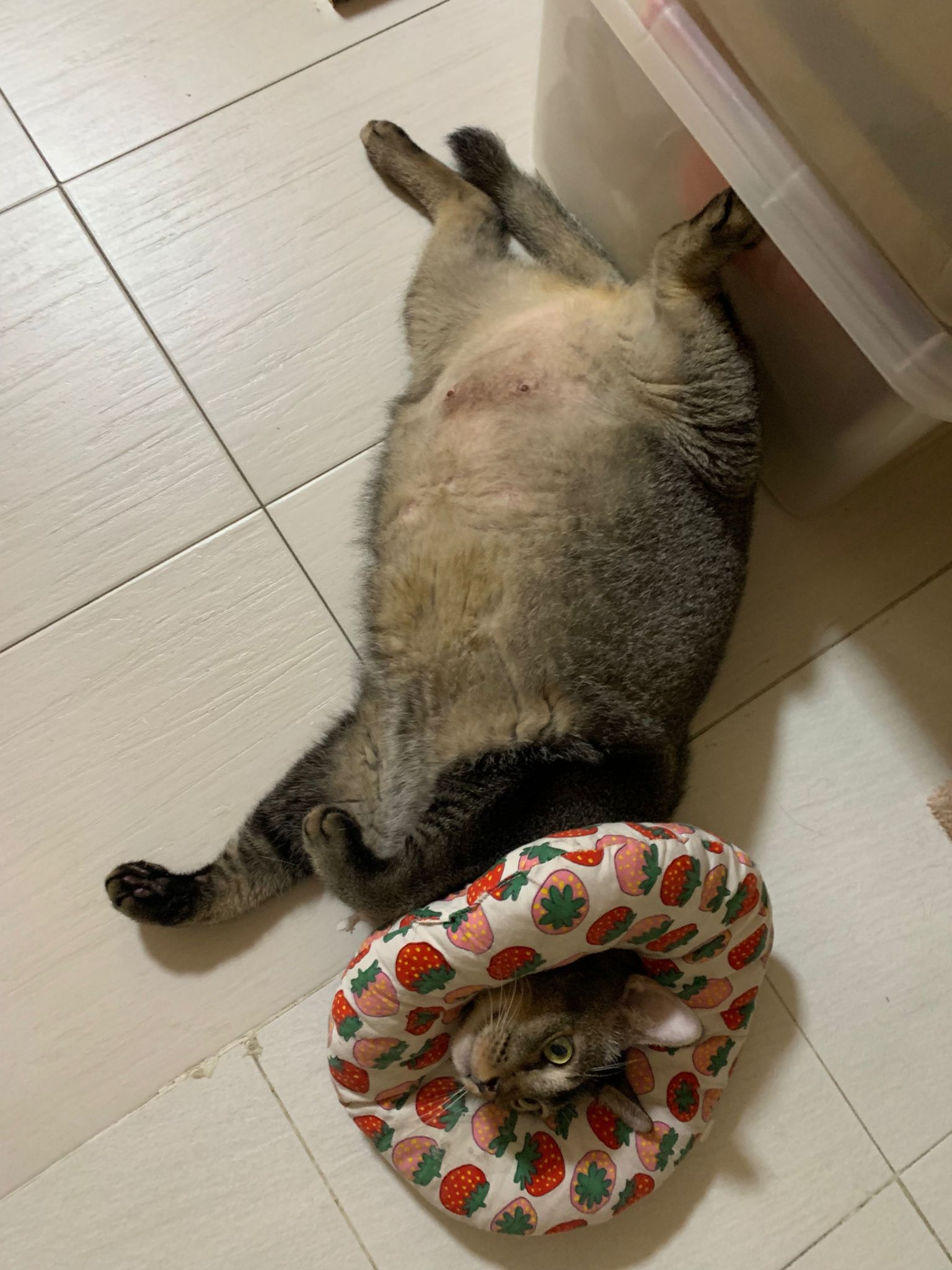 10pm+: up there on top of the metal cabinet sleeping. Didn’t wake up at all. Tummy moving.