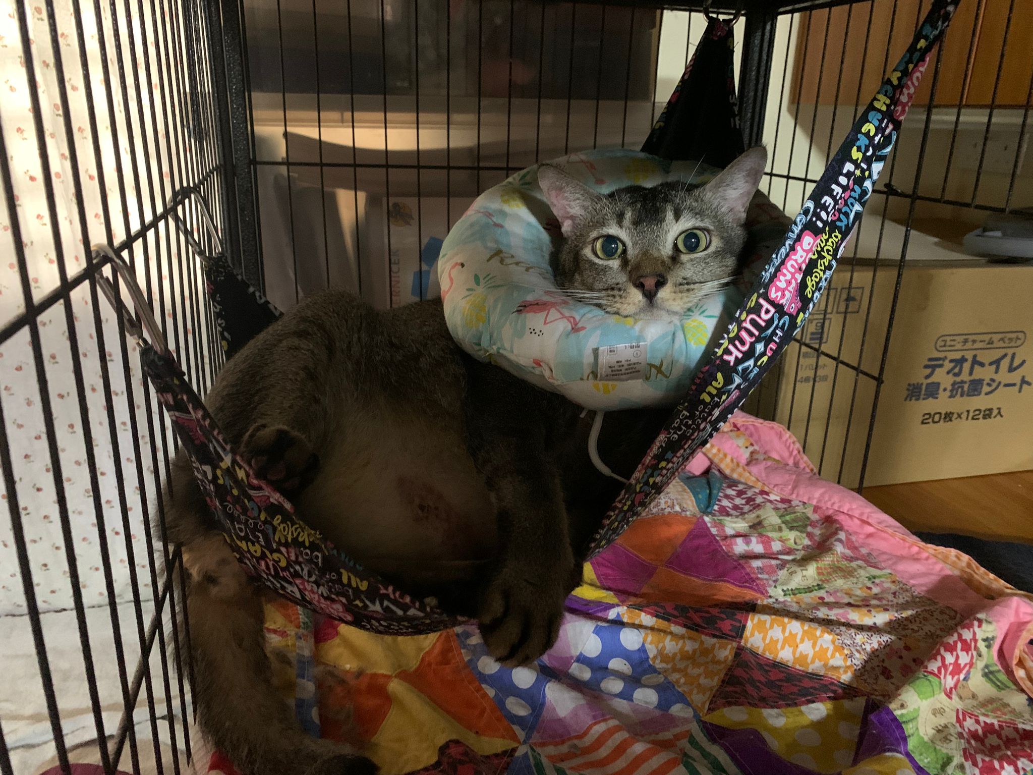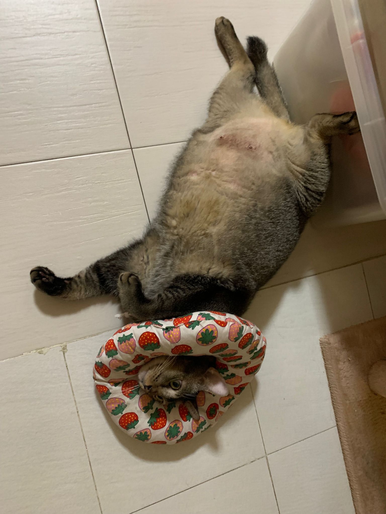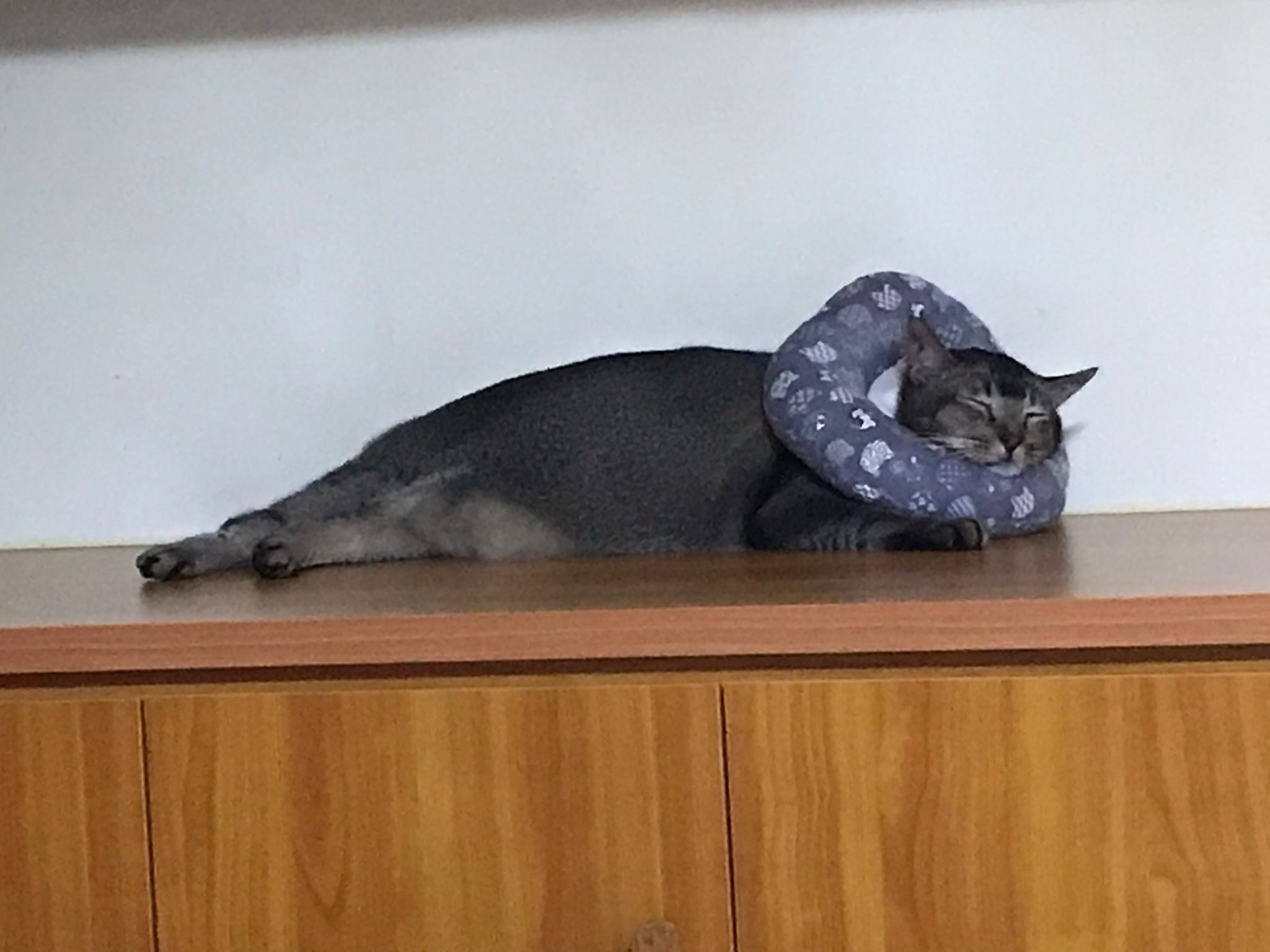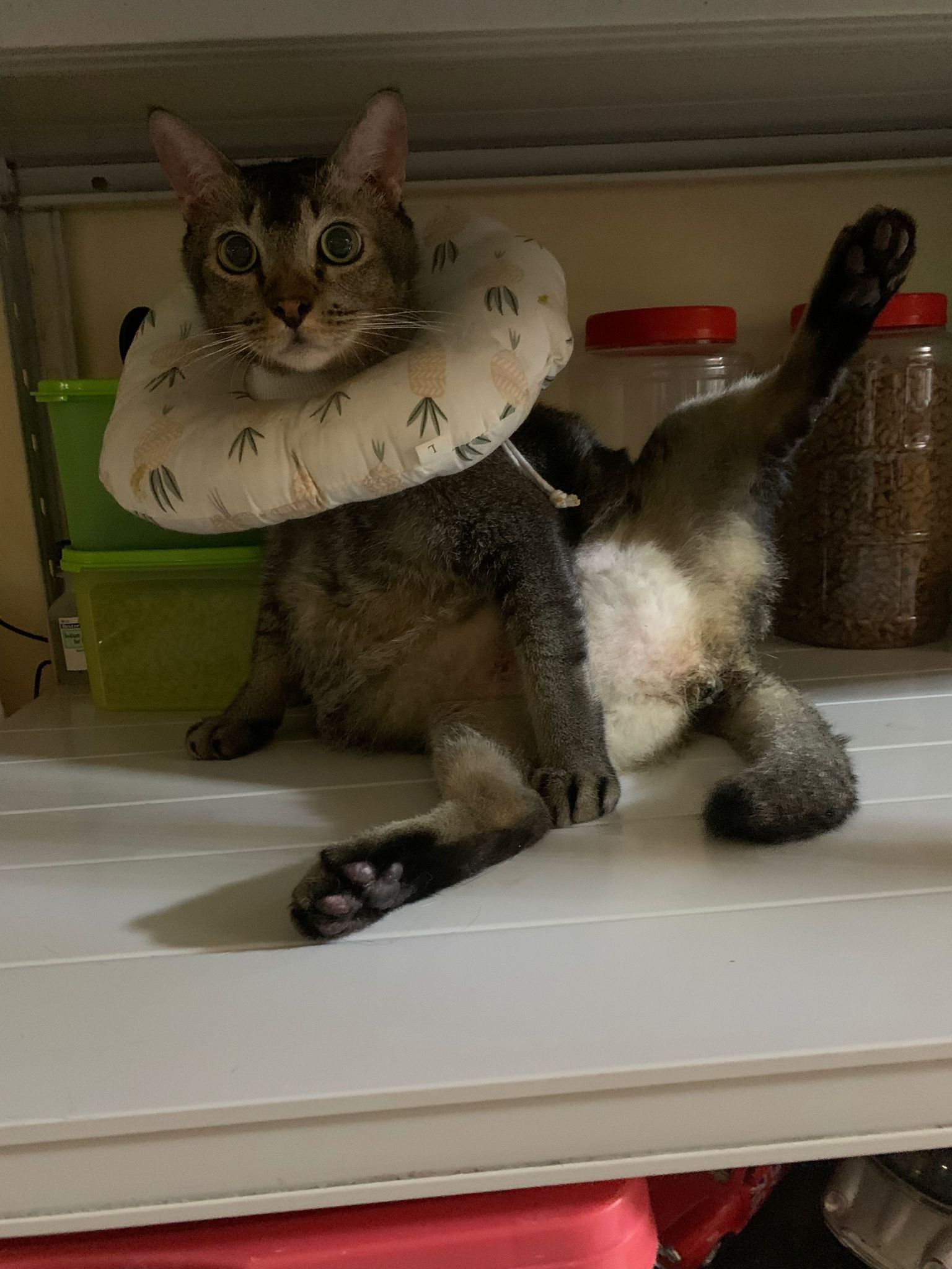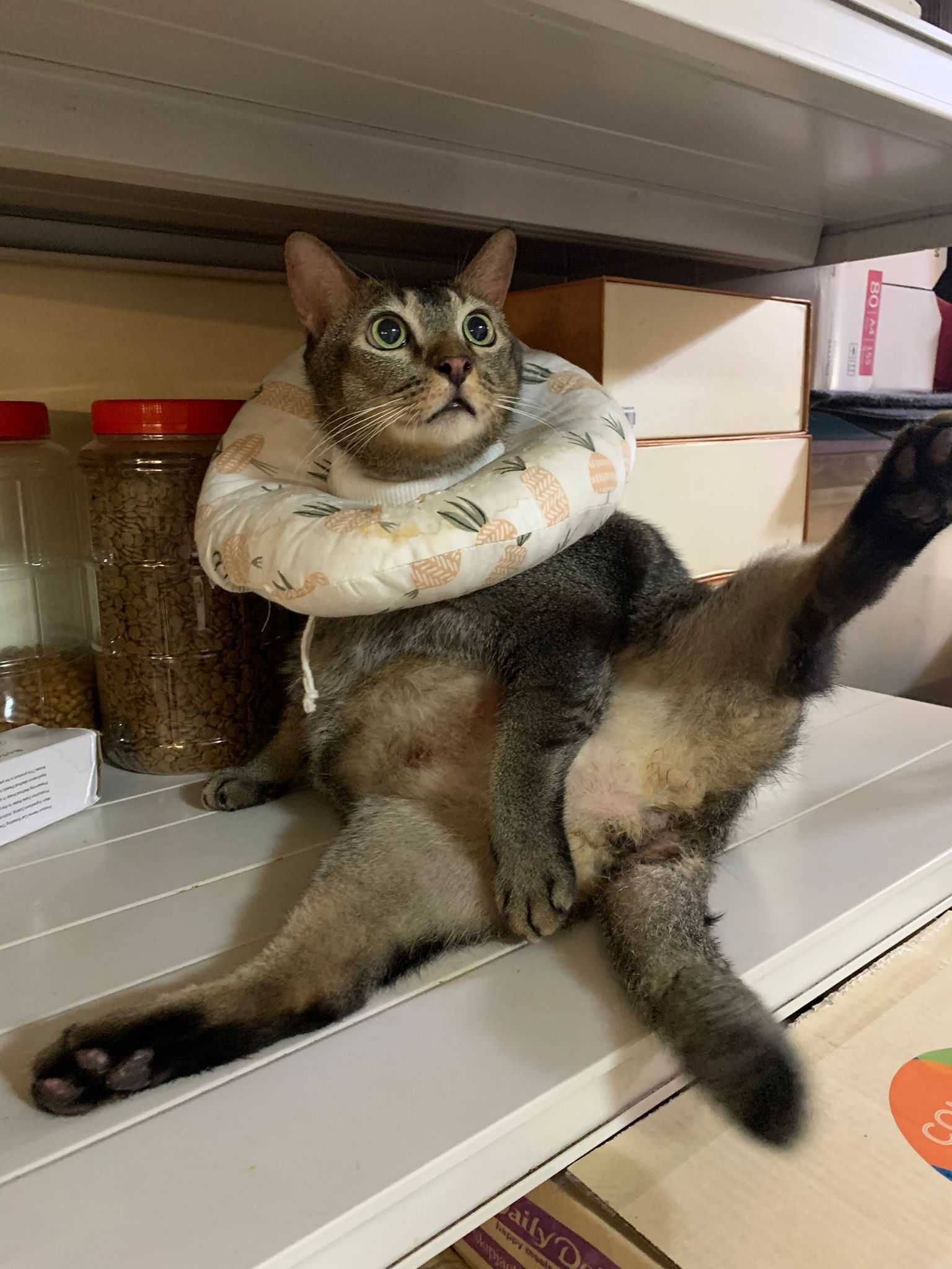 10pm+: up there on top of the metal cabinet sleeping. Didn’t wake up at all. Tummy moving.