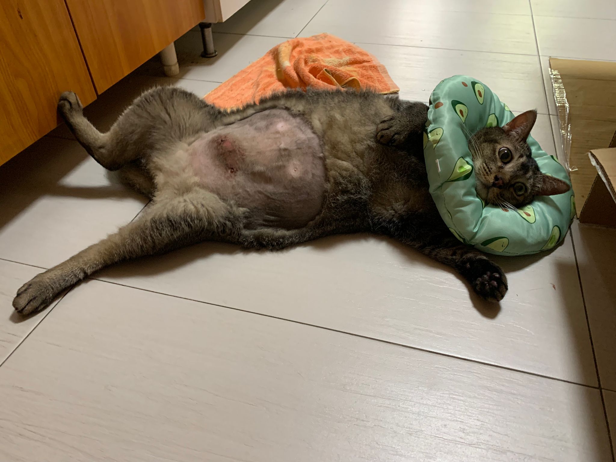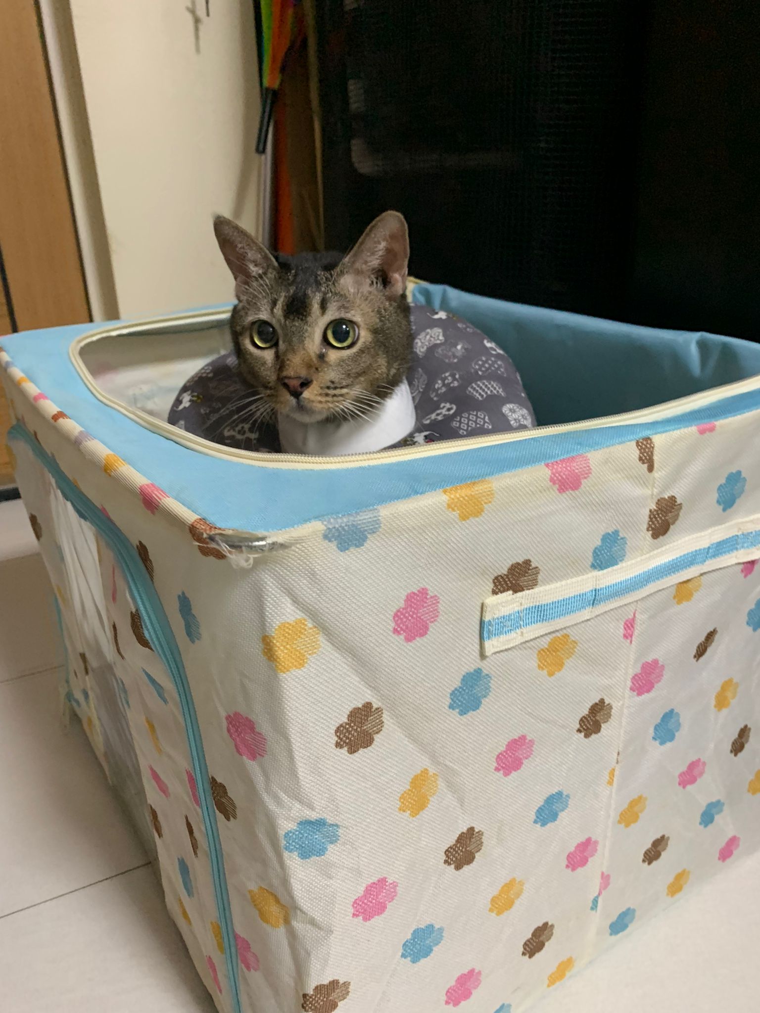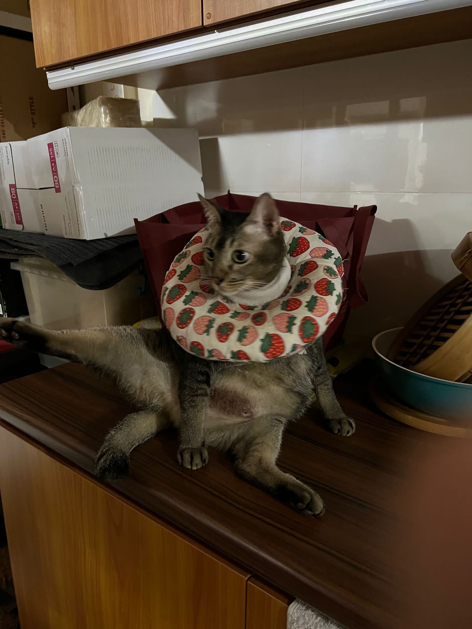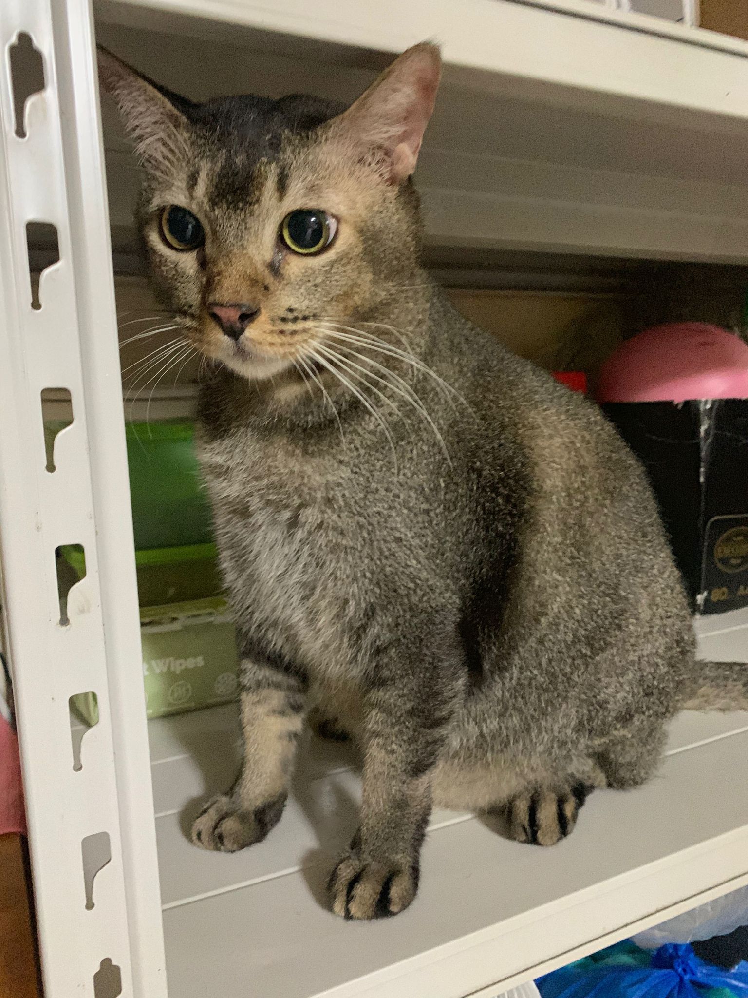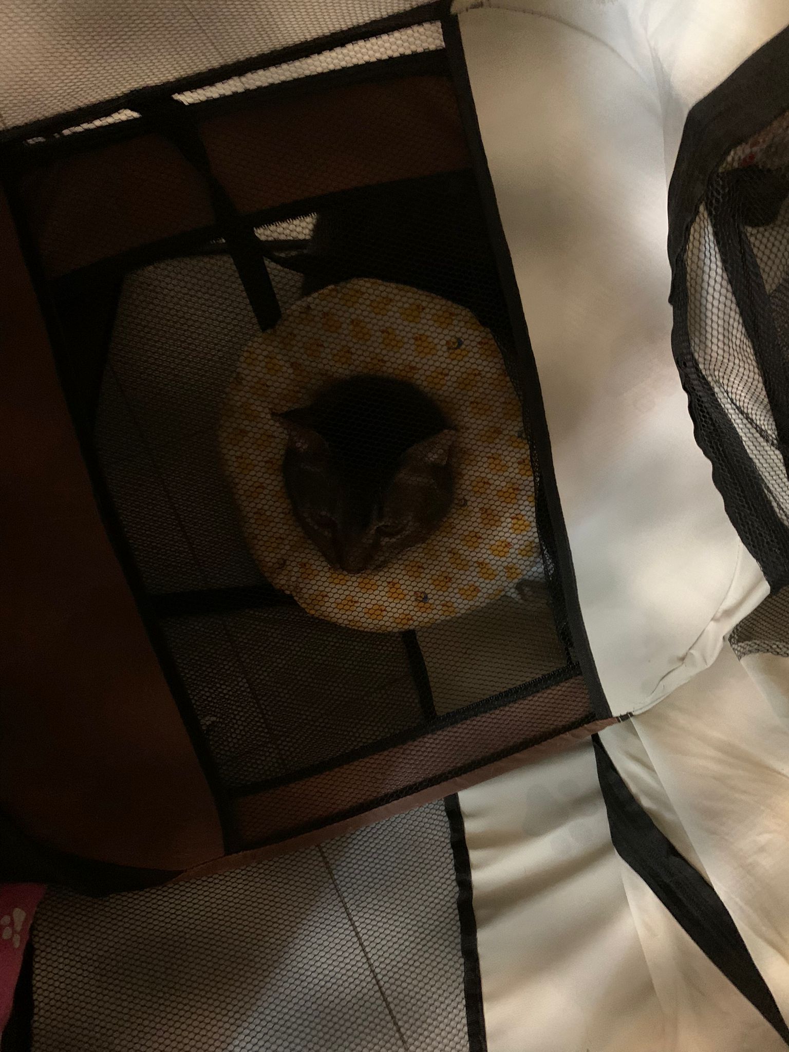 10pm+: up there on top of the metal cabinet sleeping. Didn’t wake up at all. Tummy moving.