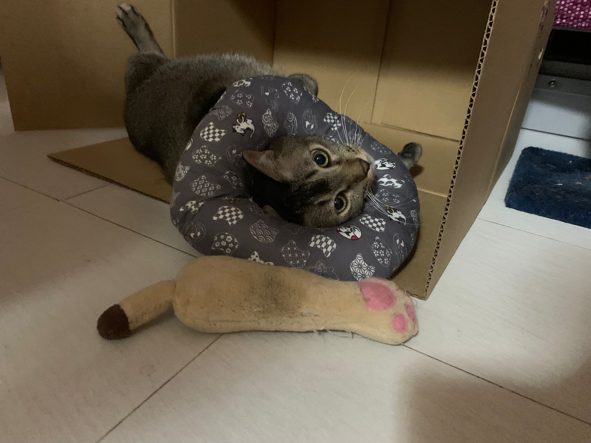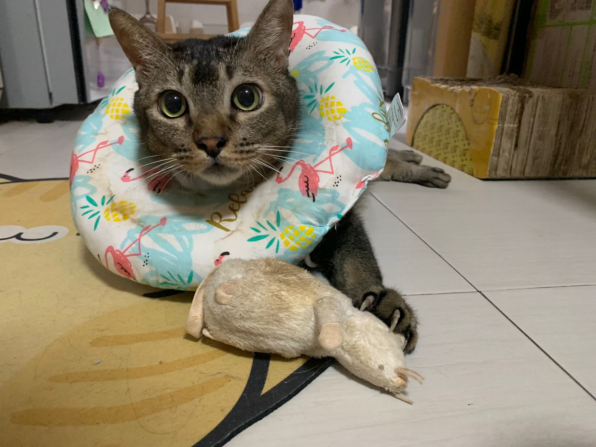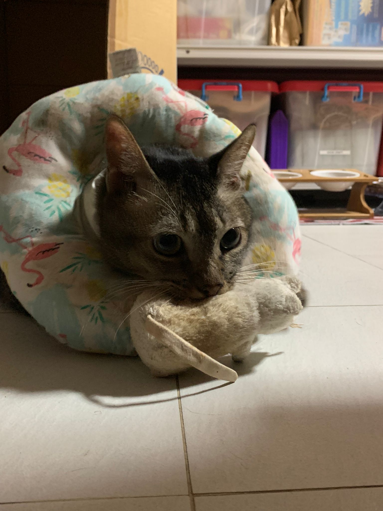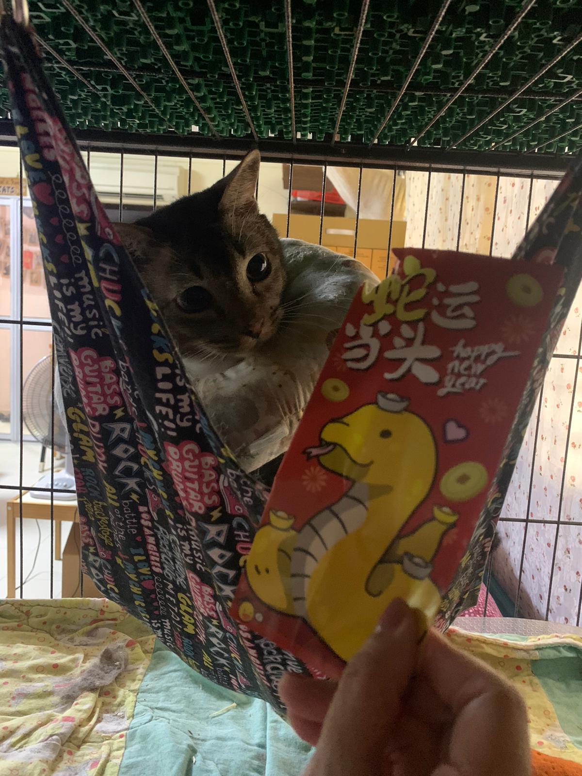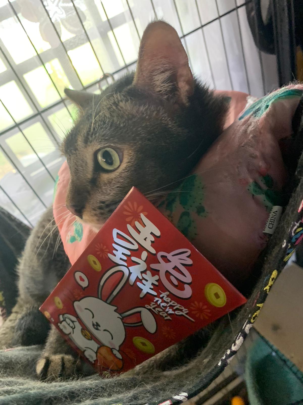 A cat i know years ago when his mama go holiday. Befriended 猫房 cats. He got a cute little mouse which is his fav toy.