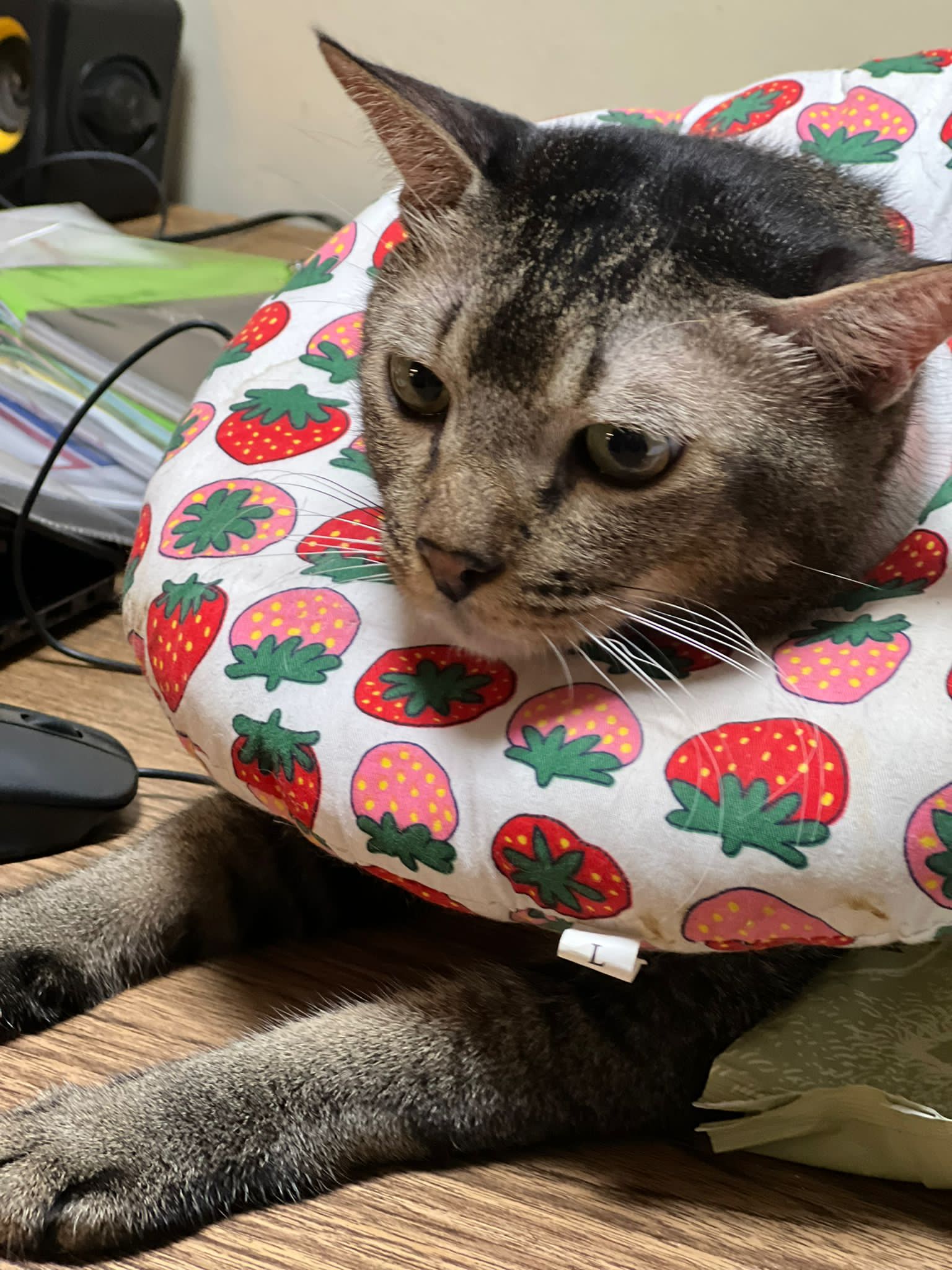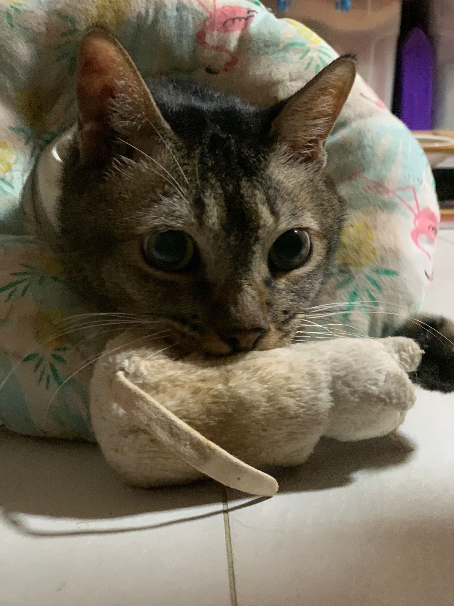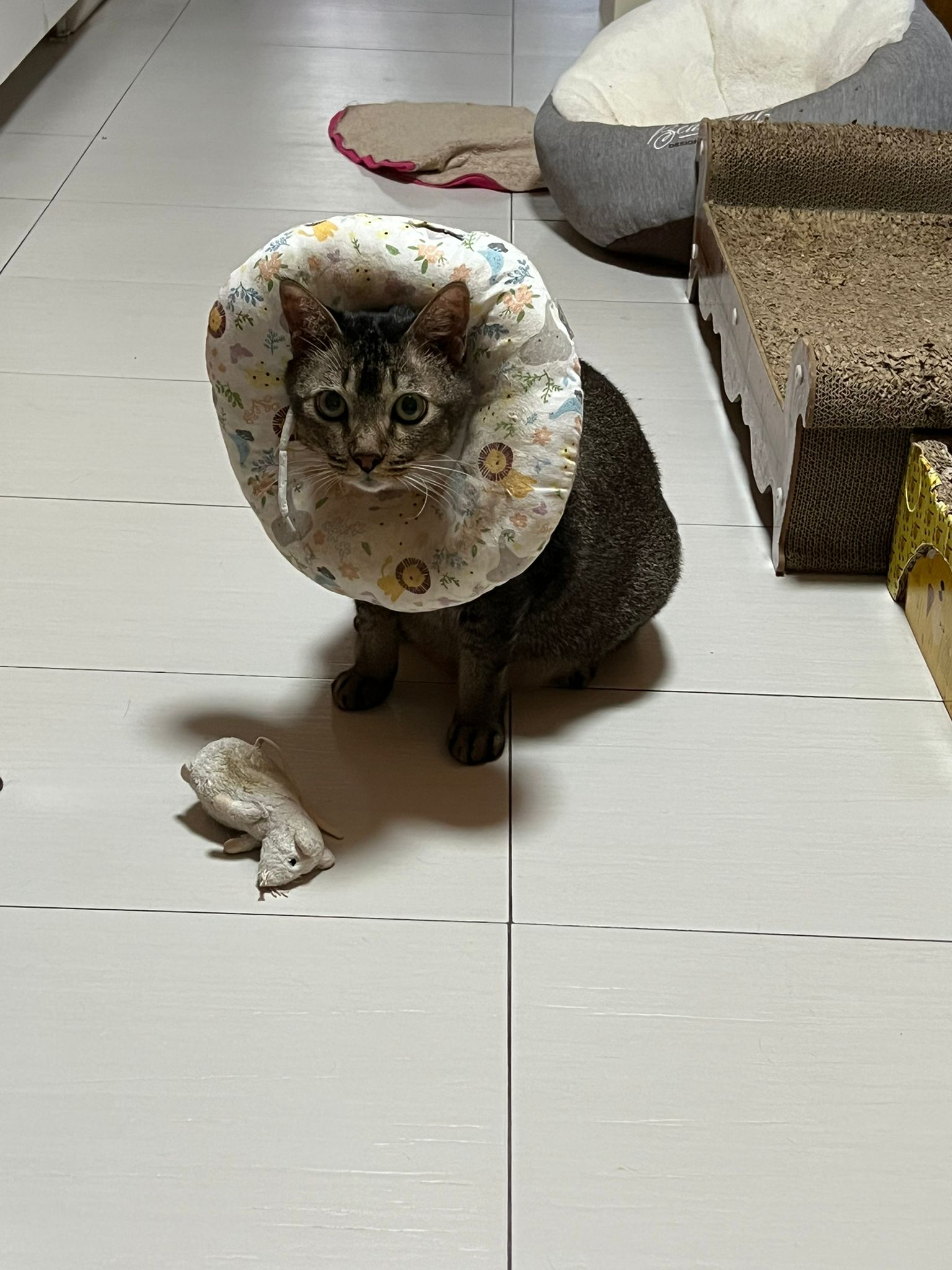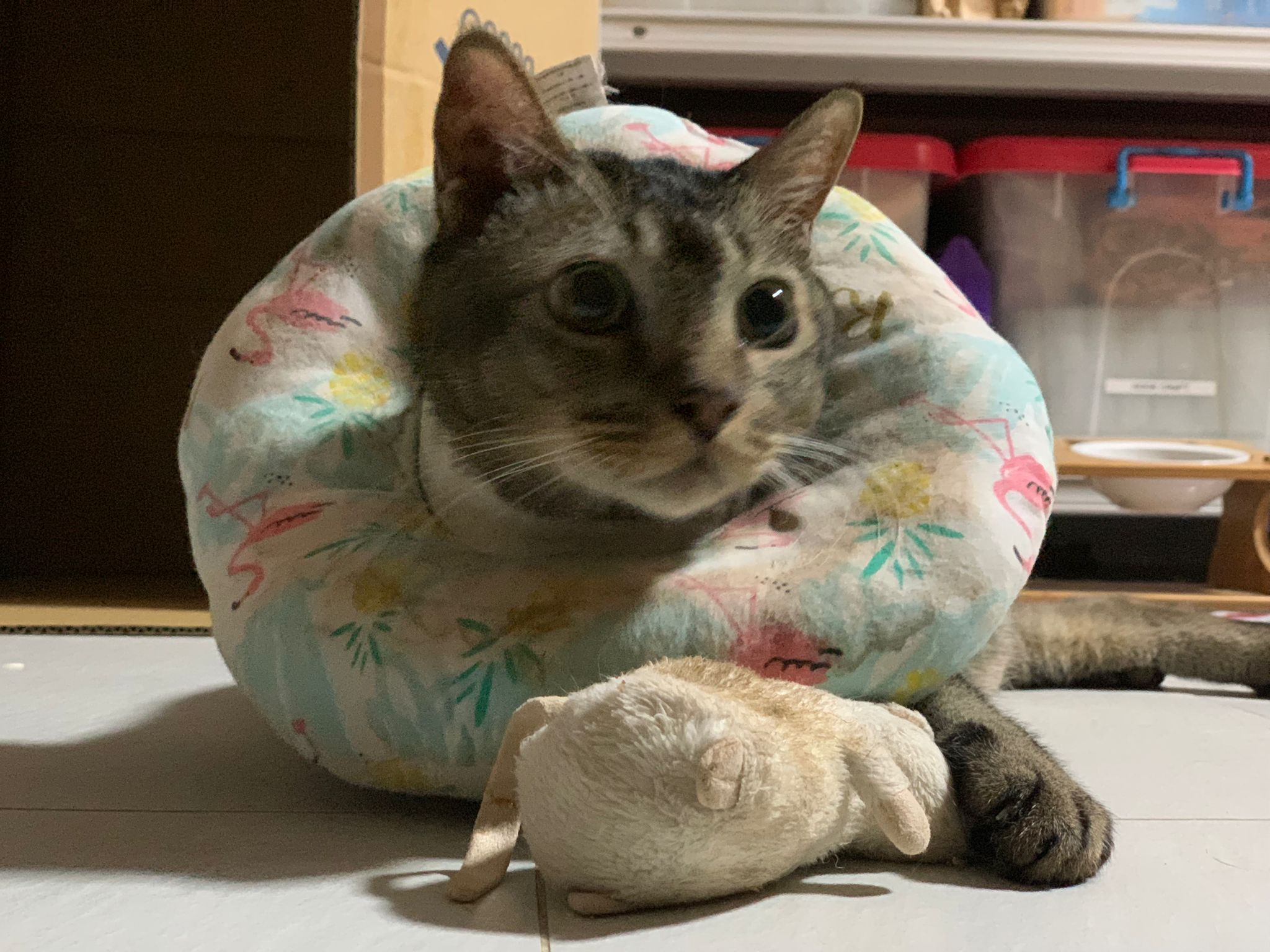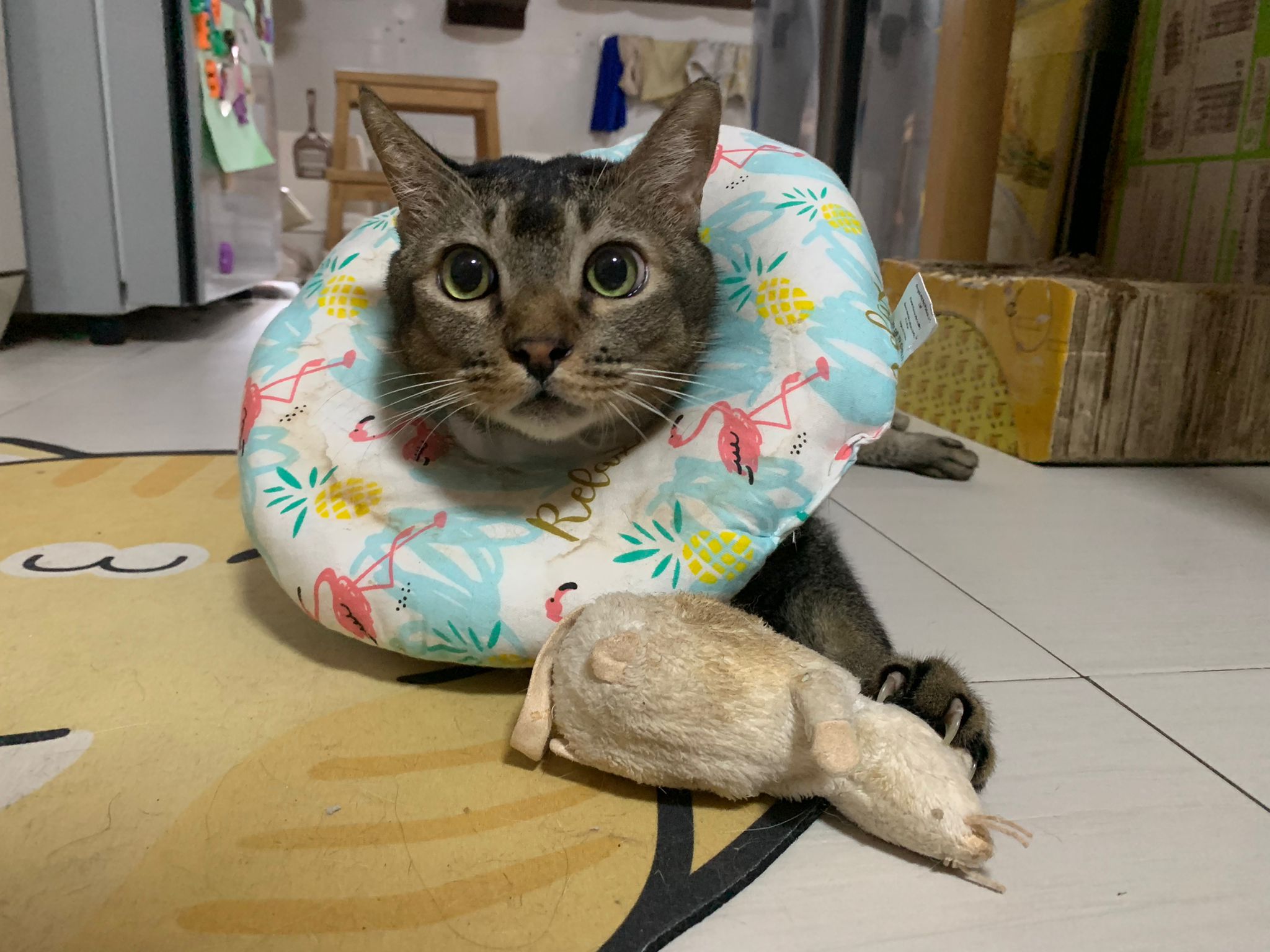 A cat i know years ago when his mama go holiday. Befriended 猫房 cats. He got a cute little mouse which is his fav toy.