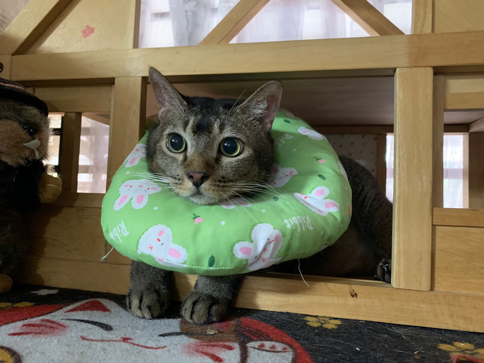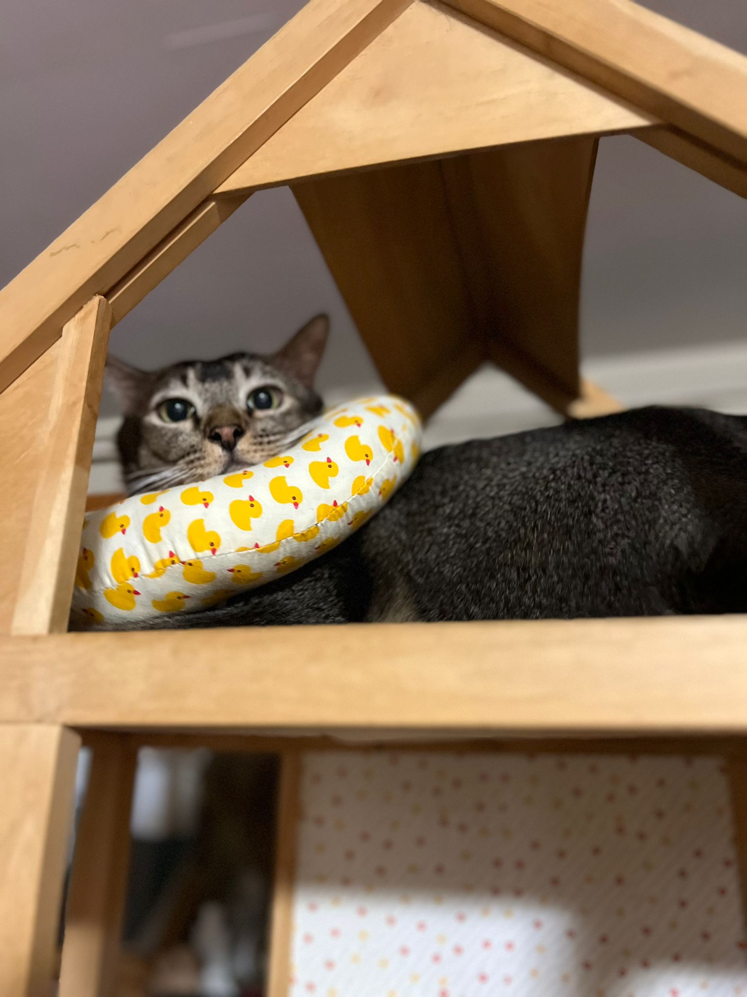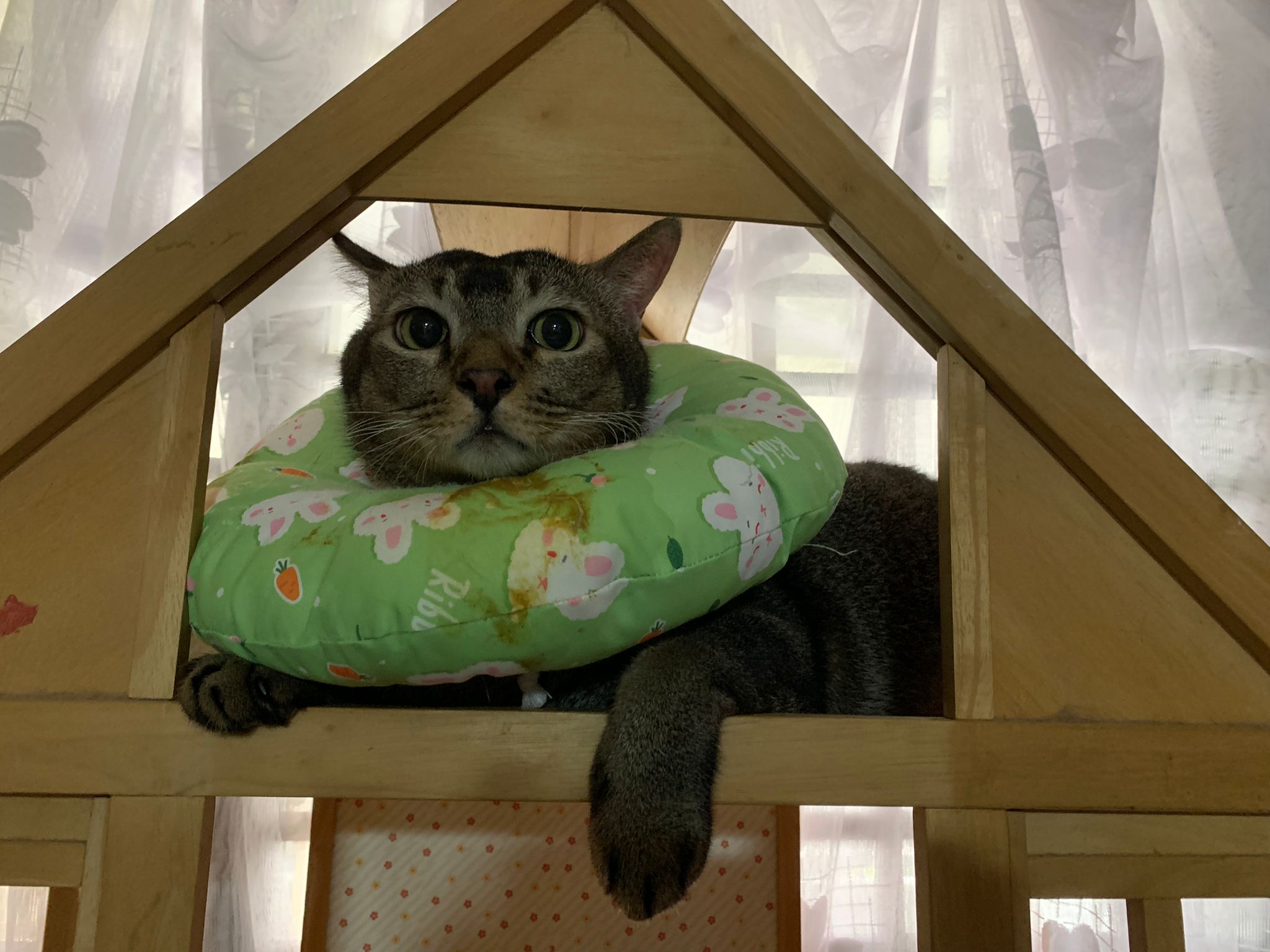 Got got point he is sitting soooo cute like having picnic on bench, so I play w him. Then he keep looking outside the house – I know someone is there – ha he is the telling me that 猫房 dryer box is here