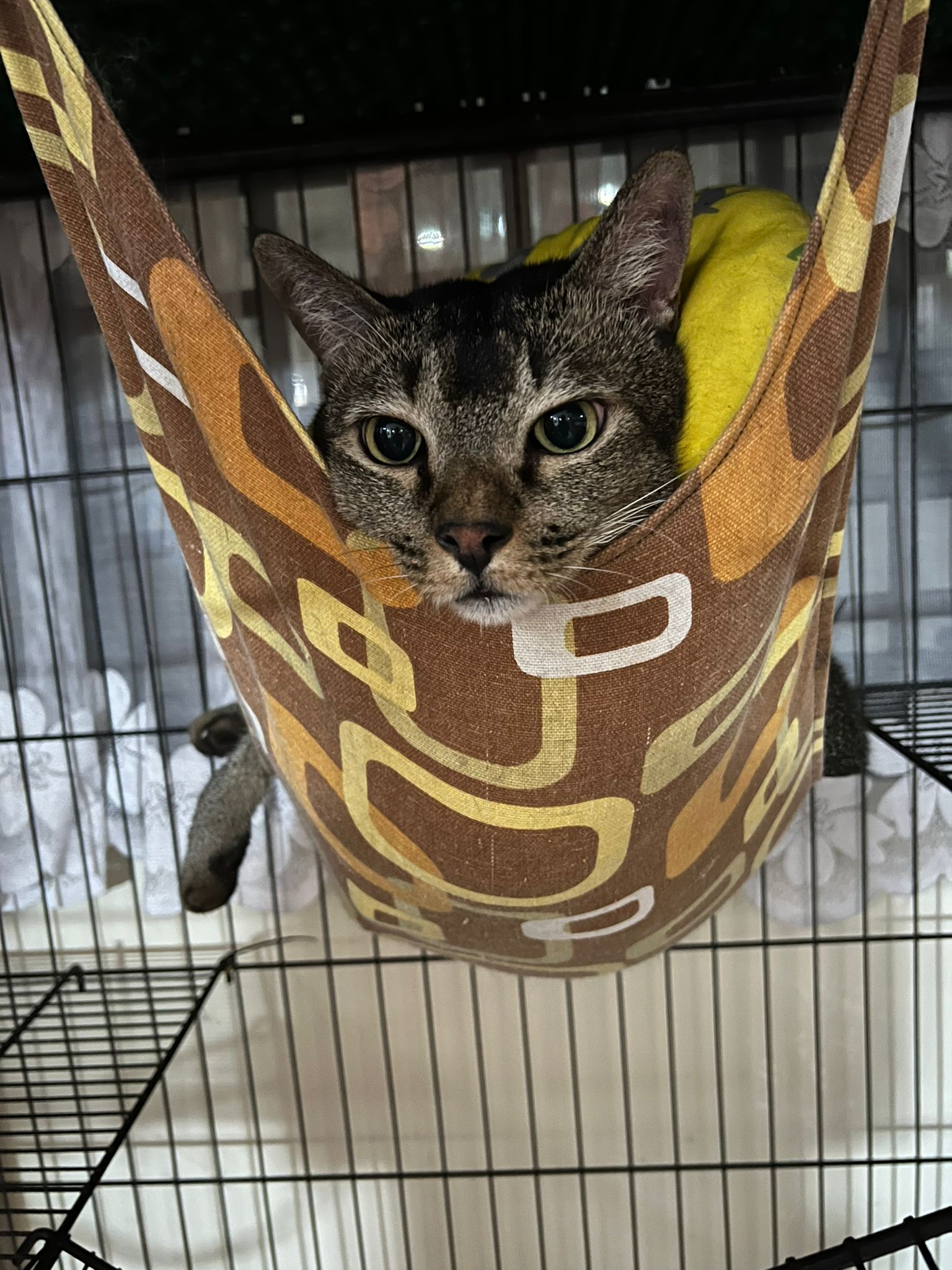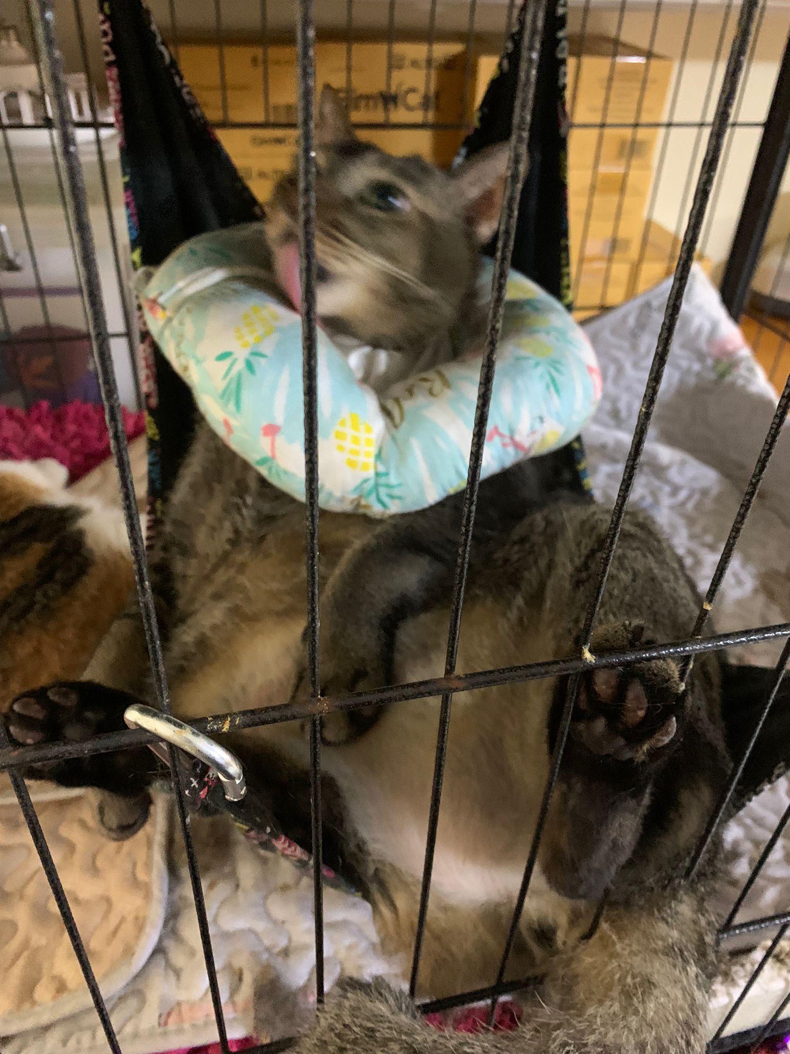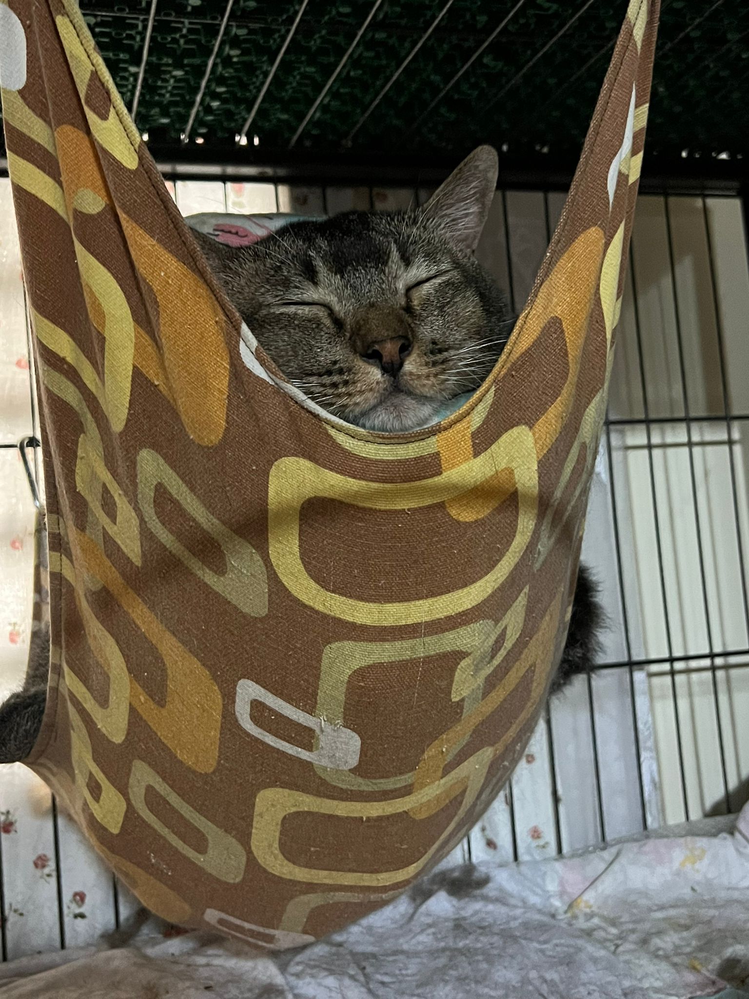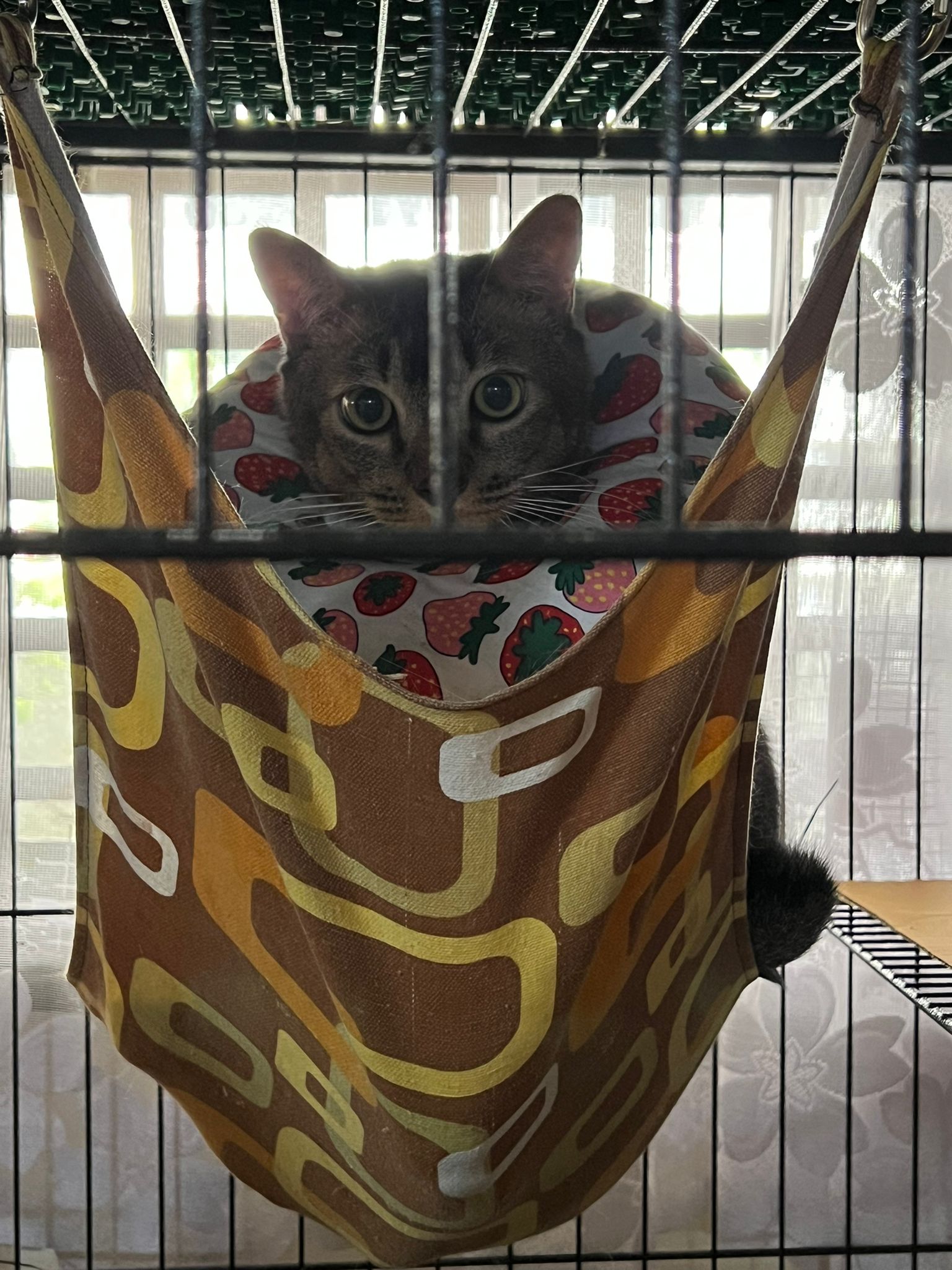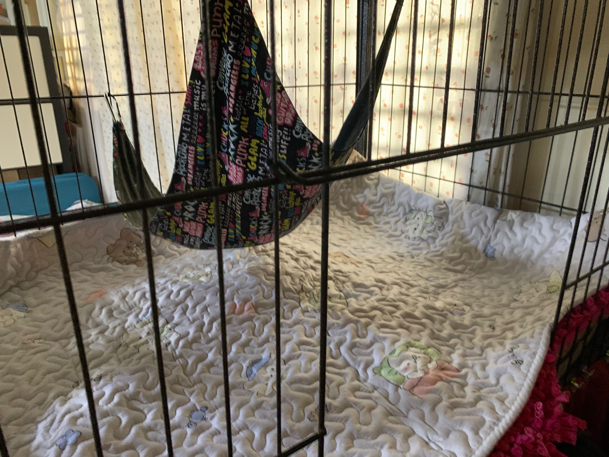Morning: joy and rufus w me for food round. Got eat. Then he sit in cage w mama, but not on hammock.