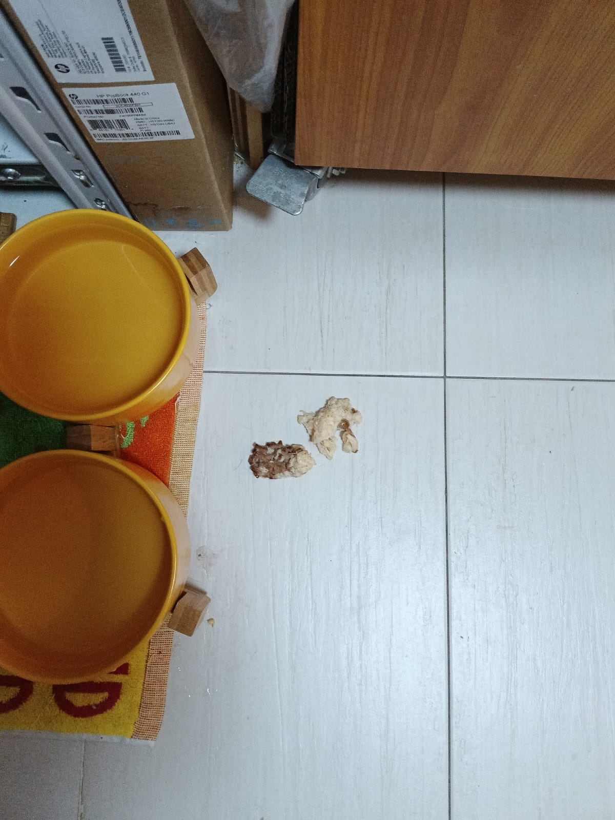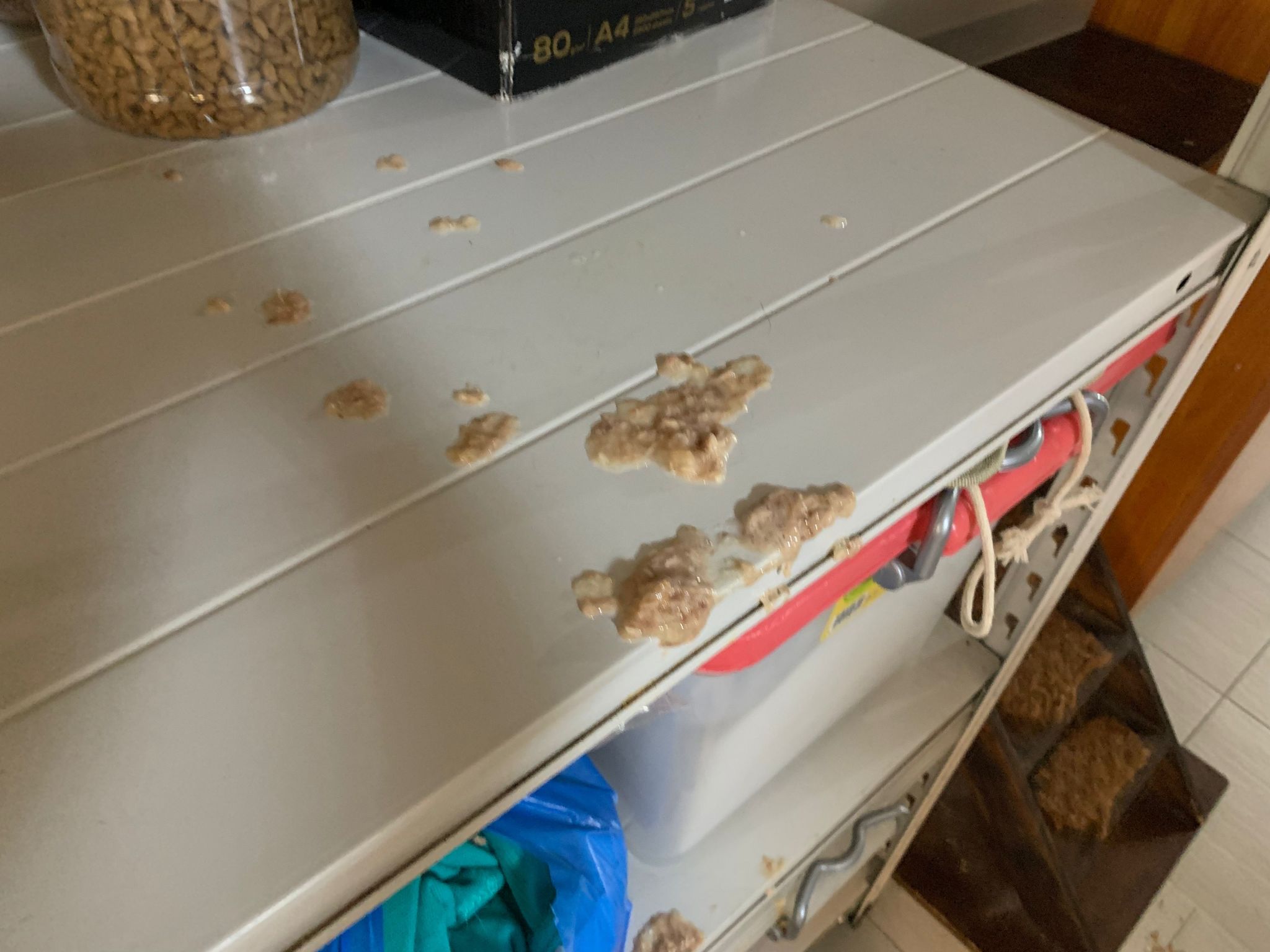 B4 I leave at 12.40pm+: no new poo but there is some watery + little food vomit beside the bins.