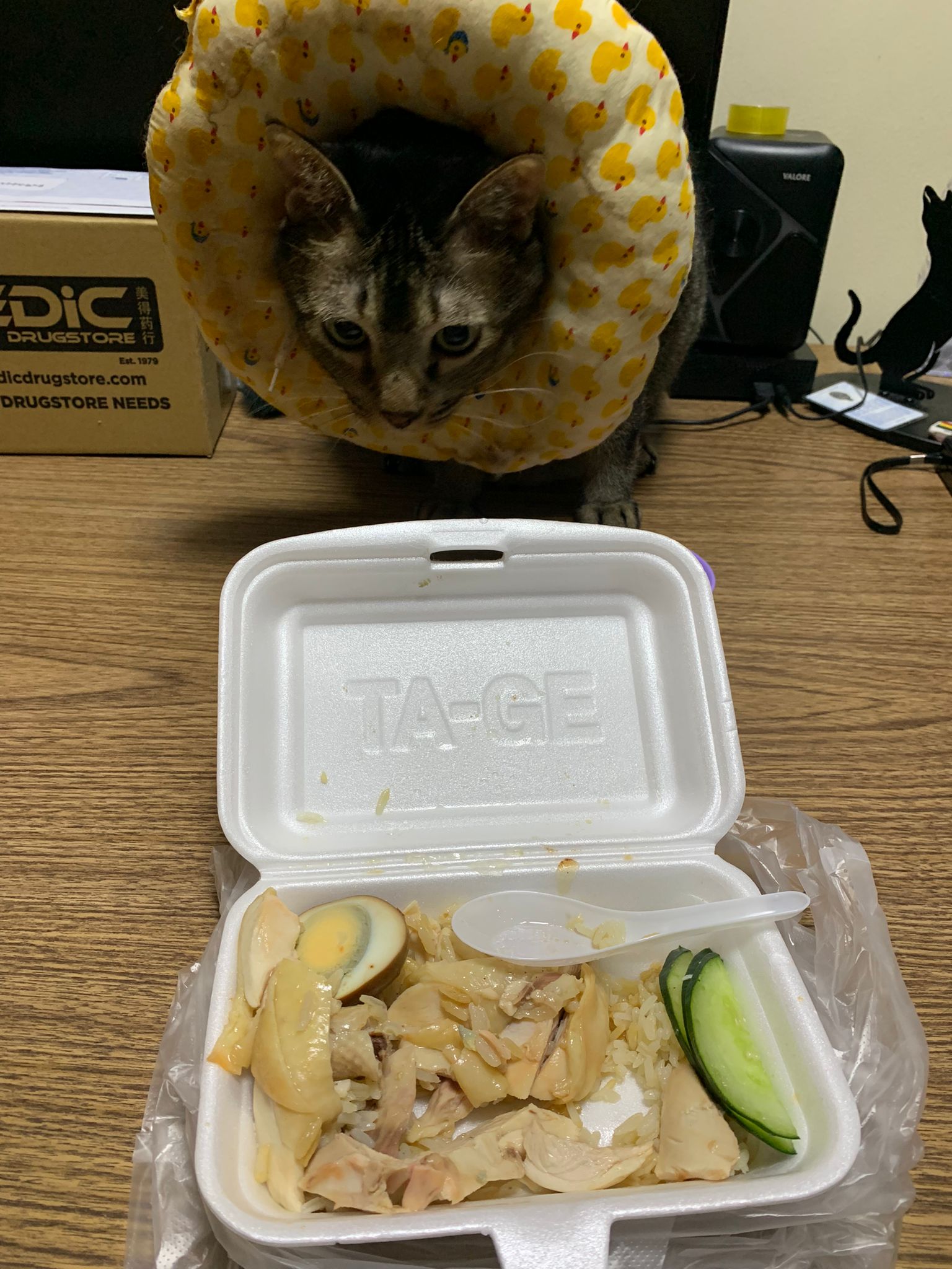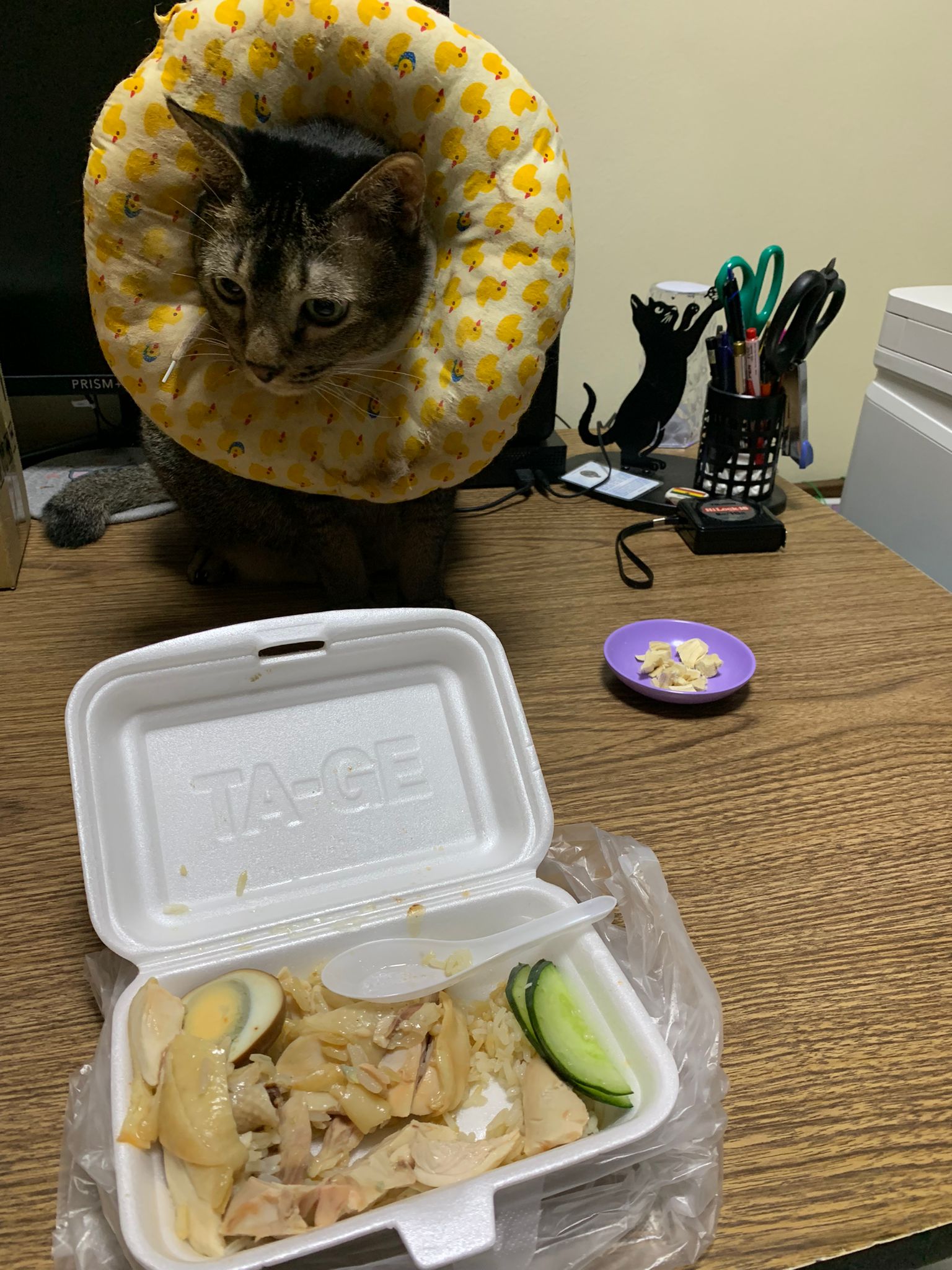 11.45am: I sit down to eat my chicken rice for a few times. First is joy come, then rufus come n find me for chicken … they damn damn enthu. So I give them the food for good chicken fillet. Joy got eat. Not sure rufus got eat or not but he looks so poor thing keep waiting for me, keep waiting for me aiya so poor. Change his cool collar. Whack me cos don’t give him real chicken. I tear one pc for all 4 of them to share.