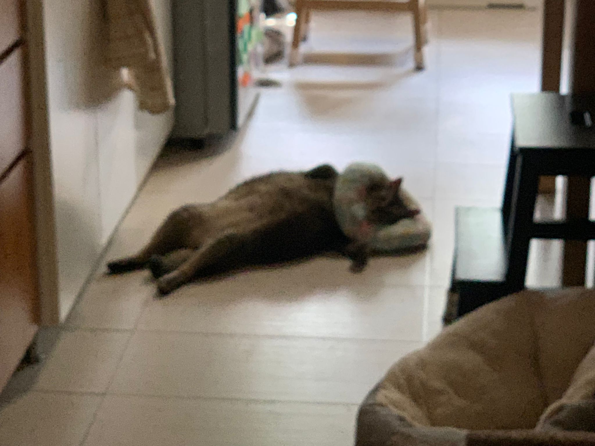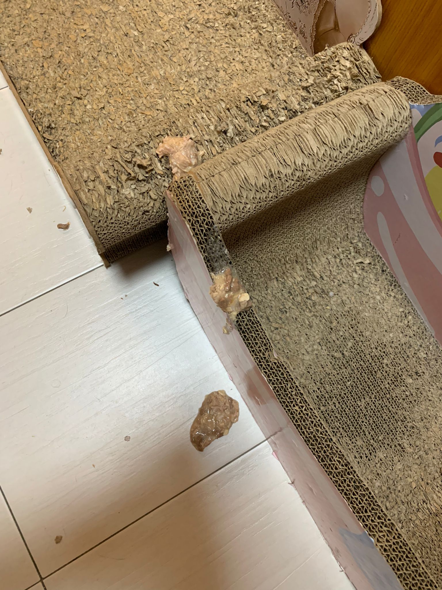 7.31pm: may:”There is some vomit in the living room” – w kibble and chicken wet food, I think should be more of mama.