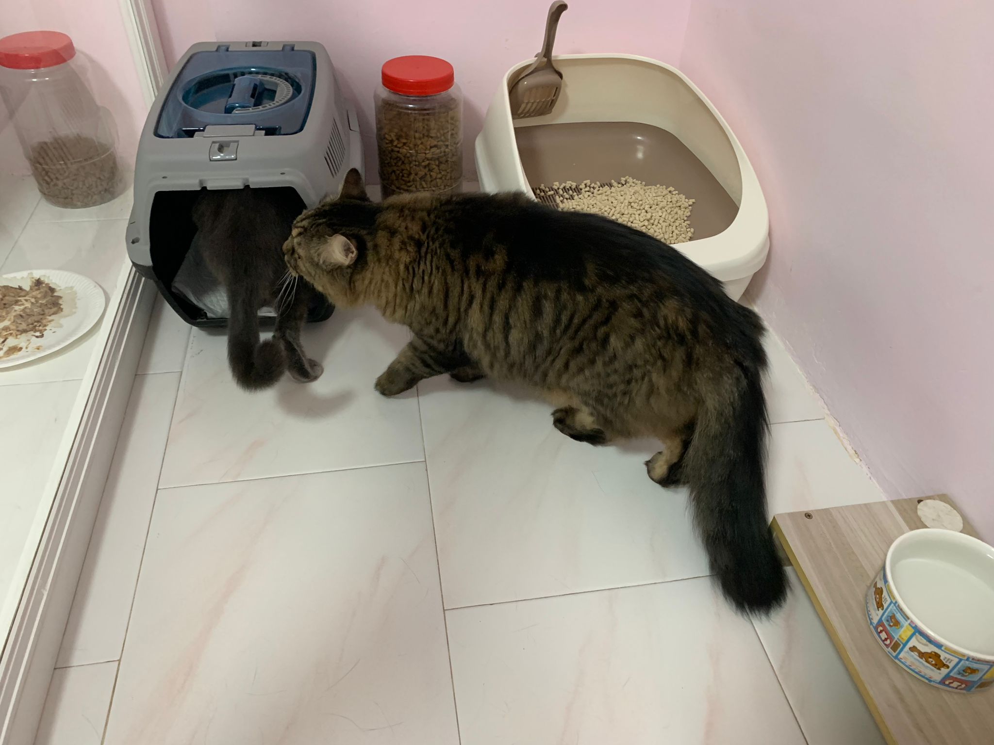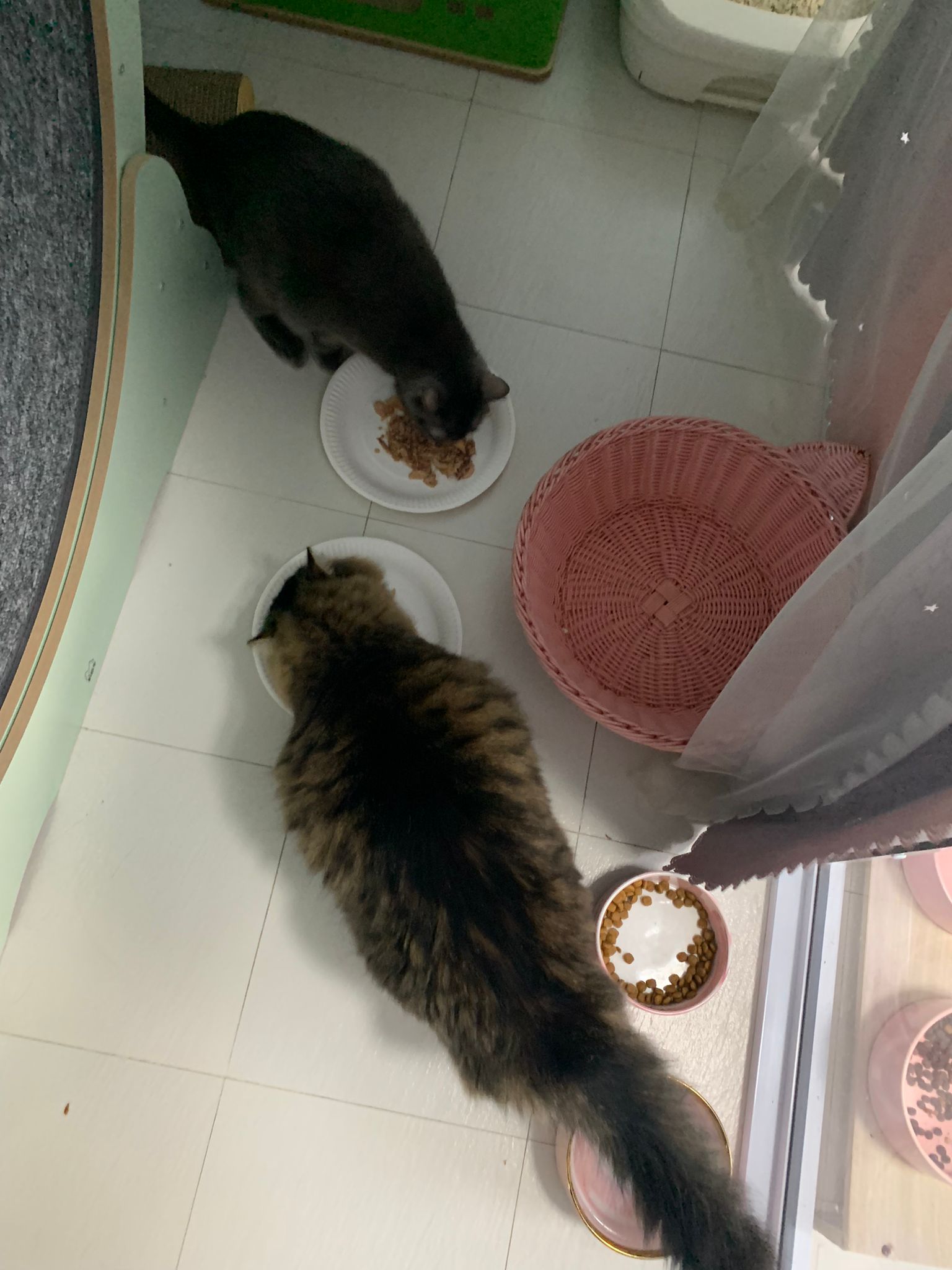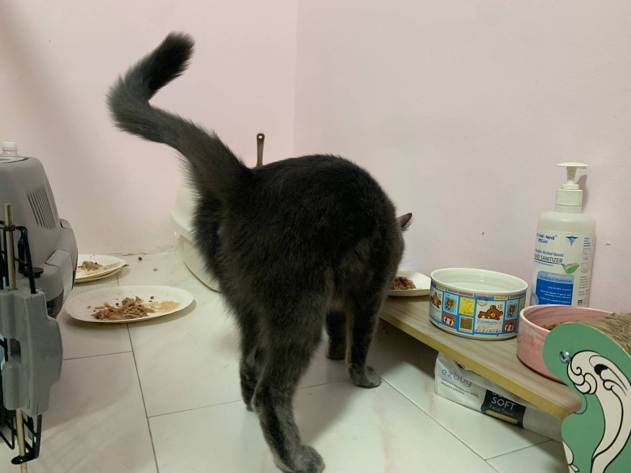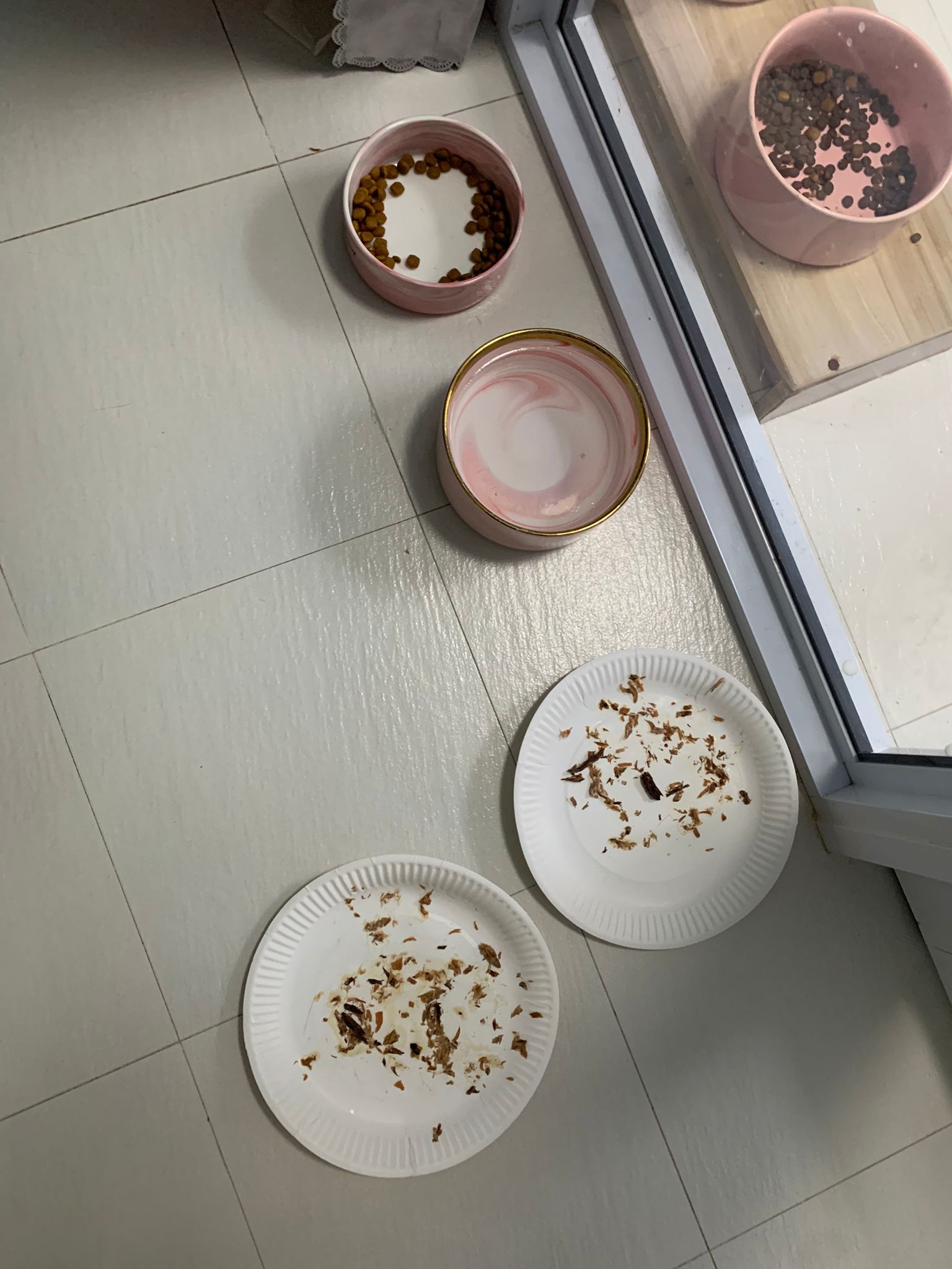 Morning: come out to greet me too. I tell her I clear poo first then she walk elsewhere didn’t block me. Oh ya but she came to the plate where I put the poo on, think she is very hungry. wet food all cleared. Kibble 60% cleared. 2 sets of poo, one is more, but very very dry 7/10, one set normal texture but 5.5/10. Pee amount ok.