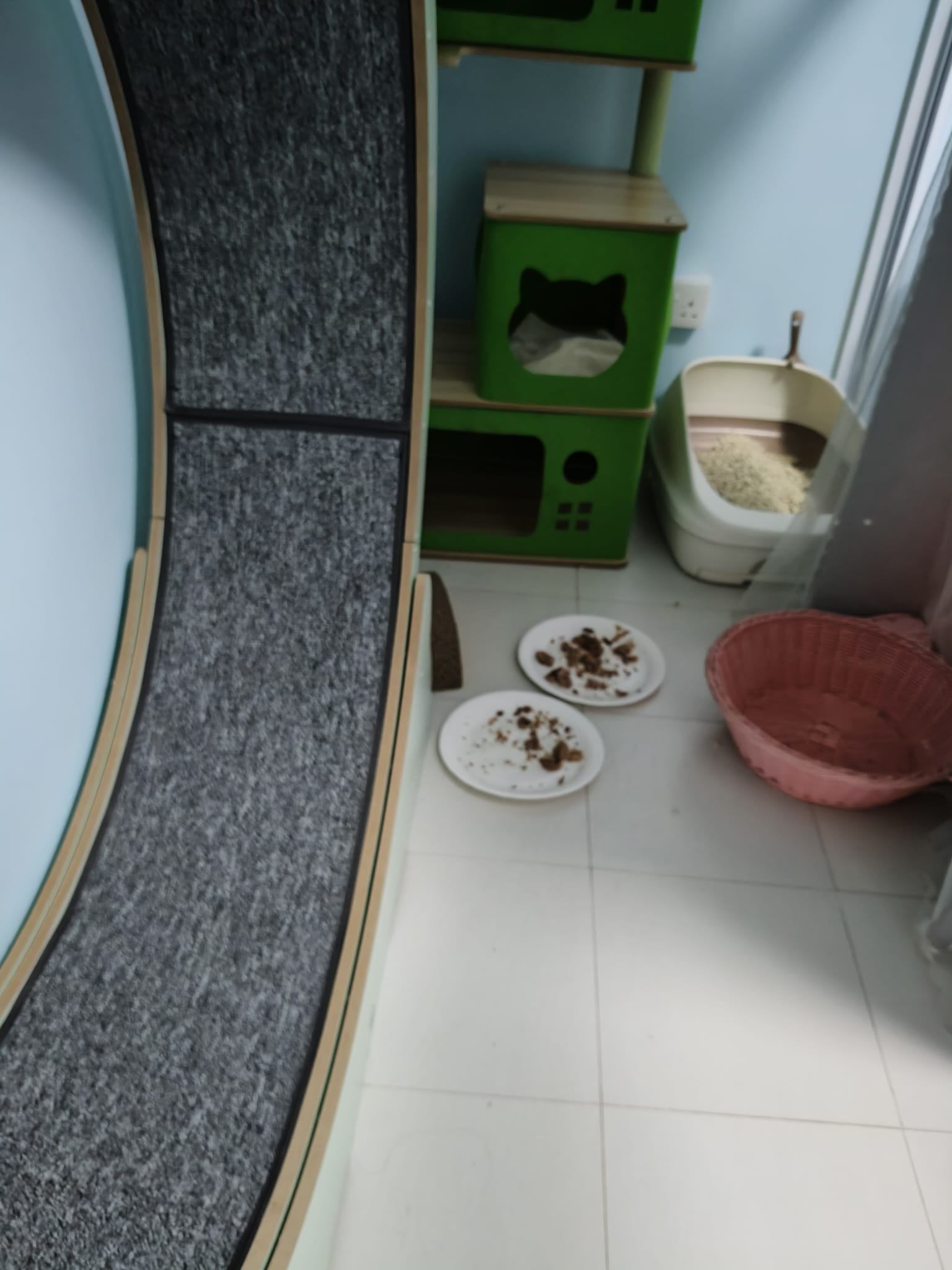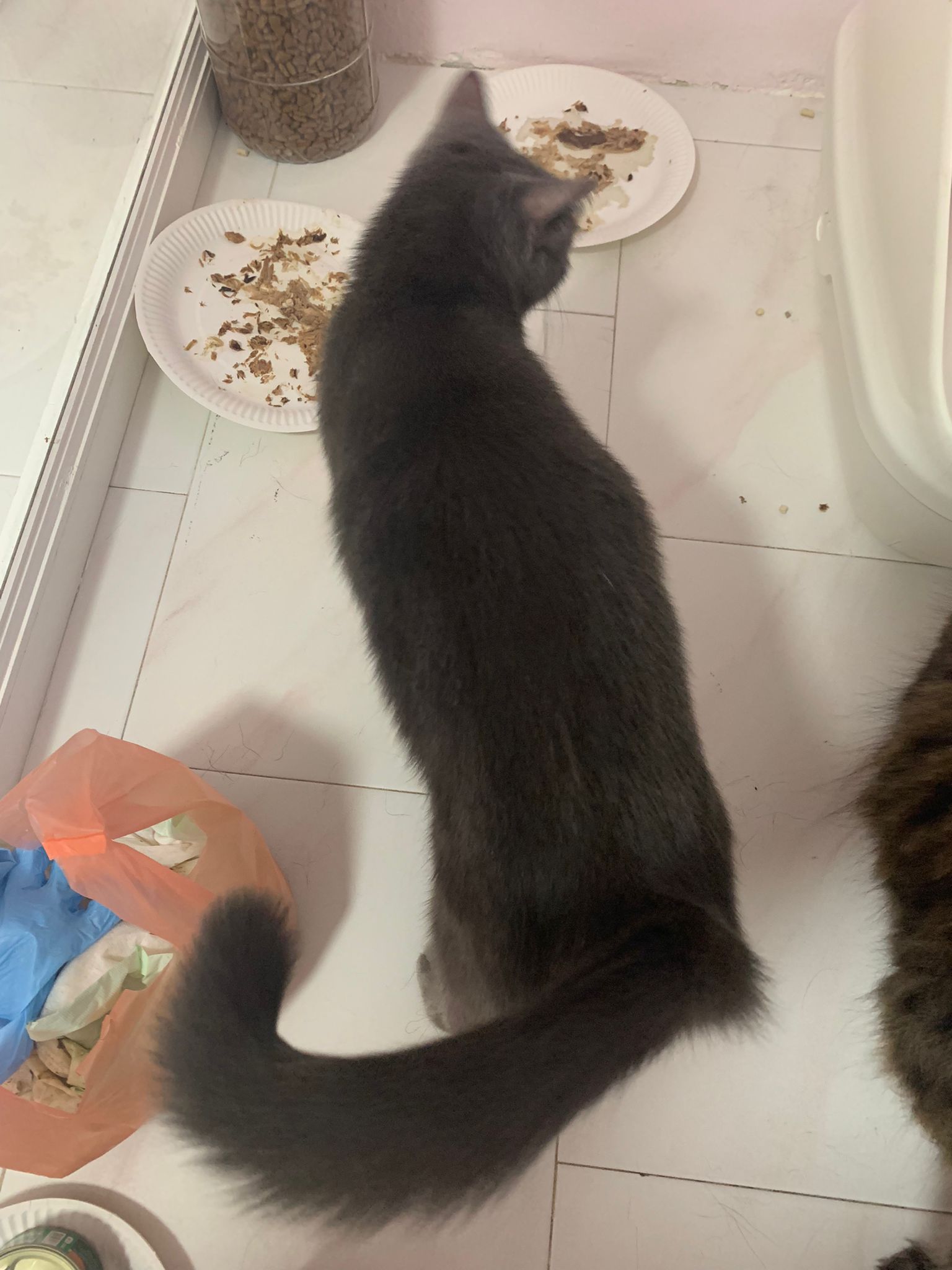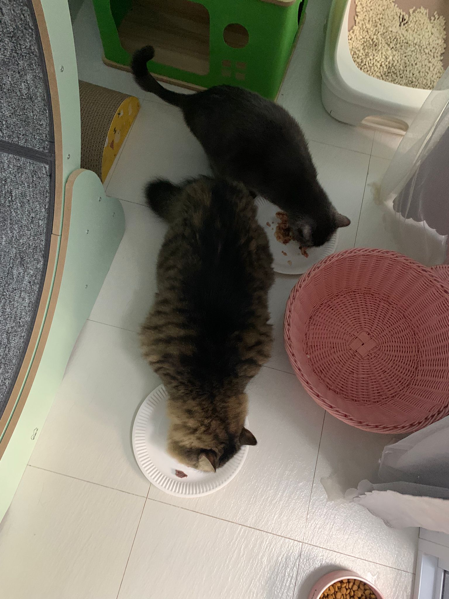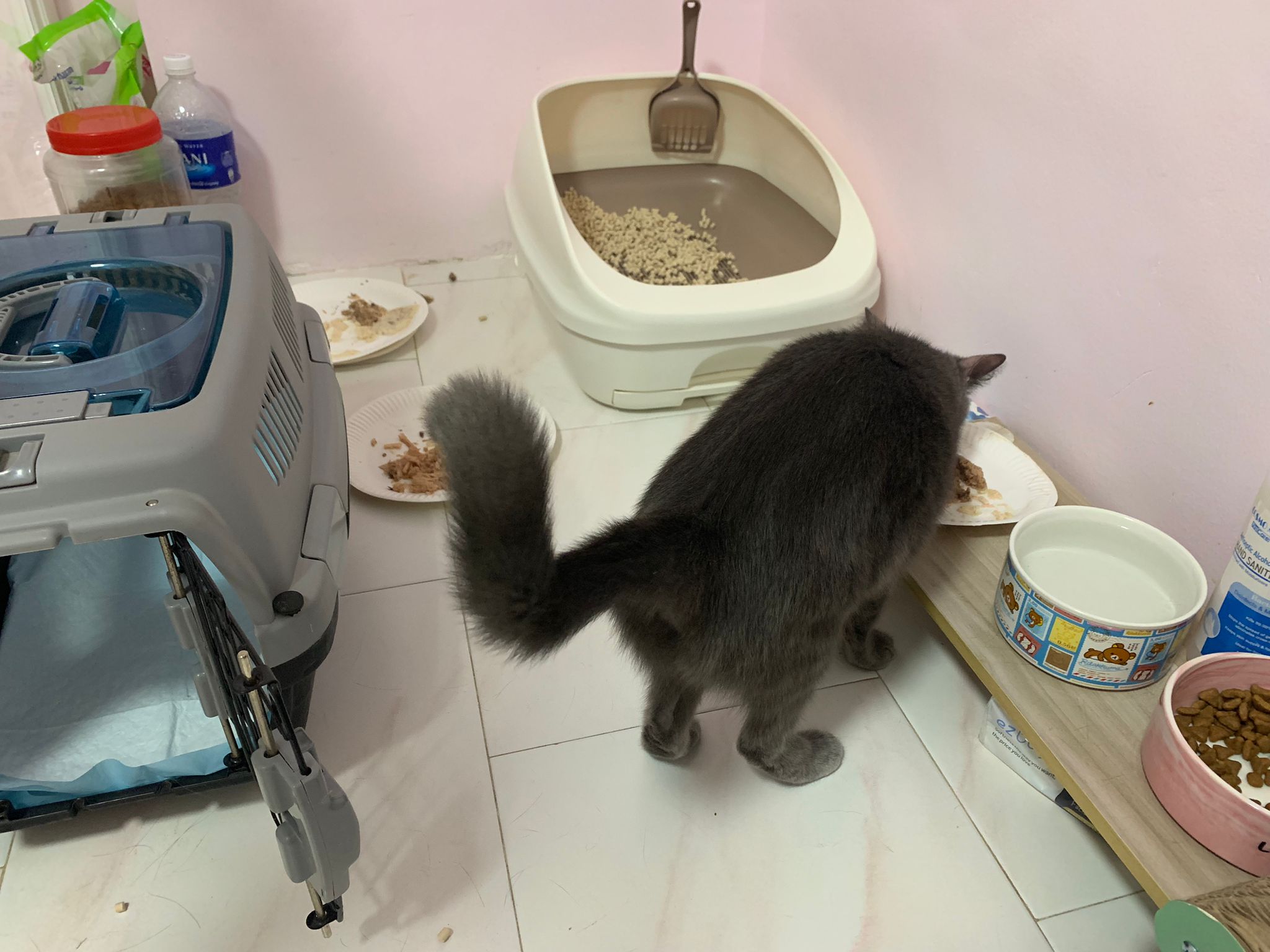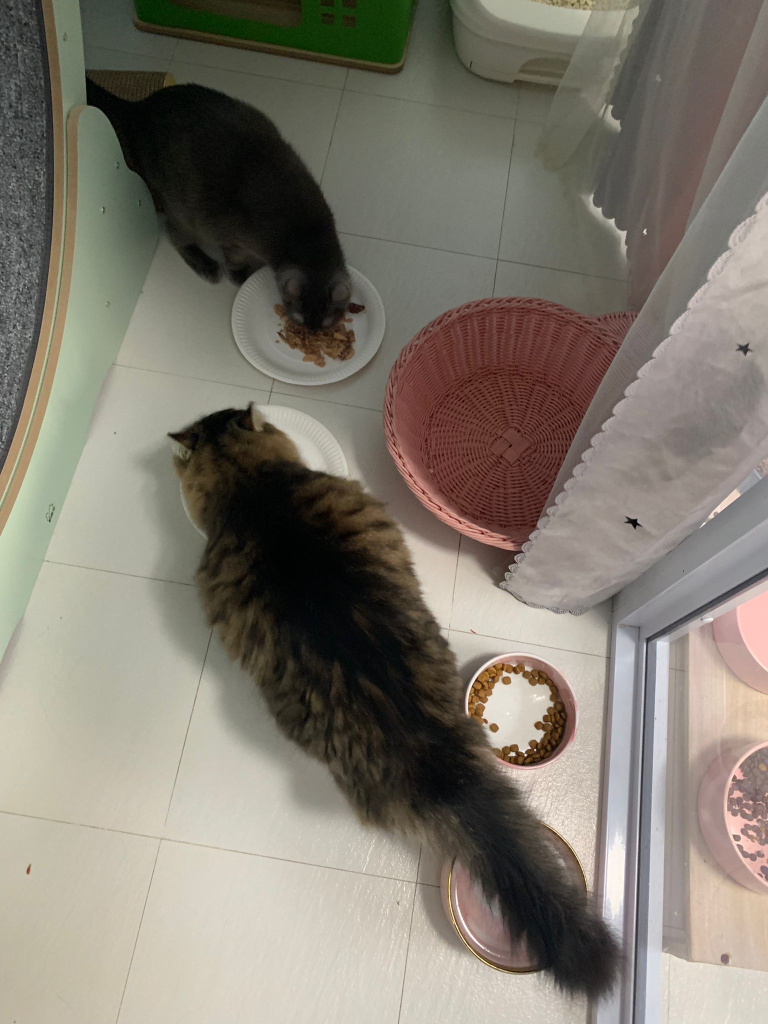 Morning: come out to greet me too. I tell her I clear poo first then she walk elsewhere didn’t block me. Oh ya but she came to the plate where I put the poo on, think she is very hungry. wet food all cleared. Kibble 60% cleared. 2 sets of poo, one is more, but very very dry 7/10, one set normal texture but 5.5/10. Pee amount ok.