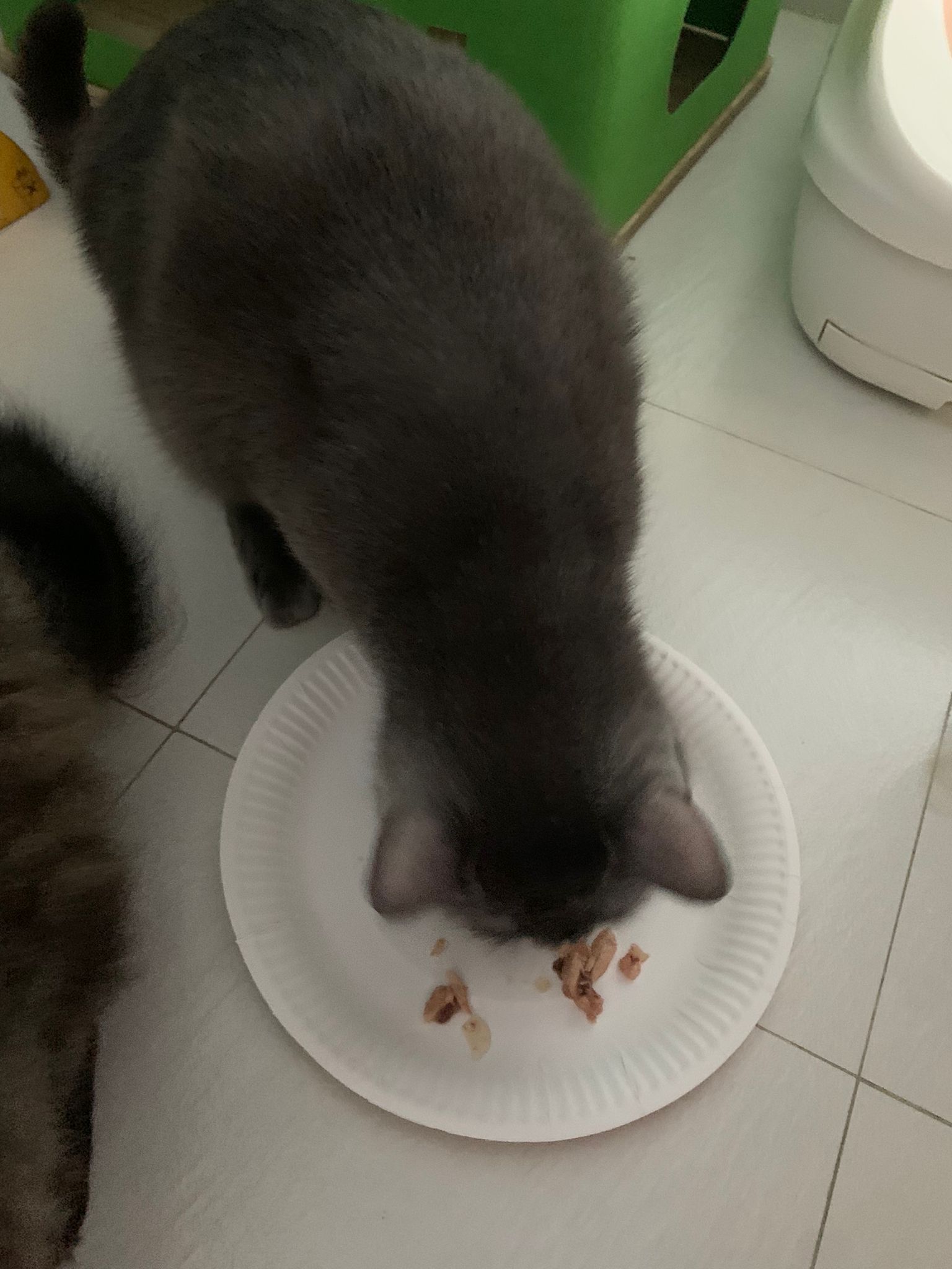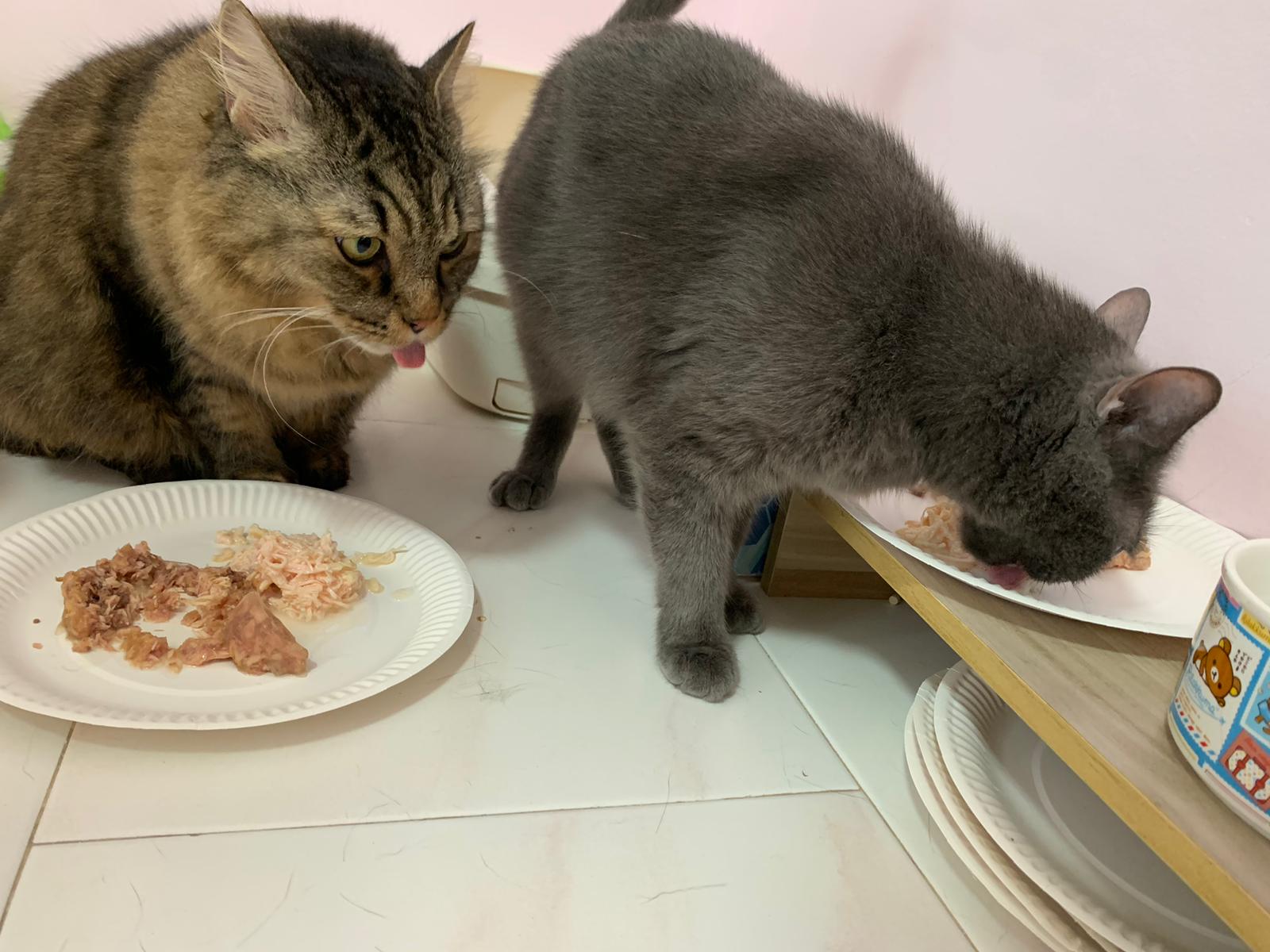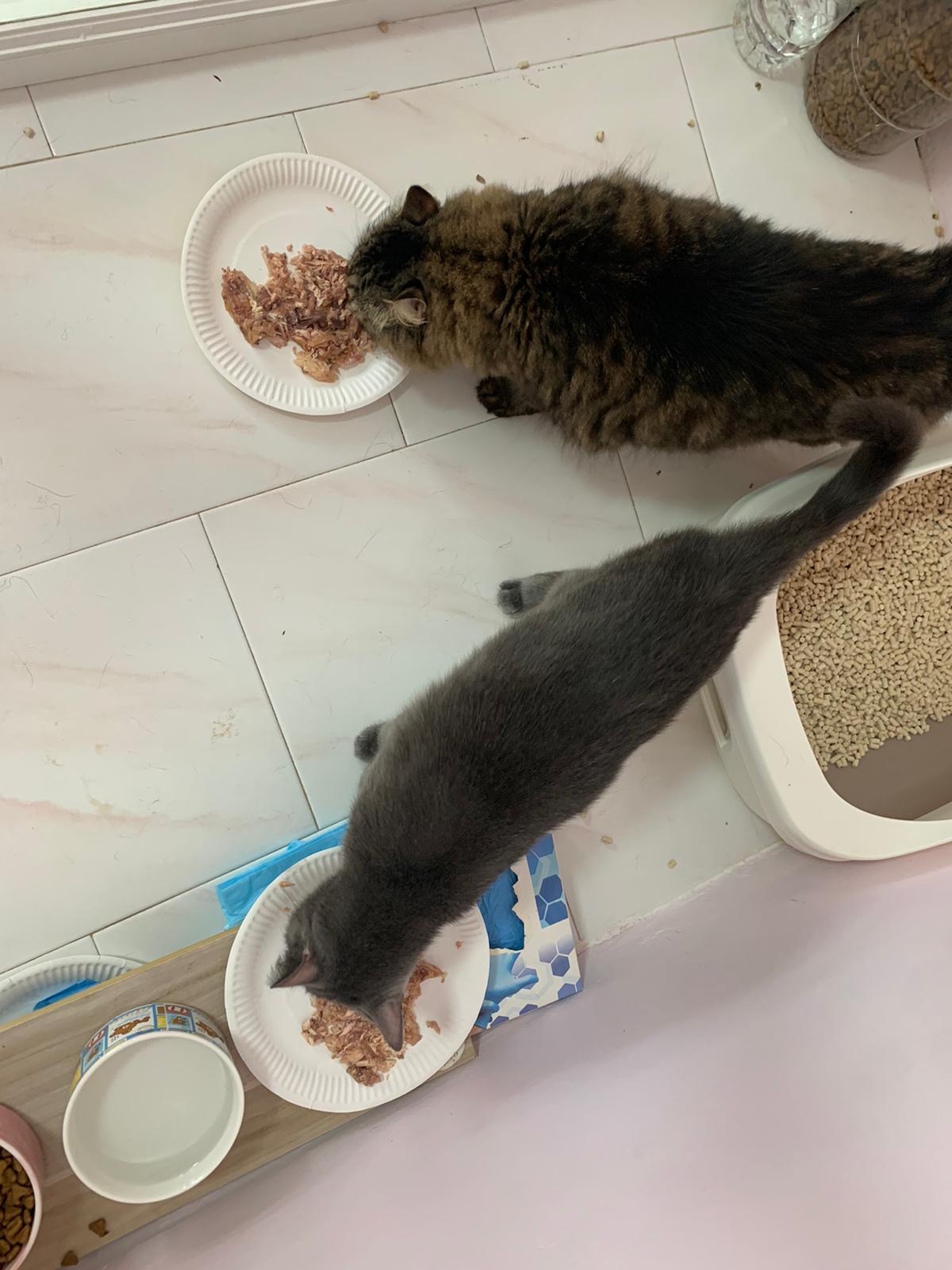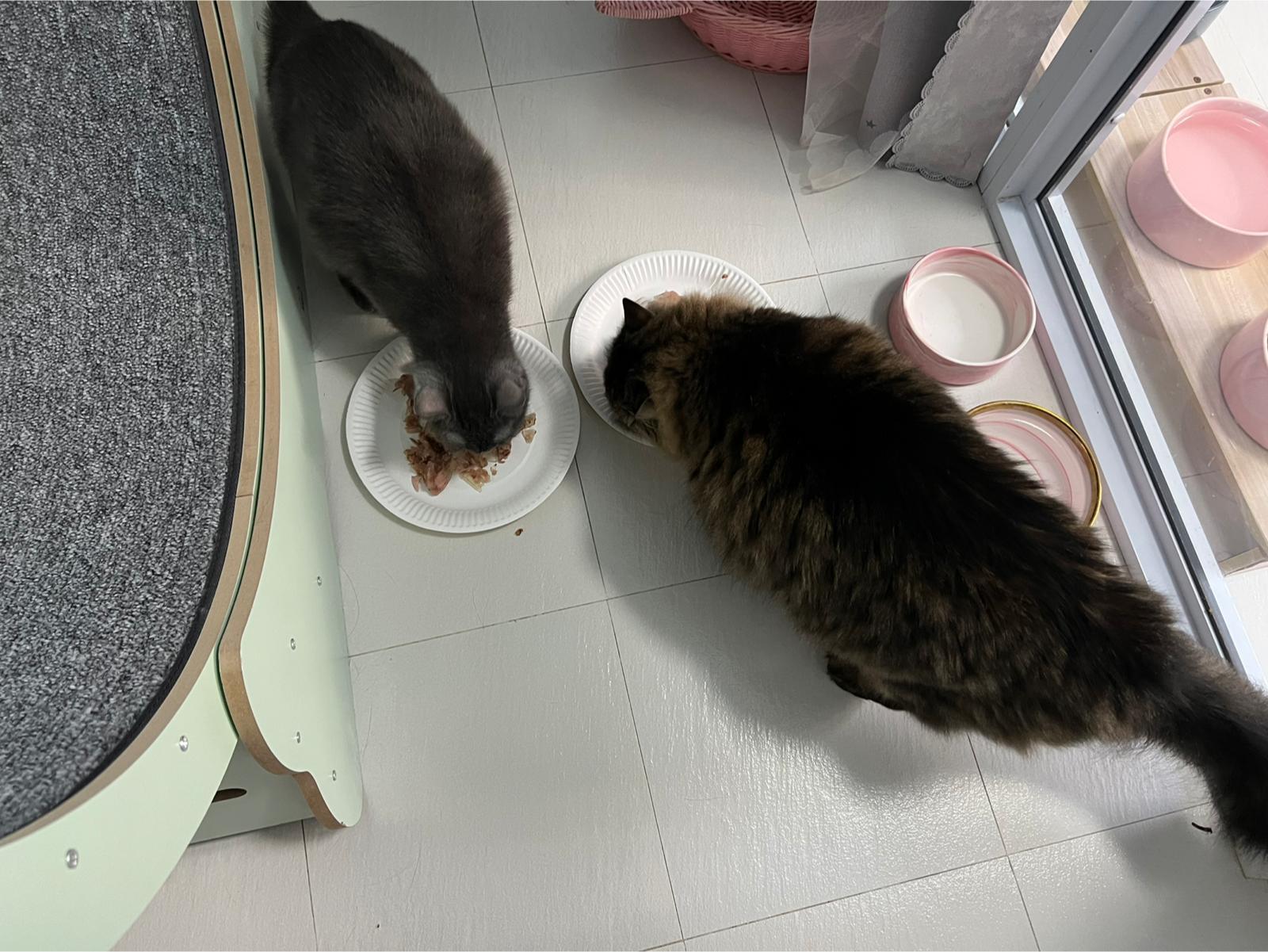 8am+: these 2 keep sticking to me, take videos also difficult. Photos can’t see face. Food confirm got eat but I think I can cut down. Got poo can’t differentiate one set or 2, but 2.75/10. Serve tuna w chicken ham. Rumi eat like 5-10% and follow Simba to look at me at the door. The front panel a little blur if not can take her cute look up face.