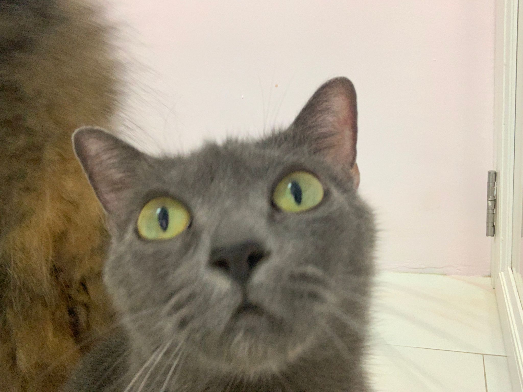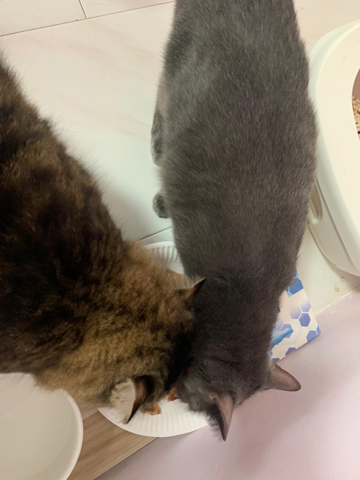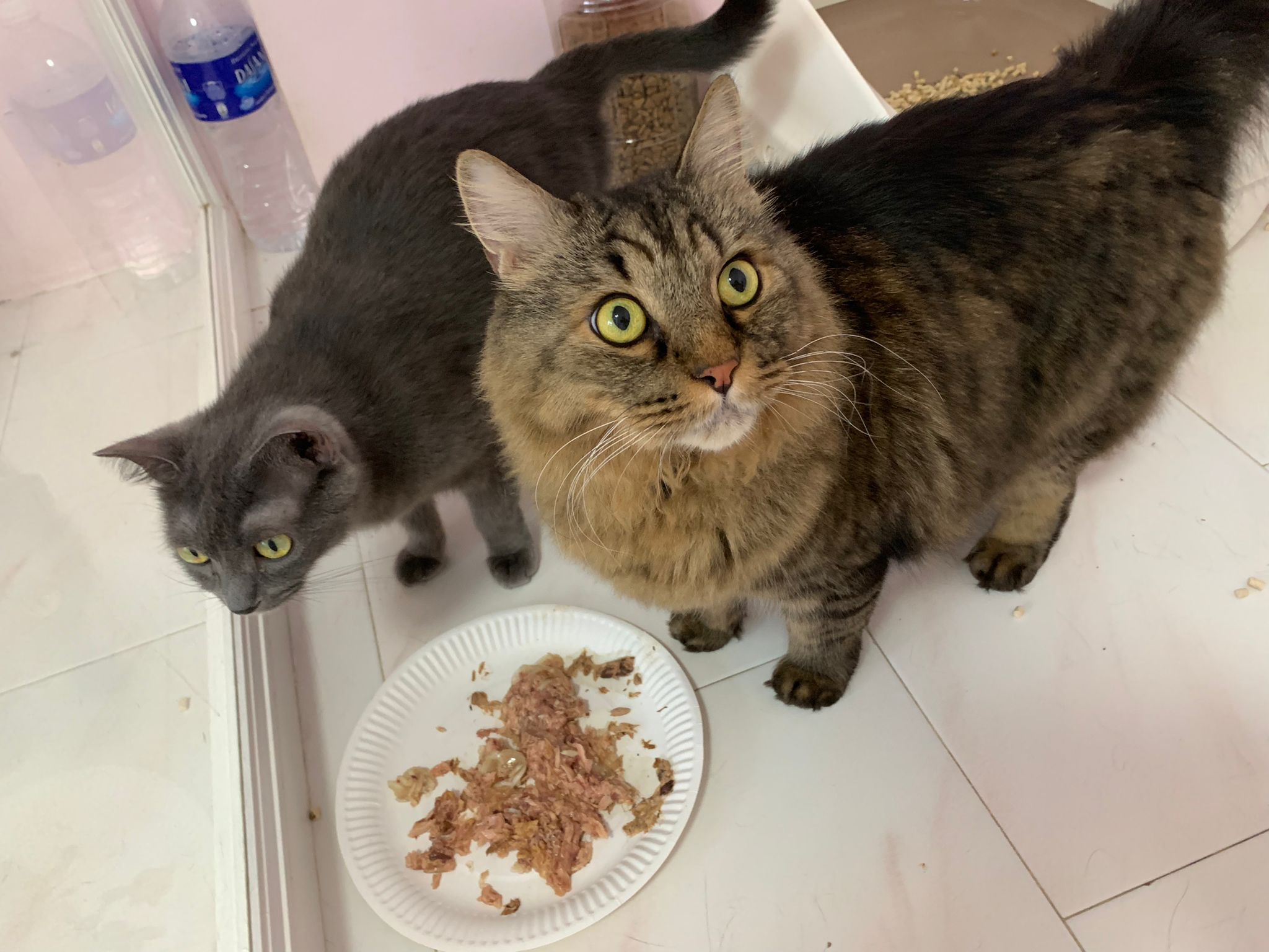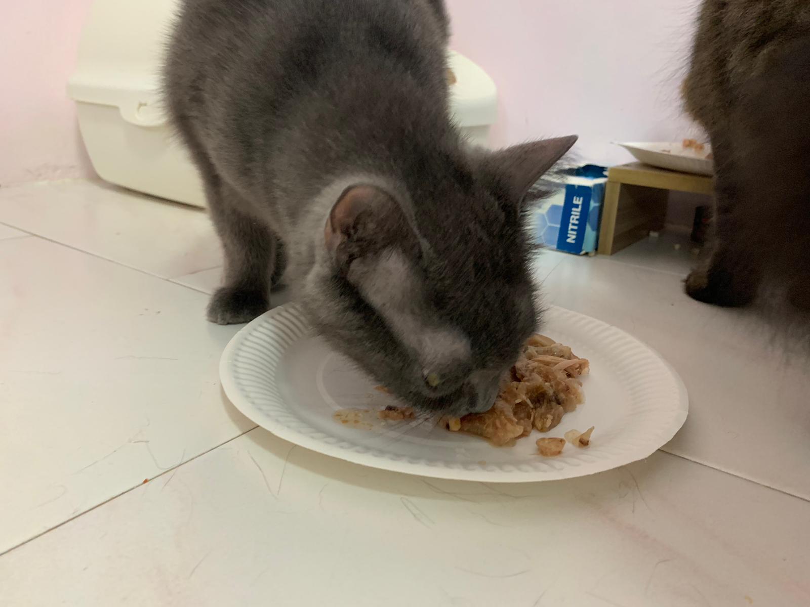 8am+: these 2 keep sticking to me, take videos also difficult. Photos can’t see face. Food confirm got eat but I think I can cut down. Got poo can’t differentiate one set or 2, but 2.75/10. Serve tuna w chicken ham. Rumi eat like 5-10% and follow Simba to look at me at the door. The front panel a little blur if not can take her cute look up face.