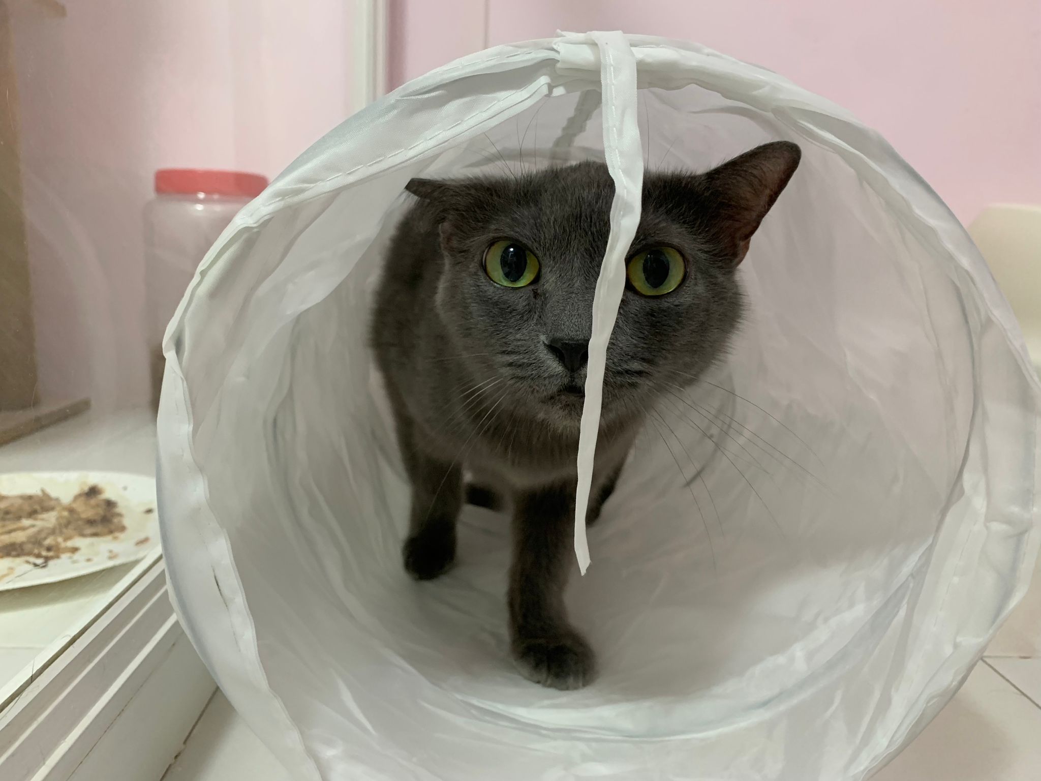 8.45pm: got v little pee stain on the pad. Duno whose’s. Simba keep hissing till rumi slap him. Give them a new white tunnel. Rumi got play in it. I serve fresh tuna w salmon w tuna w chicken, rumi got eat. Really so hungry ah.