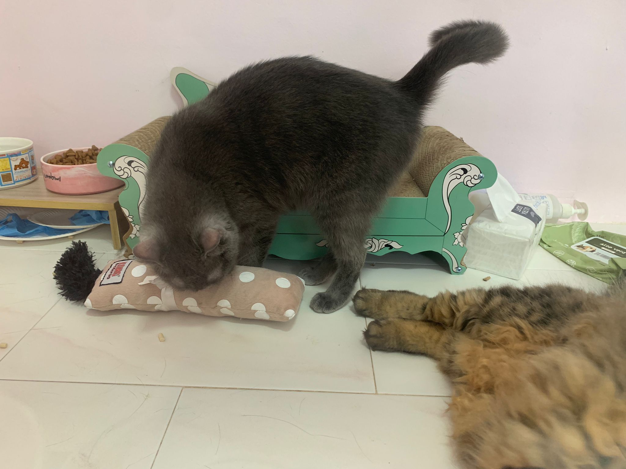 1pm+: happy kid see me back I give Simba and rumi 2 catnip toys. Rumi hug the big one which by right got more smell. But Simba play until more happy than her