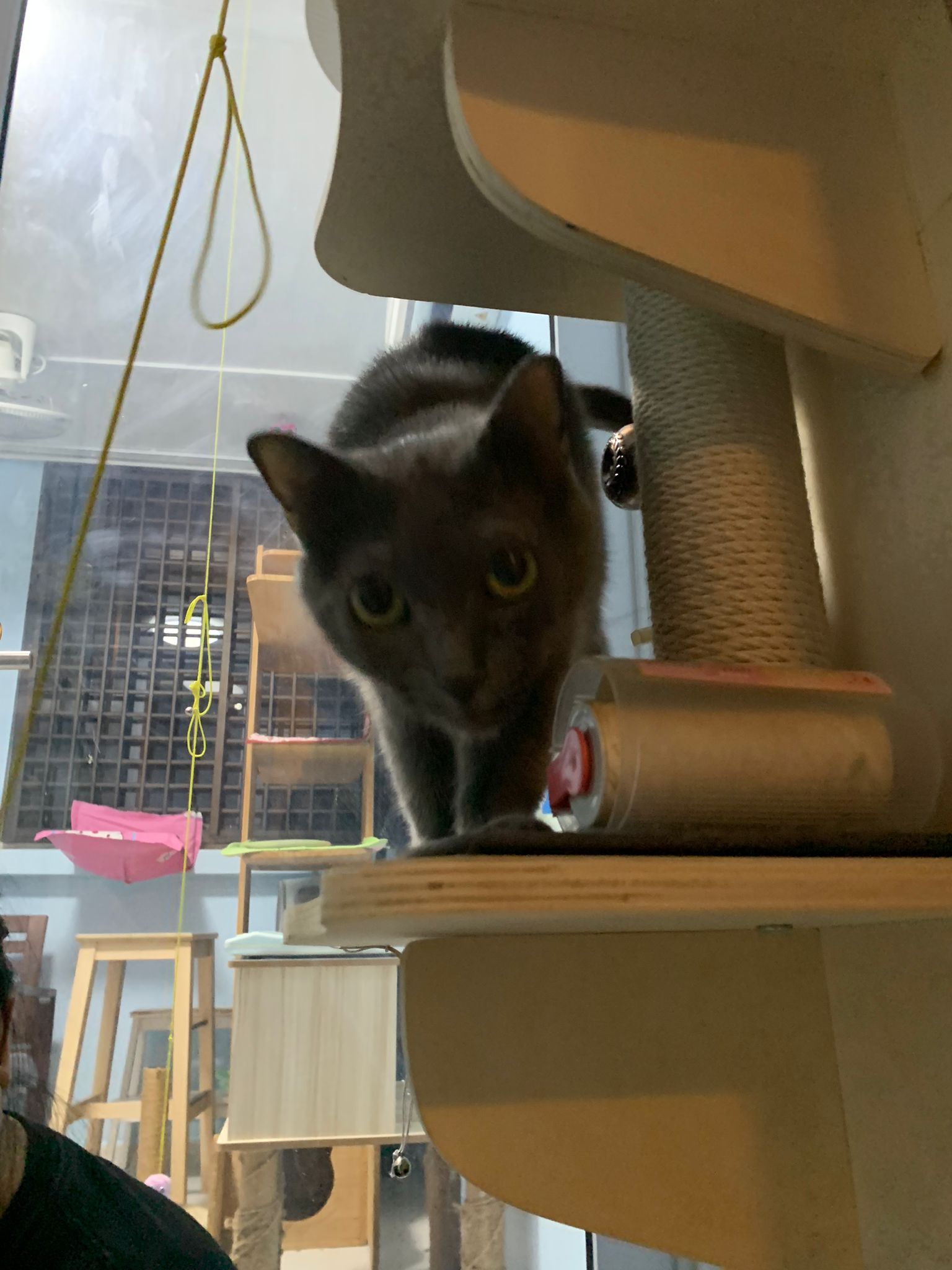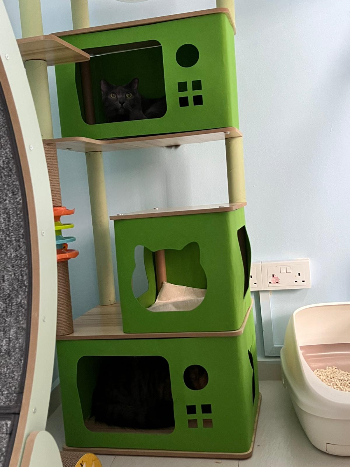 10am+: enter 猫房. Go cat tree first. Ha Simba squeeze in w her so papa carry her to third deck. Papa says she is Angry. Ok leh, sayang her lots. She just laze in the pigeon hole, not much reaction.