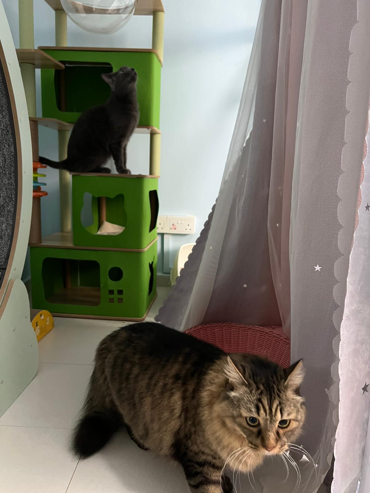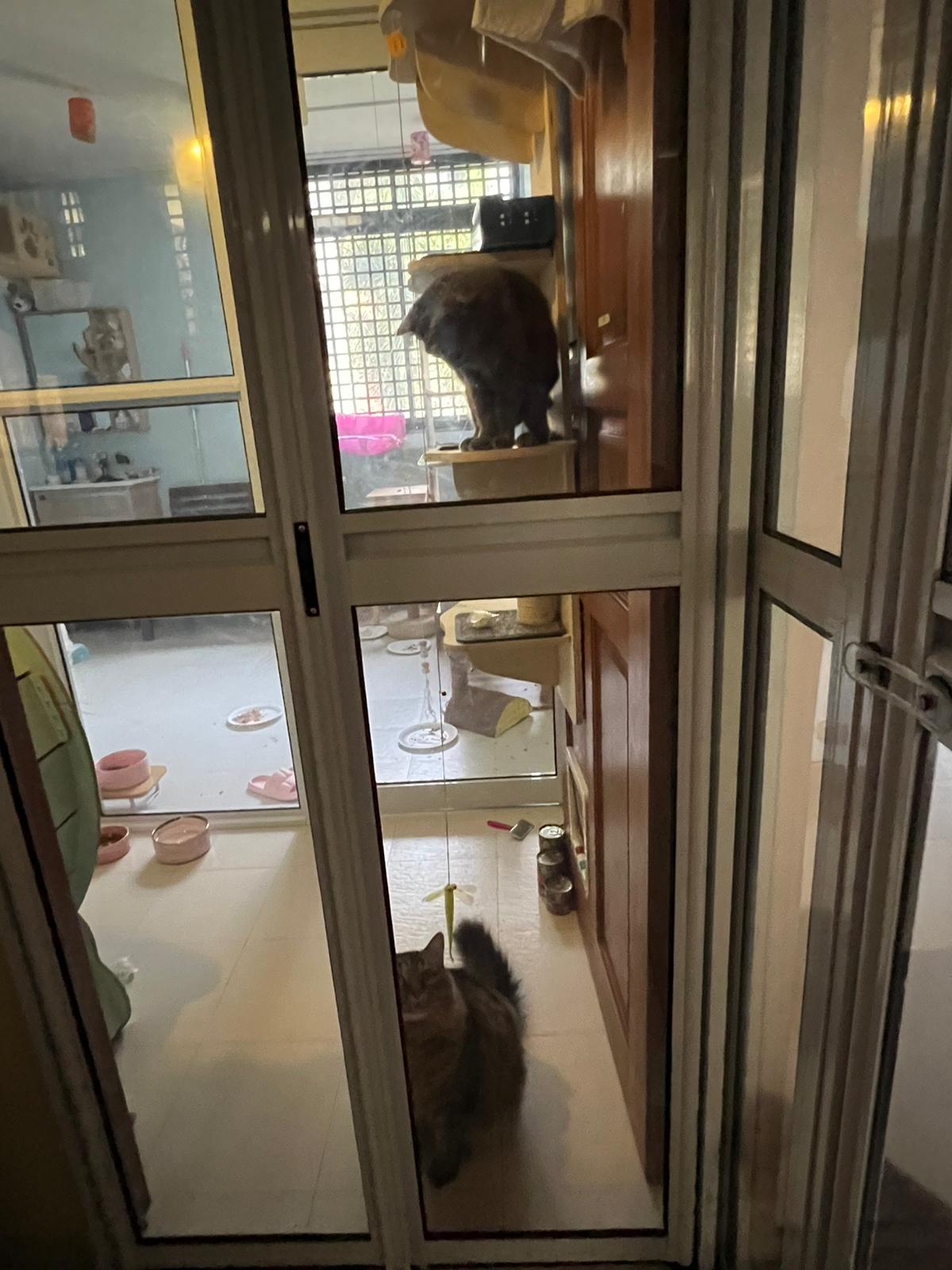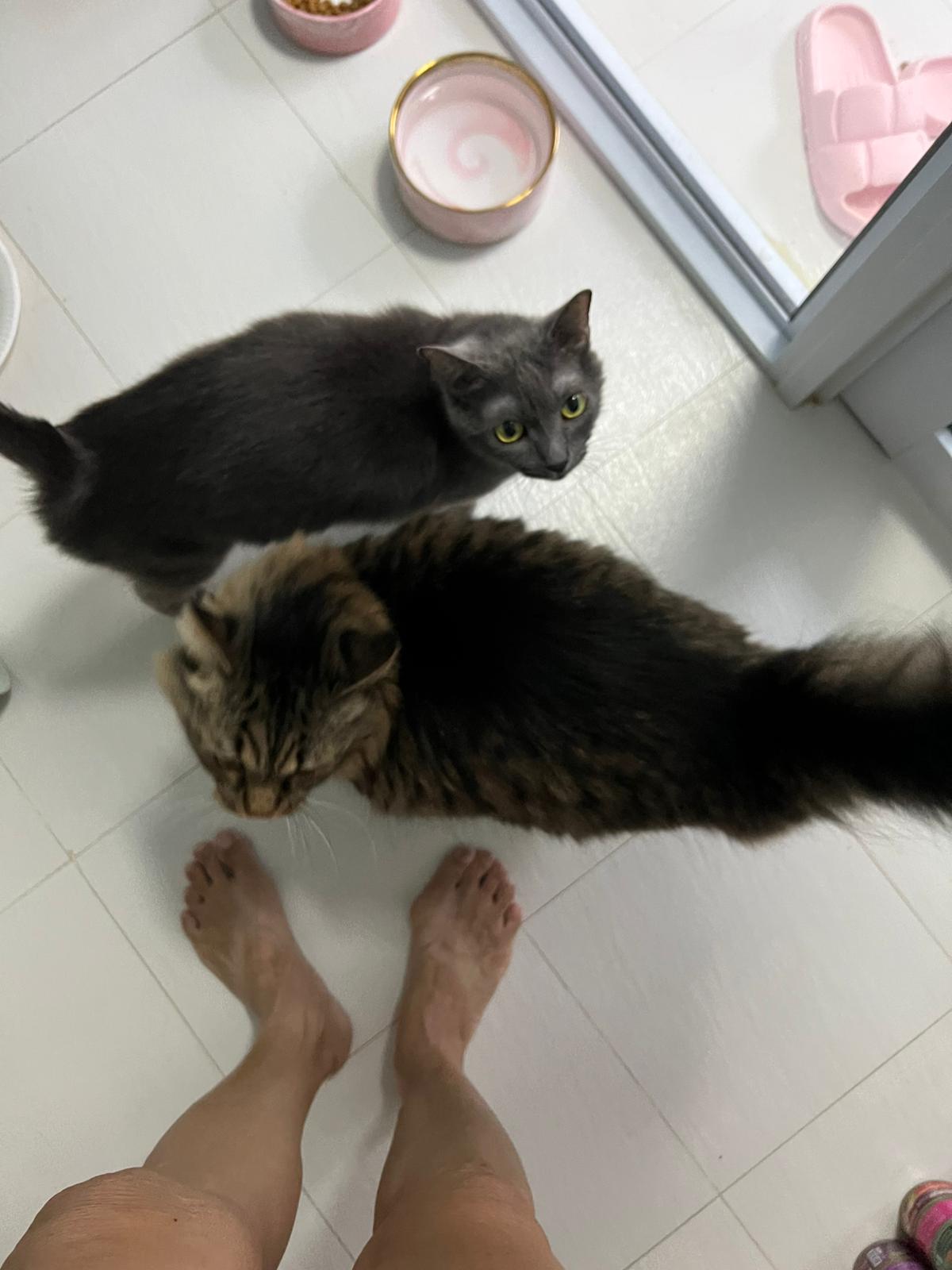 9Am+: both Sei long long, keep circling jo. Food didn’t clear that well, ha Brit didn’t finish. jo serve them breakfast. Rumi likes to jump on stepper for sayang. And she meow when pple standing at the door. Eye level. No poo.