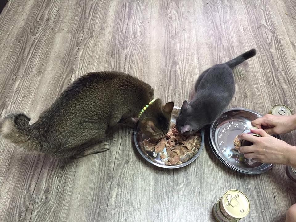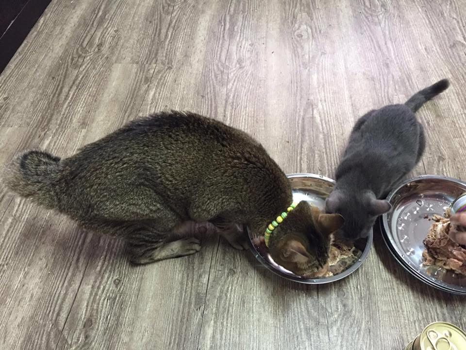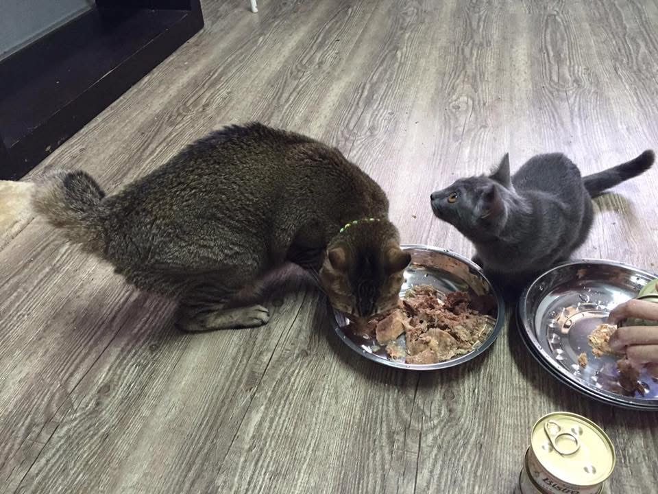 Still like to be on the stepper, ha jo sayang her while she is on it. We don’t dare to put more can food there. I scare cans will drop n hit them. Both eat well