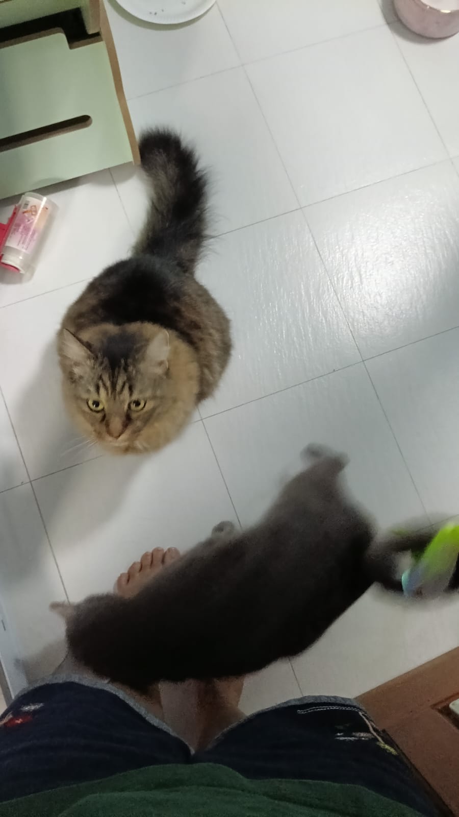 1pm+: happy kid see me back I give Simba and rumi 2 catnip toys. Simba hug the small one and roll on the floor.