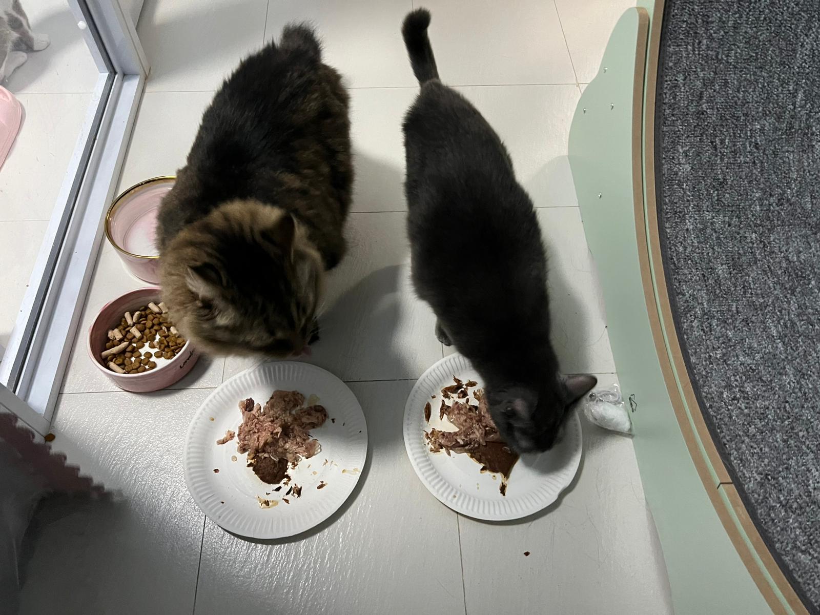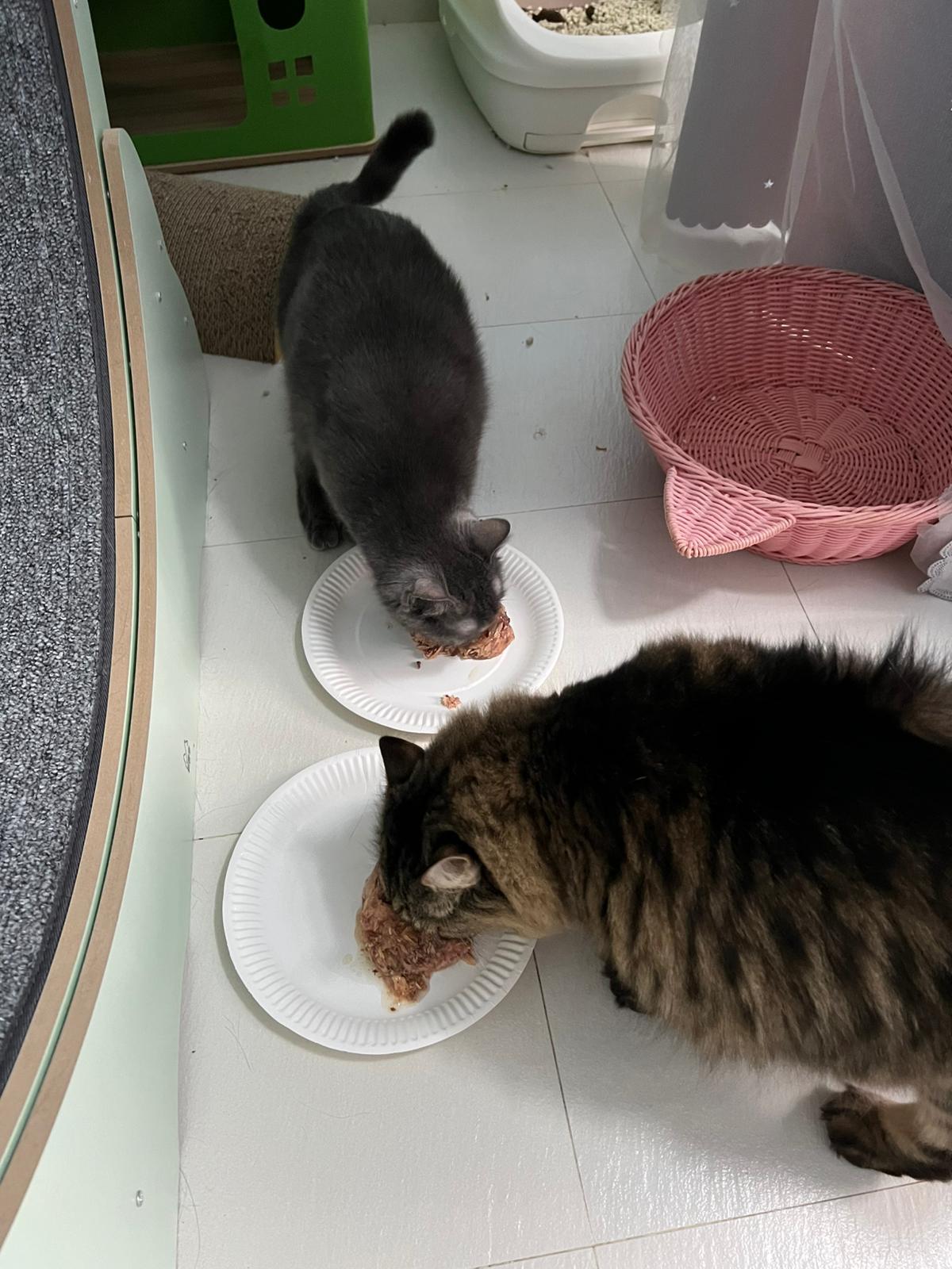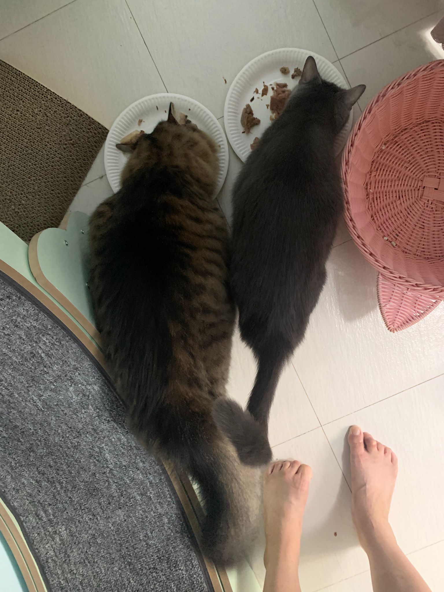 8am+: these 2 keep sticking to me, take videos also difficult. Photos can’t see face. Food confirm got eat but I think I can cut down. Got poo can’t differentiate one set or 2, but 2.75/10. Simba keep head butt me, head butt the sofa. Serve tuna w chicken ham.