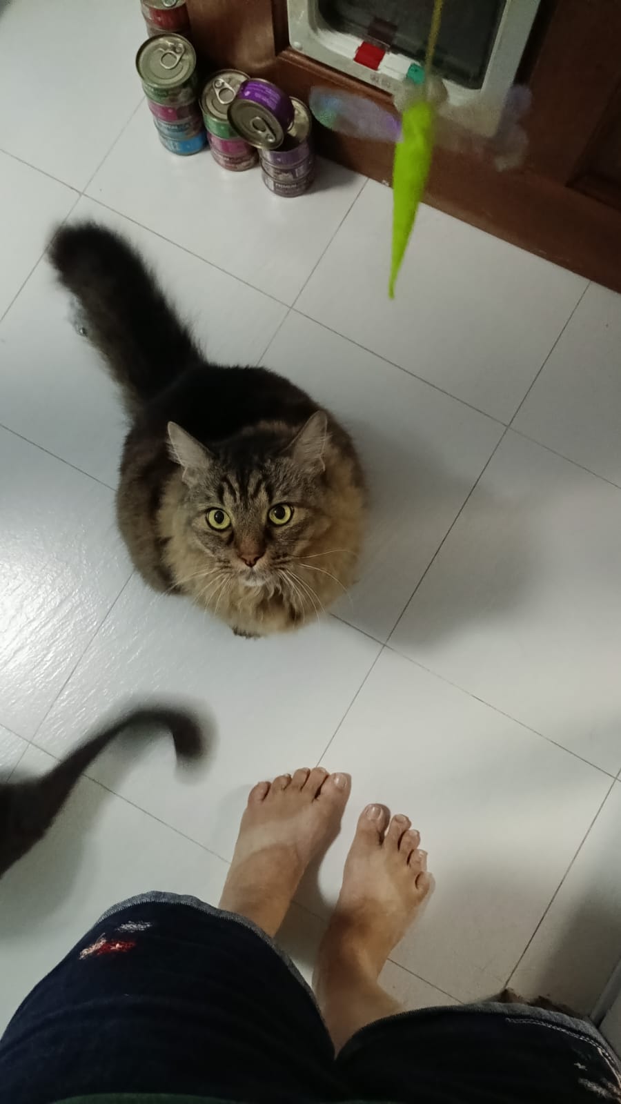 9Am+: serve usual breakfast. got poo and stuff all over the floor. Clean up and he keep running me non stop and meow non stop. I scolding him he also Duno. Still want sayang while keep meow meow meow meow
