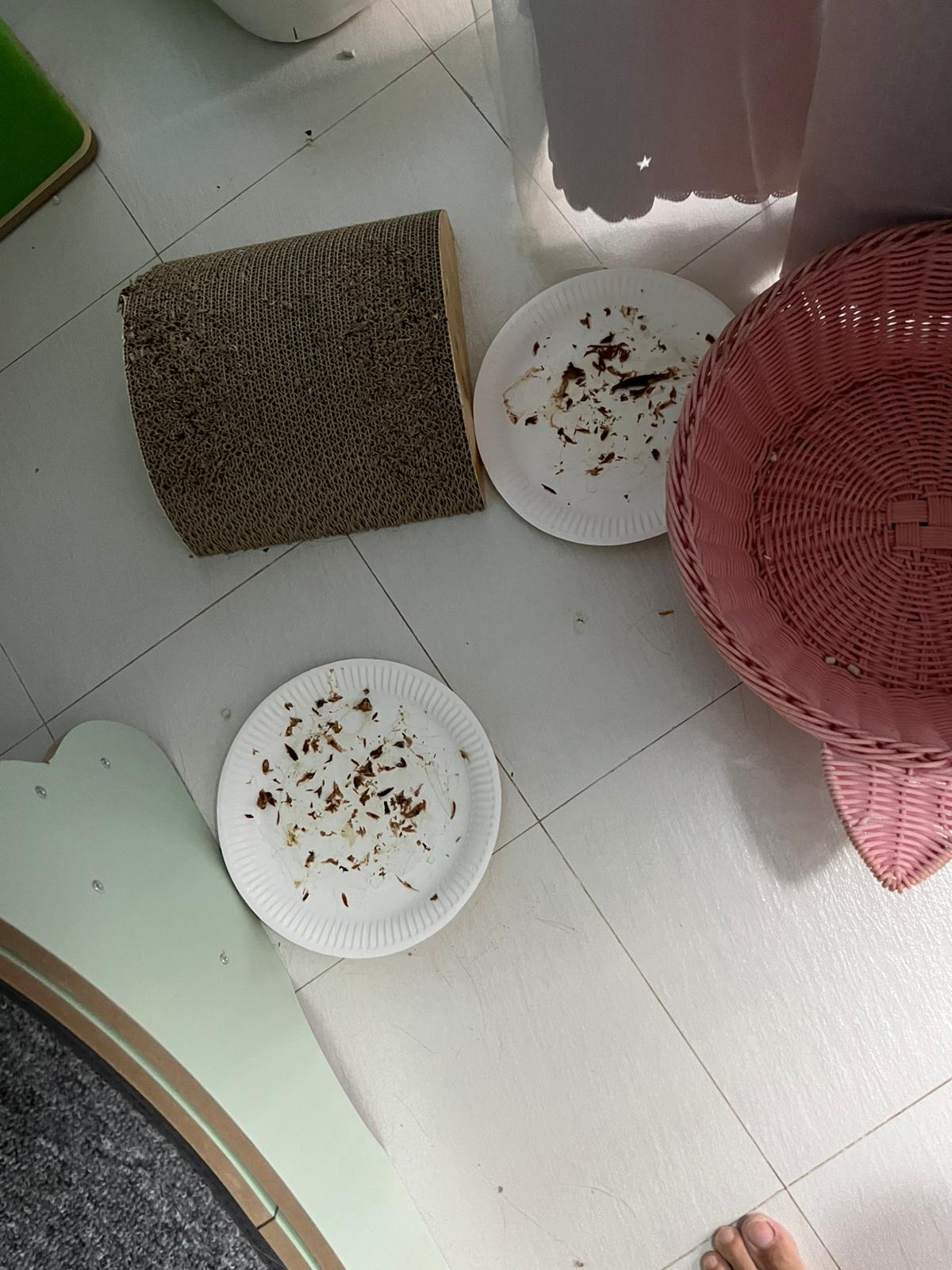 7.30am: disaster. They play w the spare litter. All over the floor. they will circle me for some time till they know I’m bz clearing the floor and they wait one side.