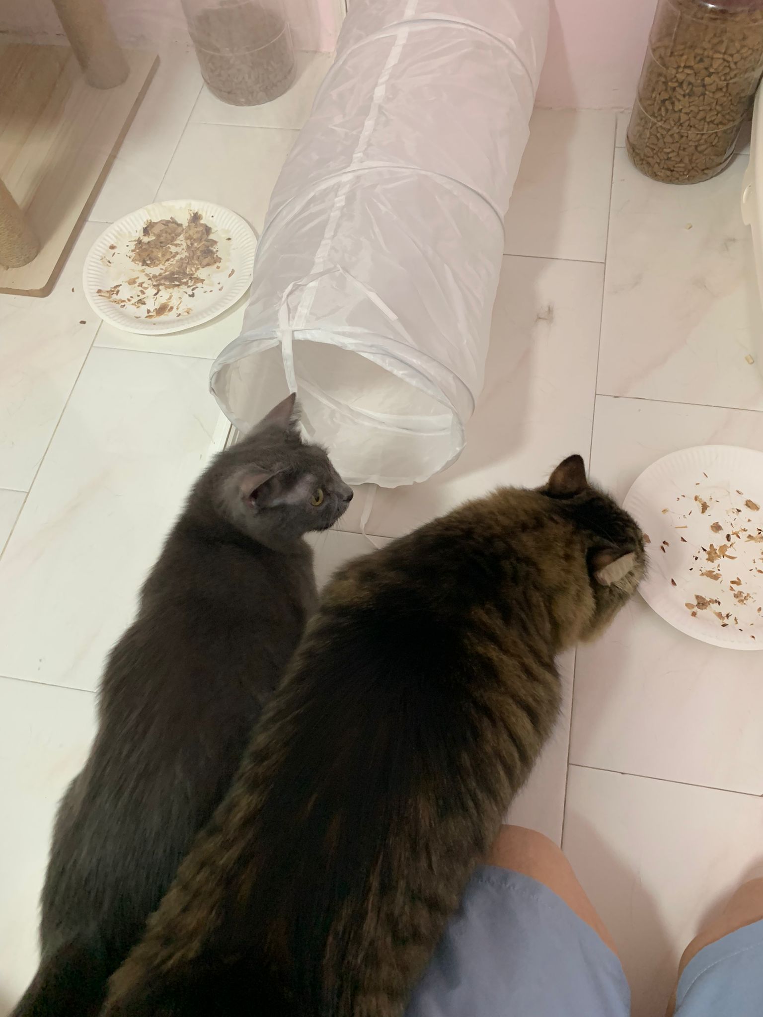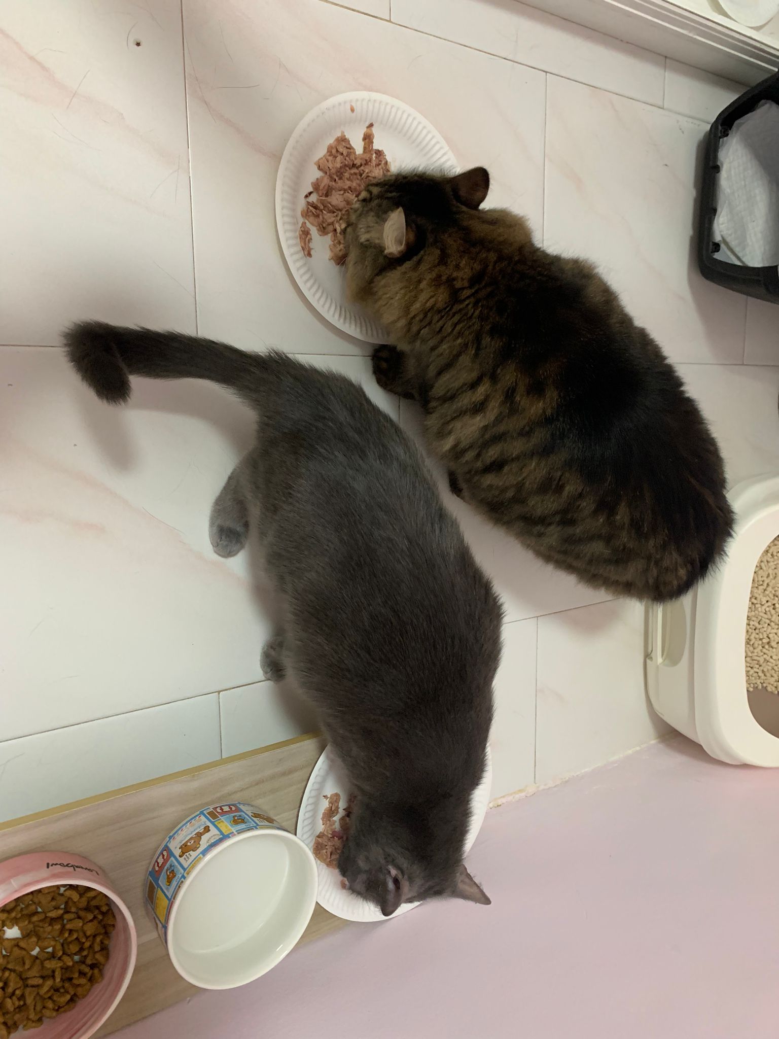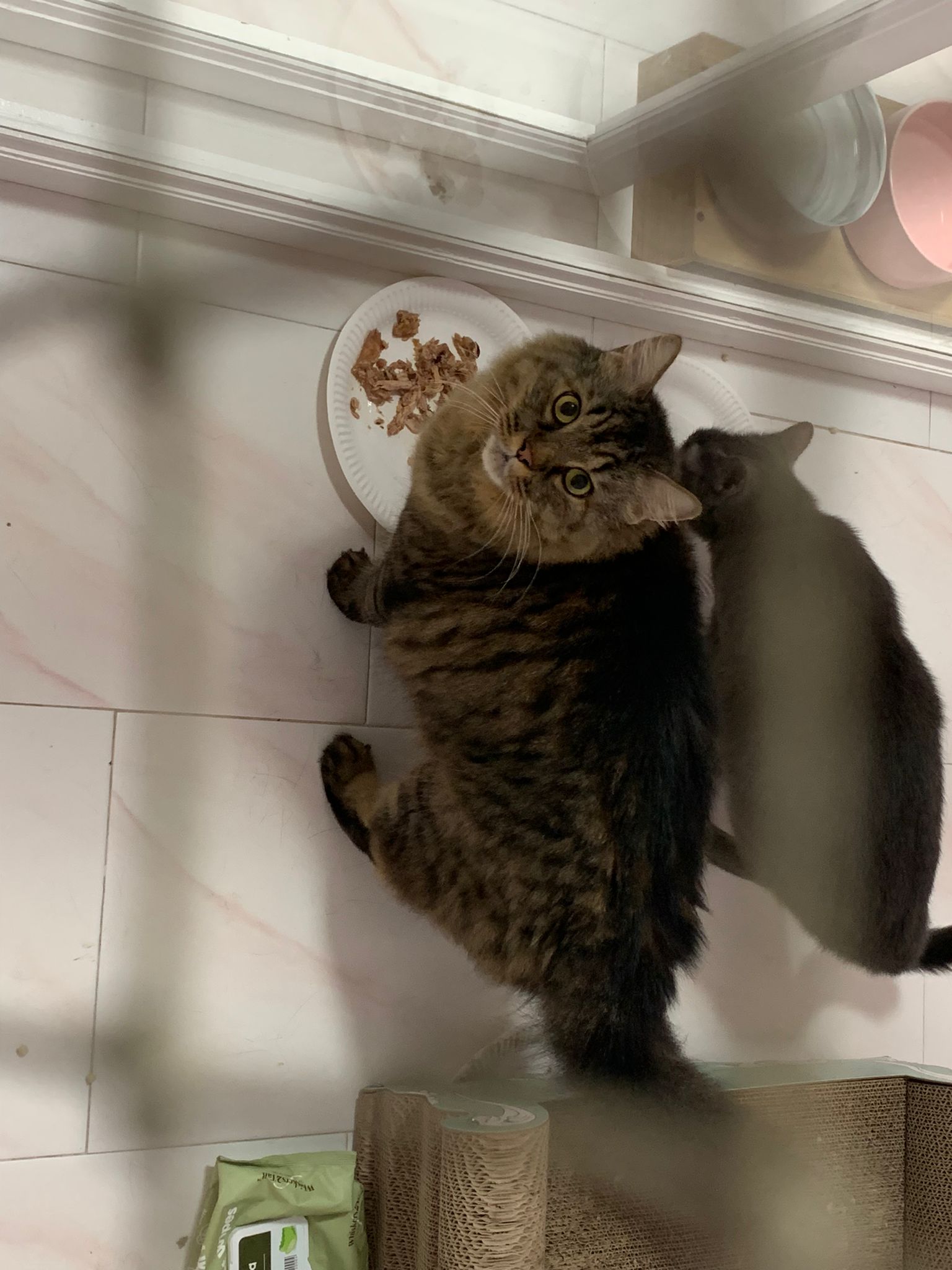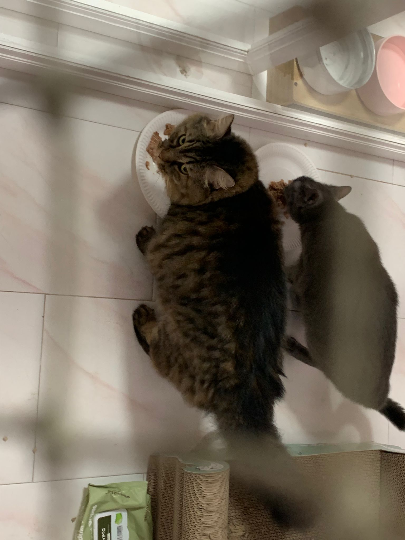 8am+: these 2 keep sticking to me, take videos also difficult. Photos can’t see face. Food confirm got eat but I think I can cut down. Got poo can’t differentiate one set or 2, but 2.75/10. Simba keep head butt me, head butt the sofa. Serve tuna w chicken ham.