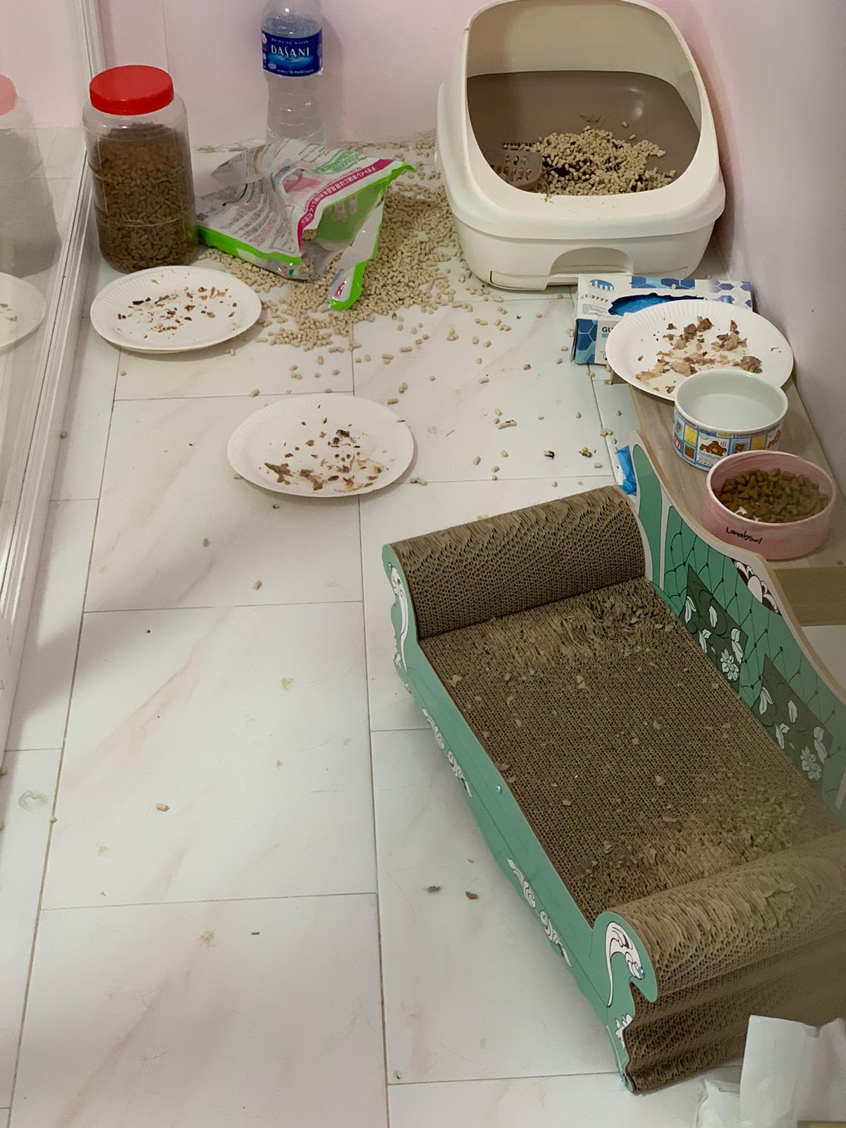 7.30am: disaster. They play w the spare litter. All over the floor. they will circle me for some time till they know I’m bz clearing the floor and they wait one side.