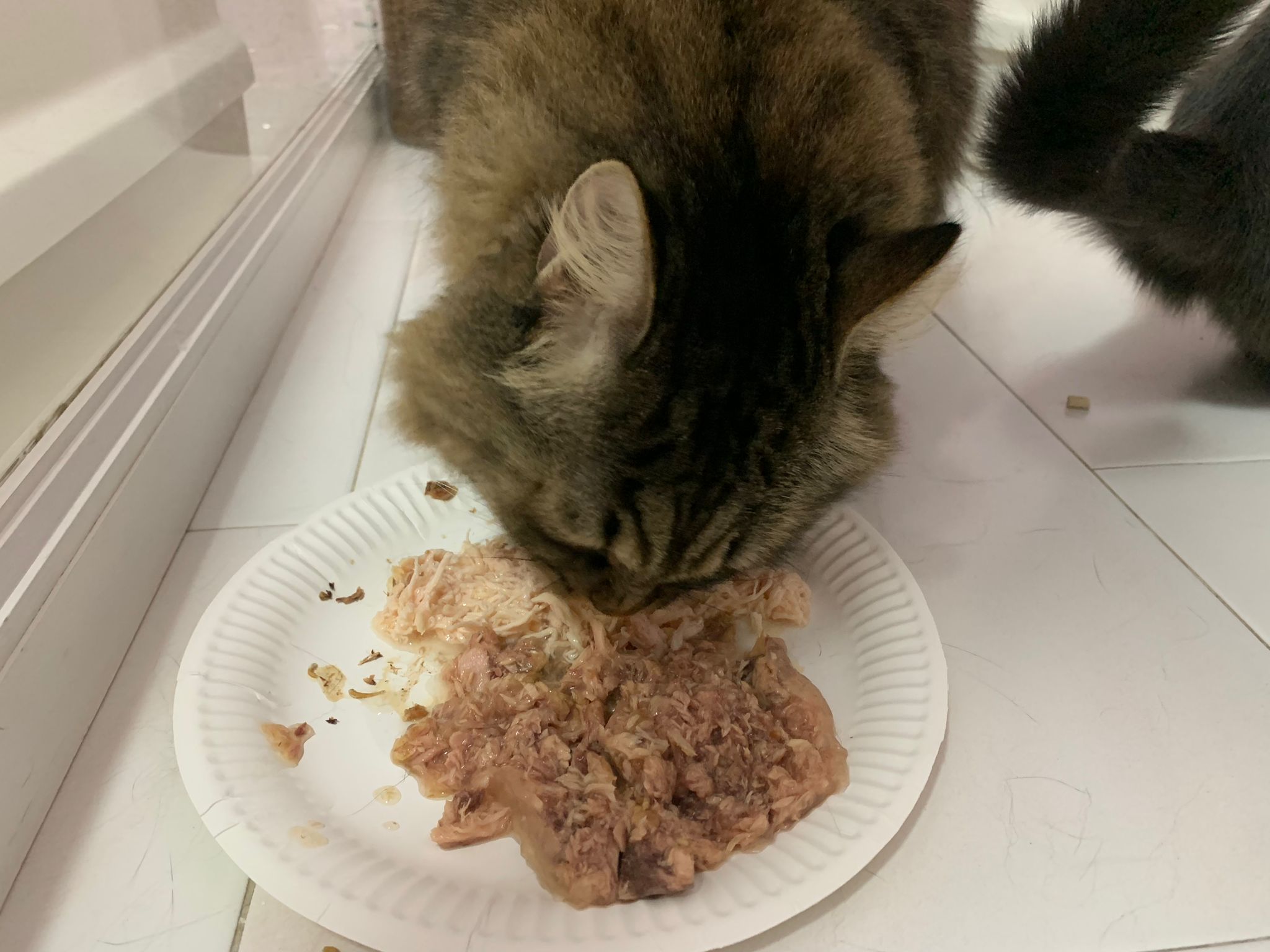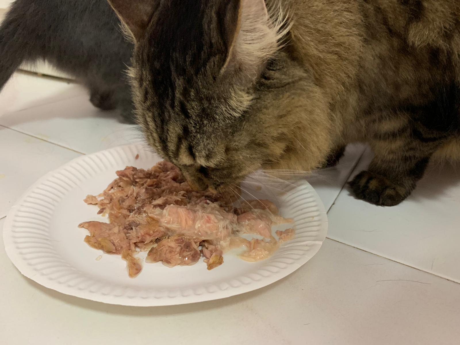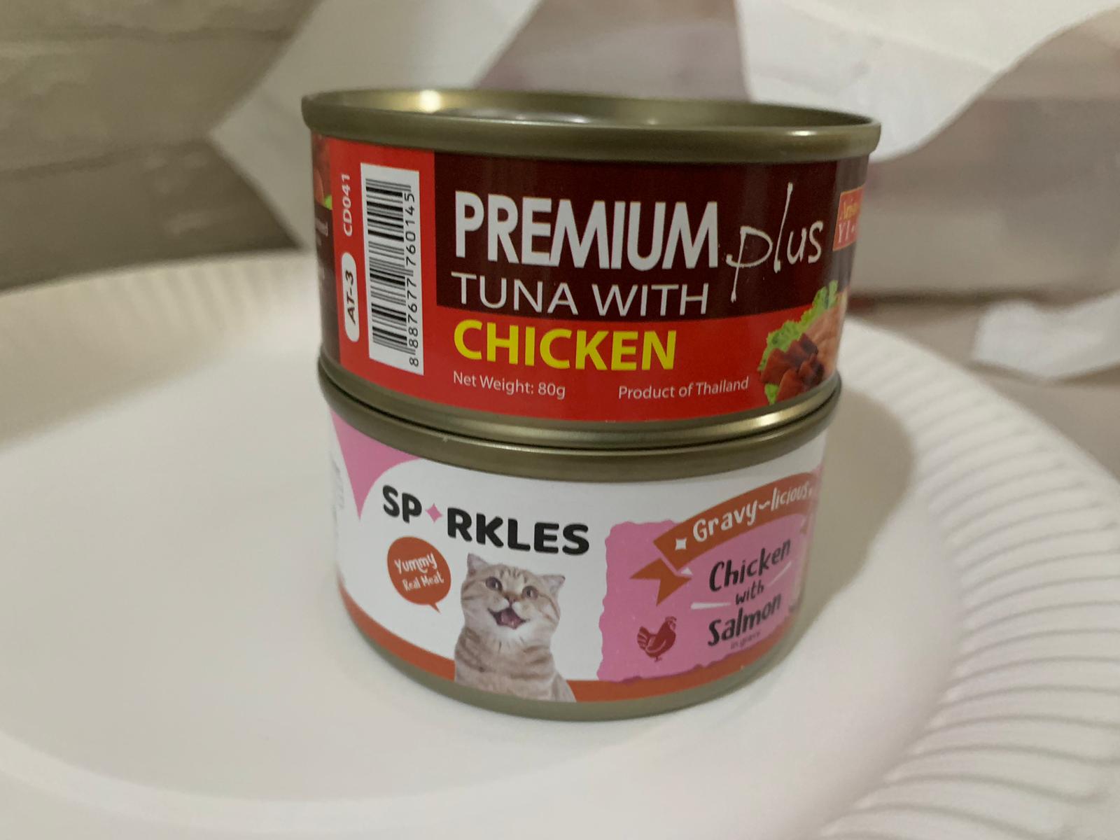 Serve a can of tuna w salmon, and a can of tuna w white fish. Not sure which plate/ flavour, but they don’t really like one of the flavour.
