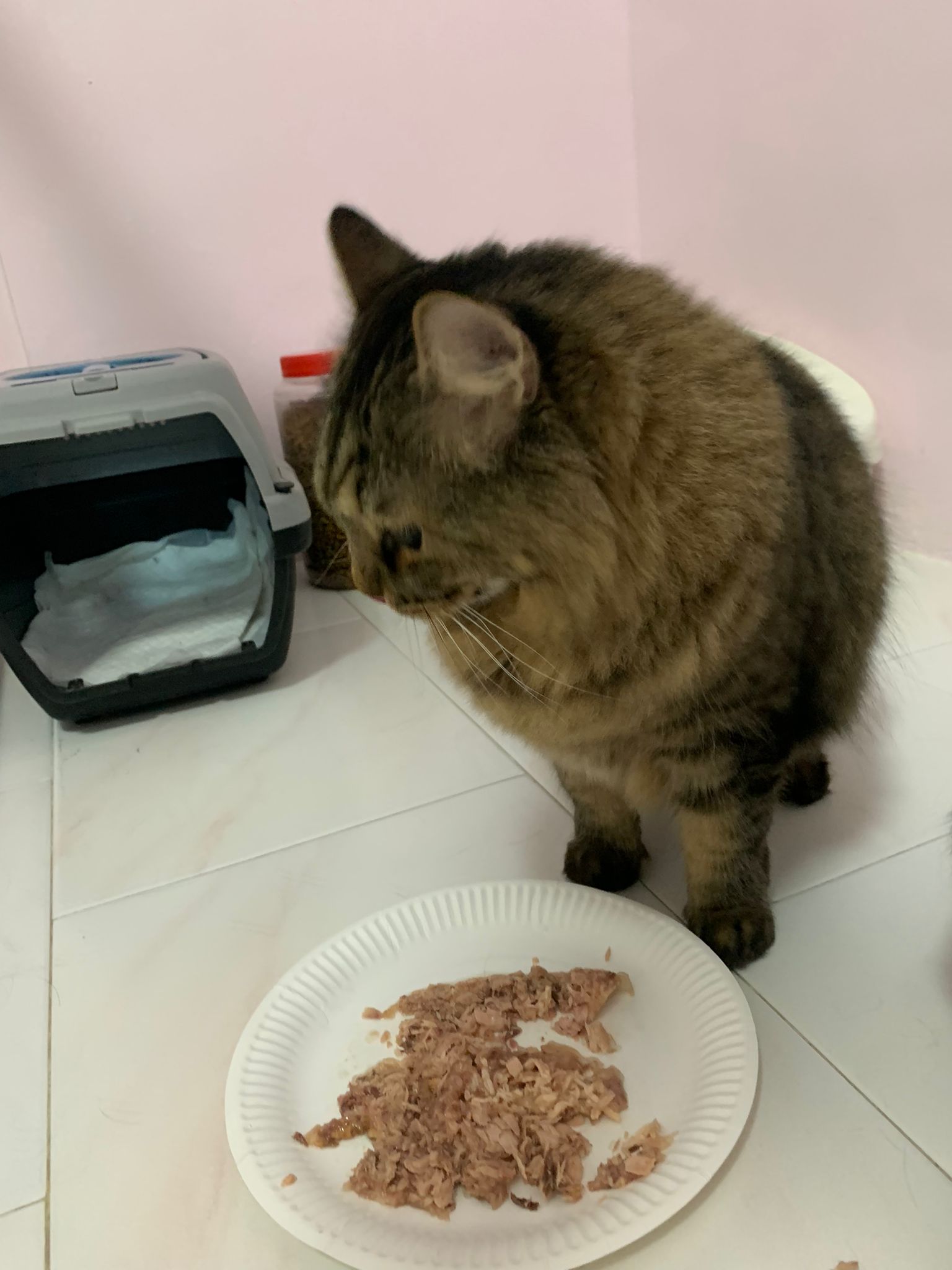 9am: serve tuna w chicken ham. Got a feel that he is feeling hungry but don’t like the food? Later I bring some food back fr 5G let him try diff type.