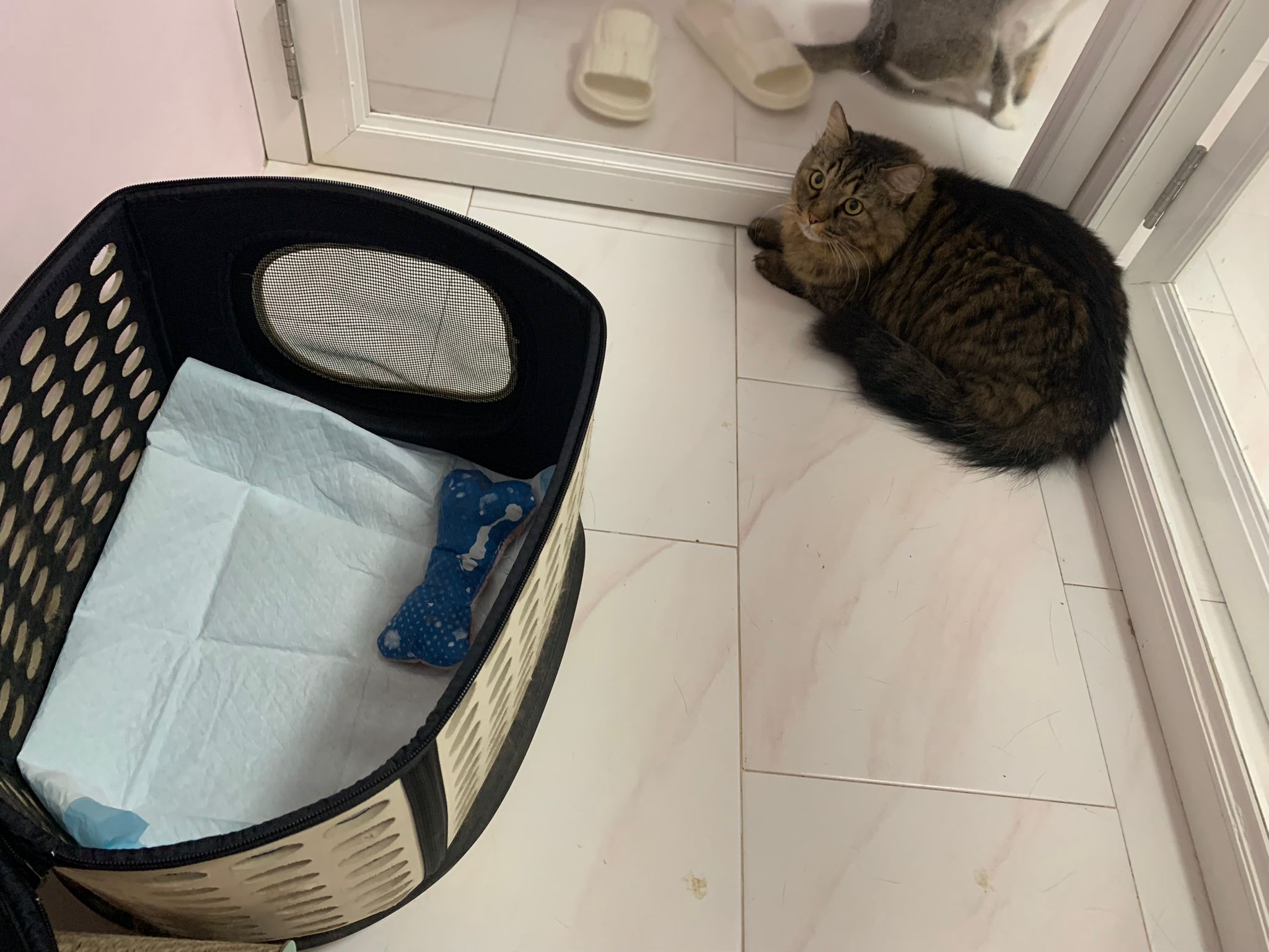 9pm+: wa one of them vomit out the 5pm chicken. serve tuna w chicken ham w aixia chicken immunity pouch. Say bye bye to both. They know somehow. Plus I bring in their carriers. I thought one of them might sit in it. None did. Kiss Simba bye bye. Put new Peepad for him.