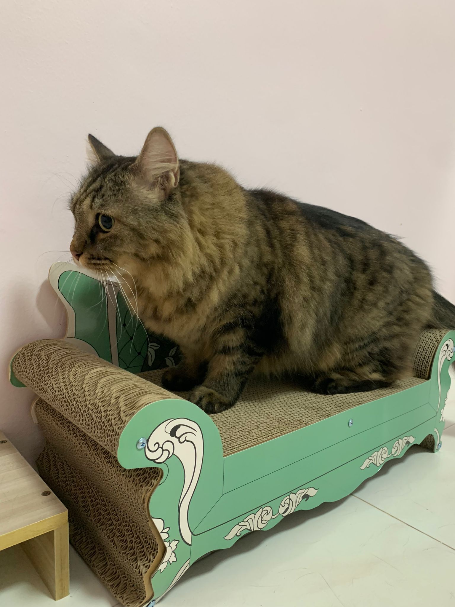 4pm: serve tuna w chicken, he got eat but not as fast as rumi. Got scratch the sofa also. left one carrier box in room for him – he needs the hideout more than rumi.