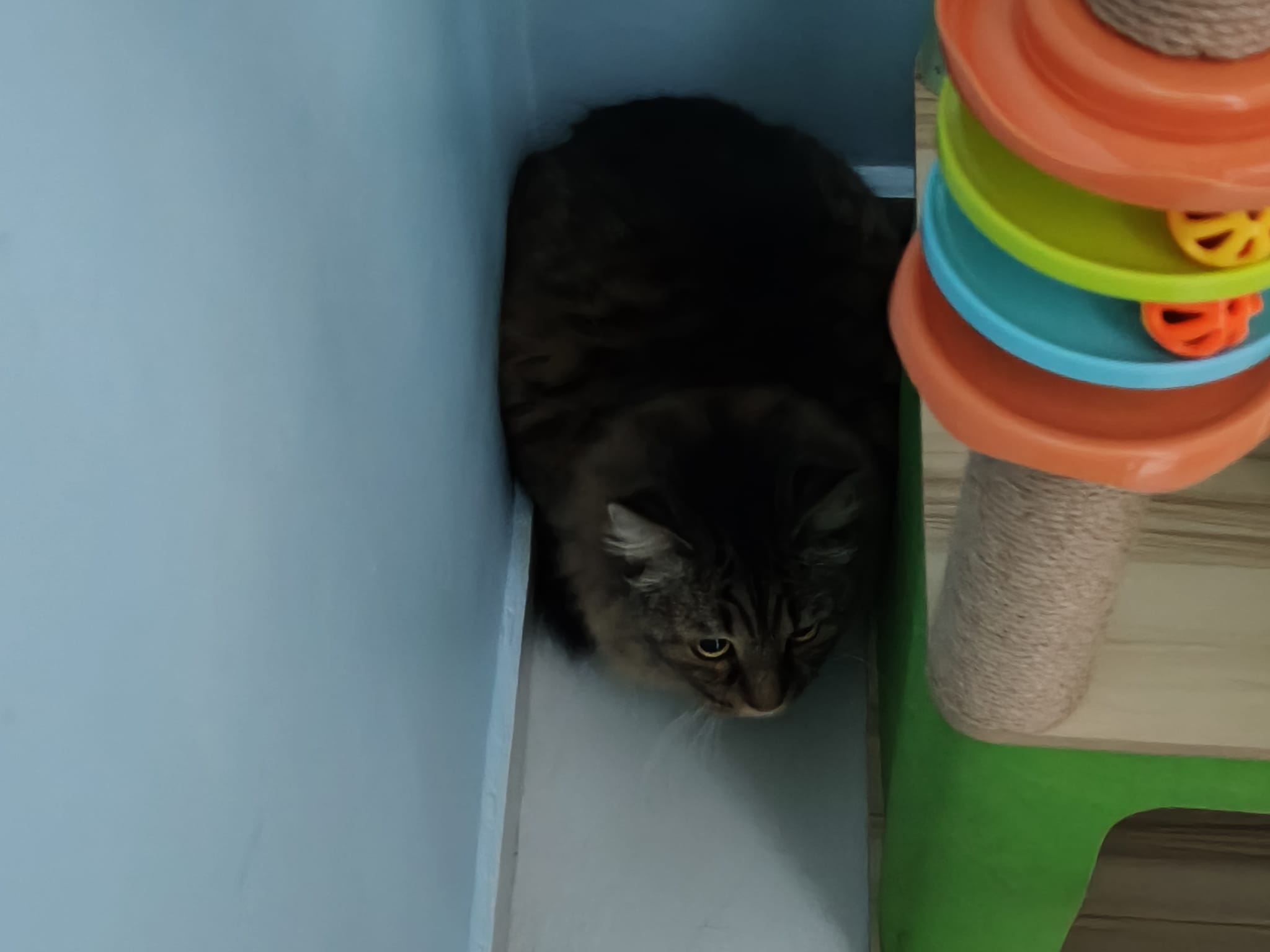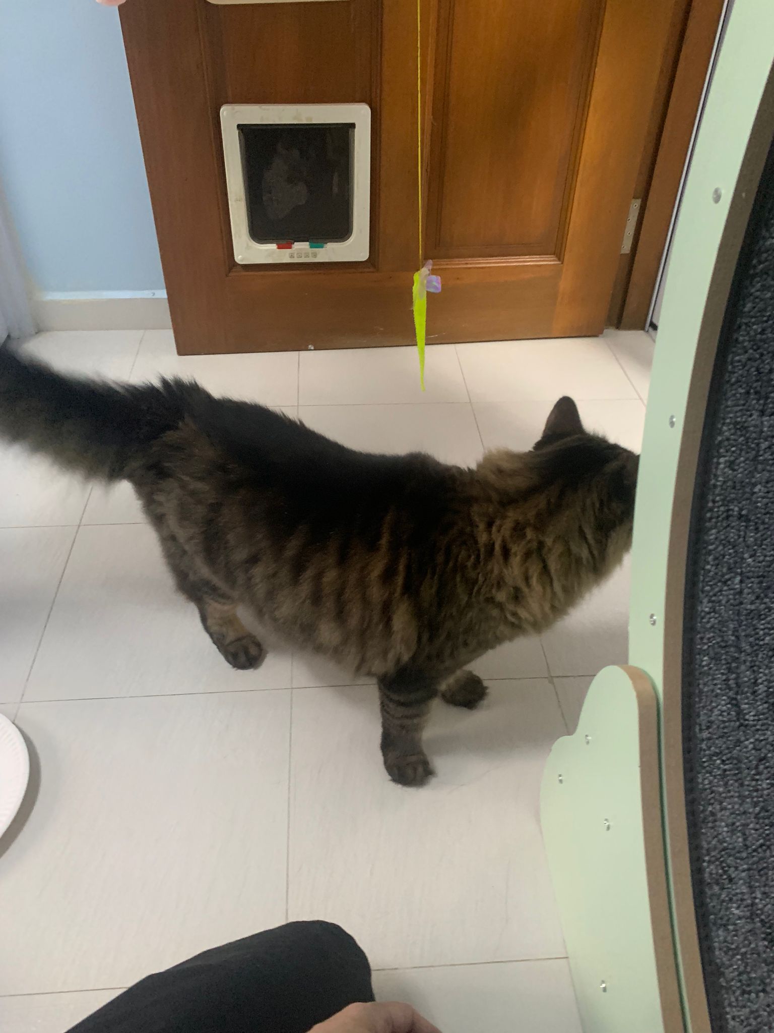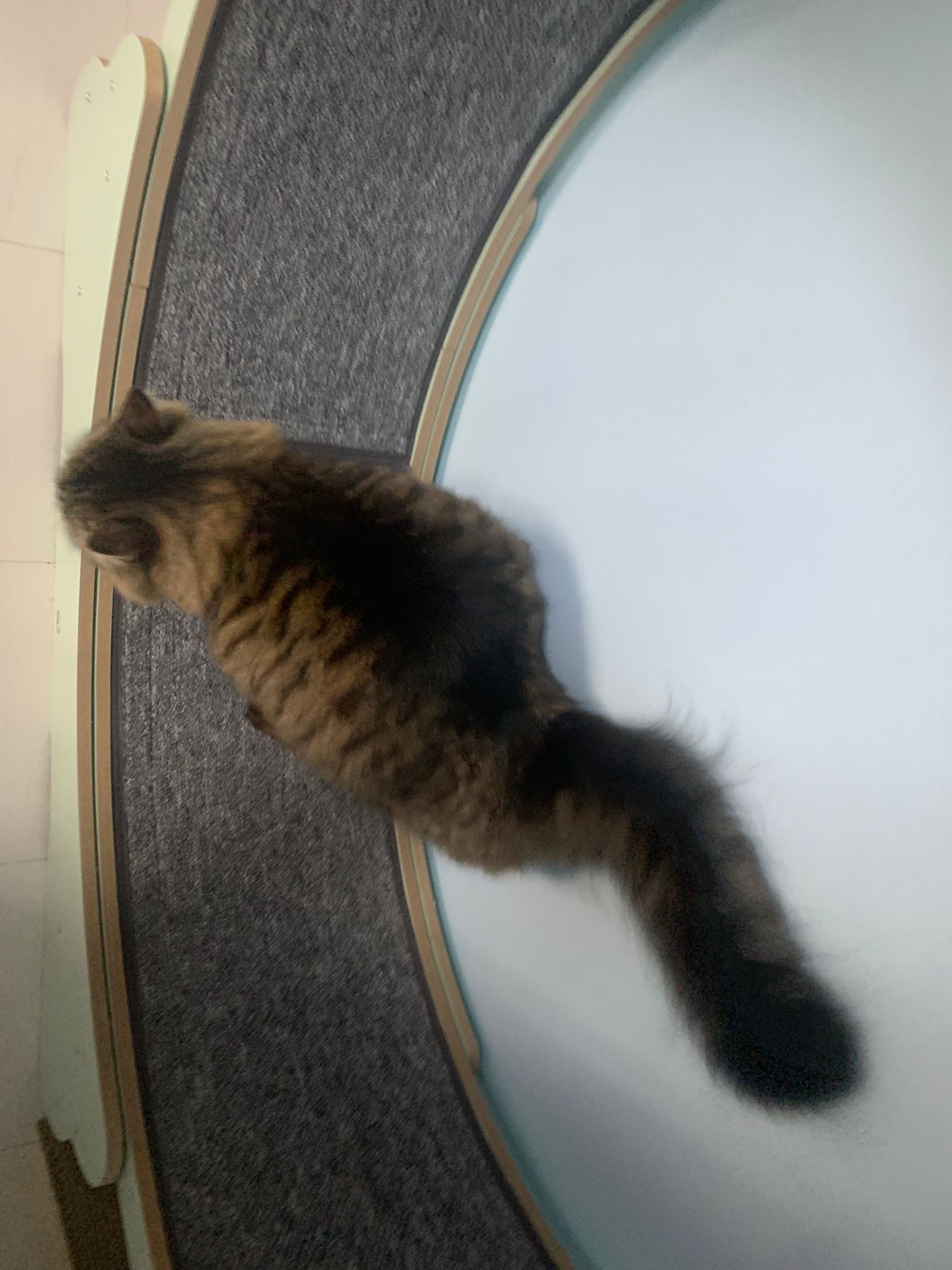 Carry him onto the wheel, come down instantly, didn’t even try. Keep wanting sayang non stop but each time I step into the room he greet me w a hiss first then come rub n circle me.