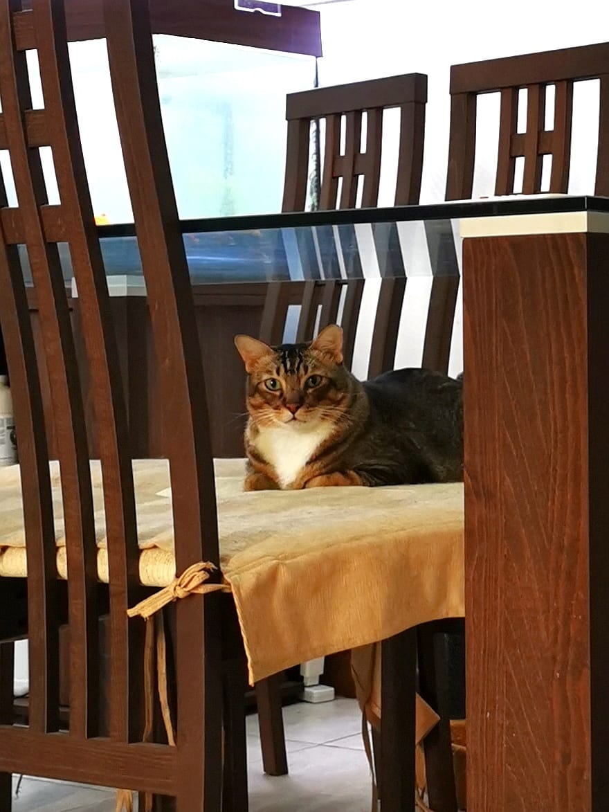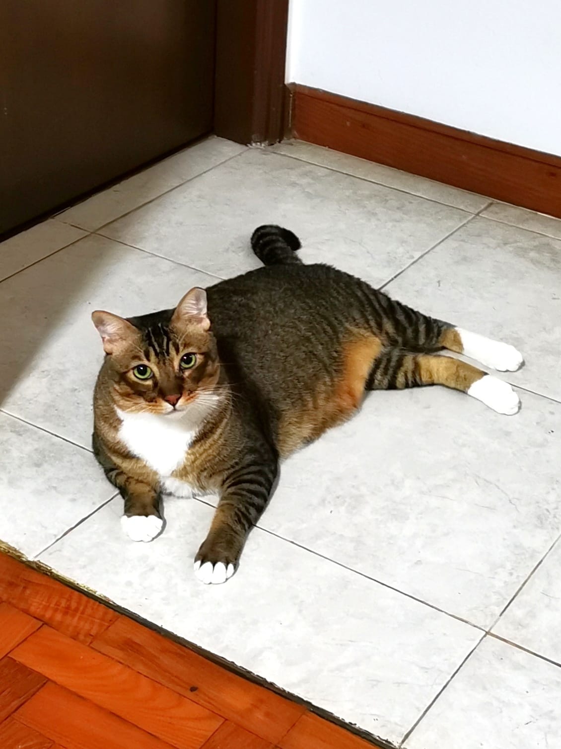 This cat sit like a dog. From a fearless of human cat, I can sayang him and kiss him now. But any moment he feel that I’m going to catch him (he once got flu n I got to medi him) he will run away from me.