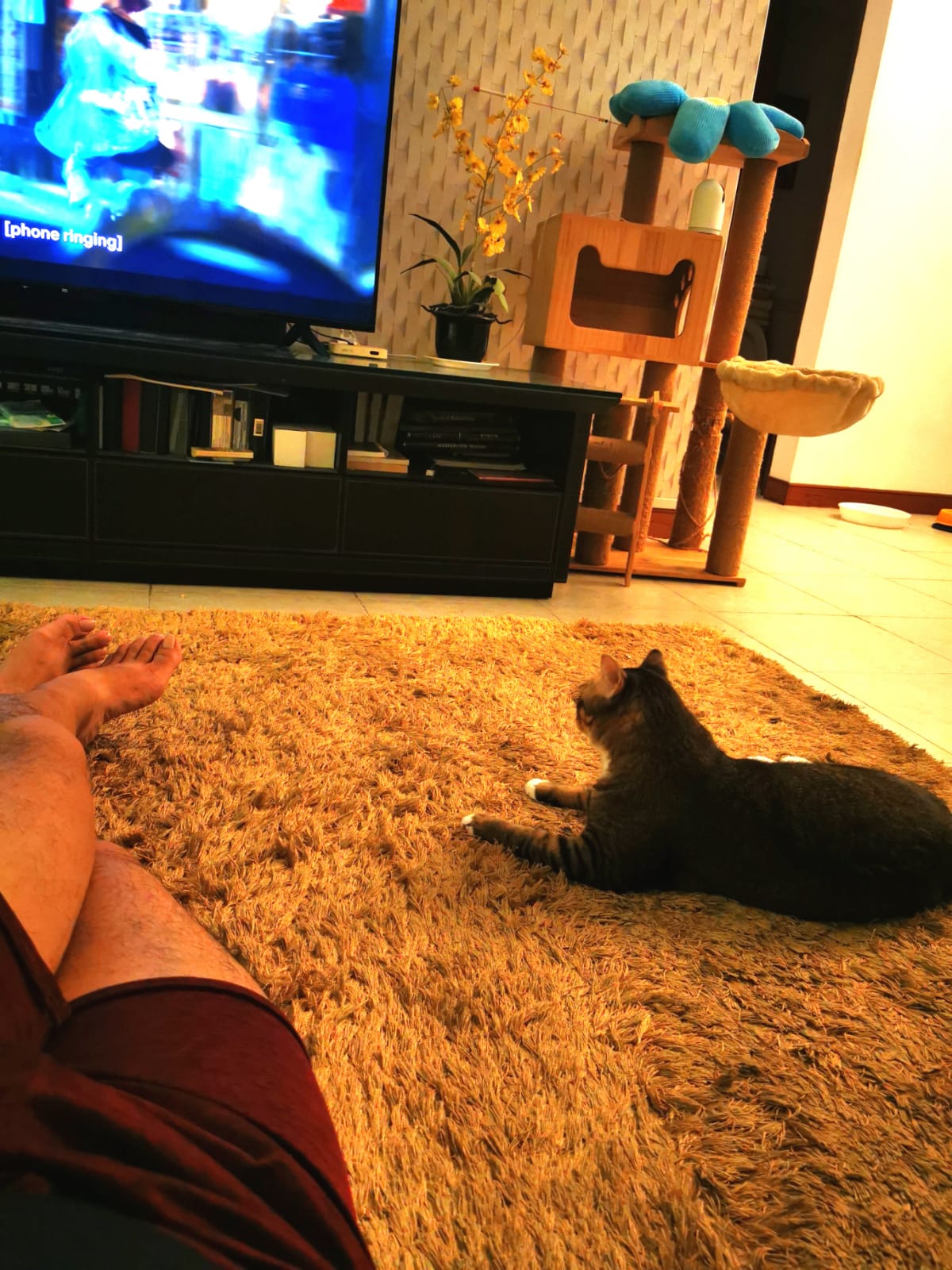 638pm: update “Too lazy to move. I can hand him treats now.”