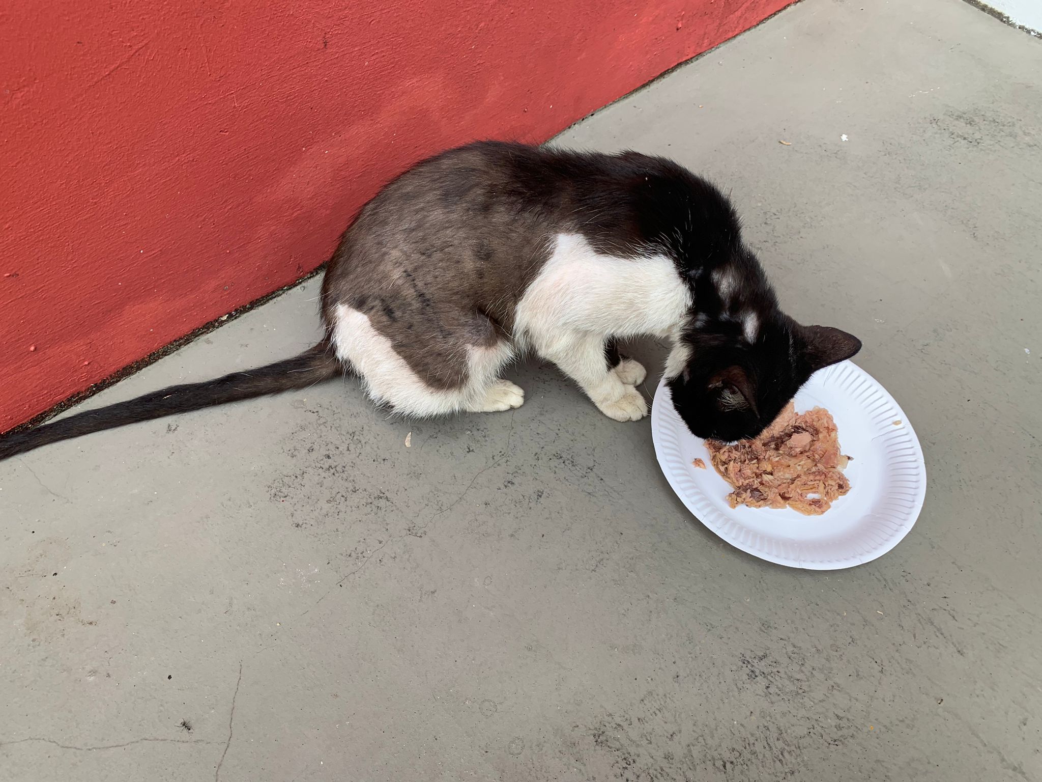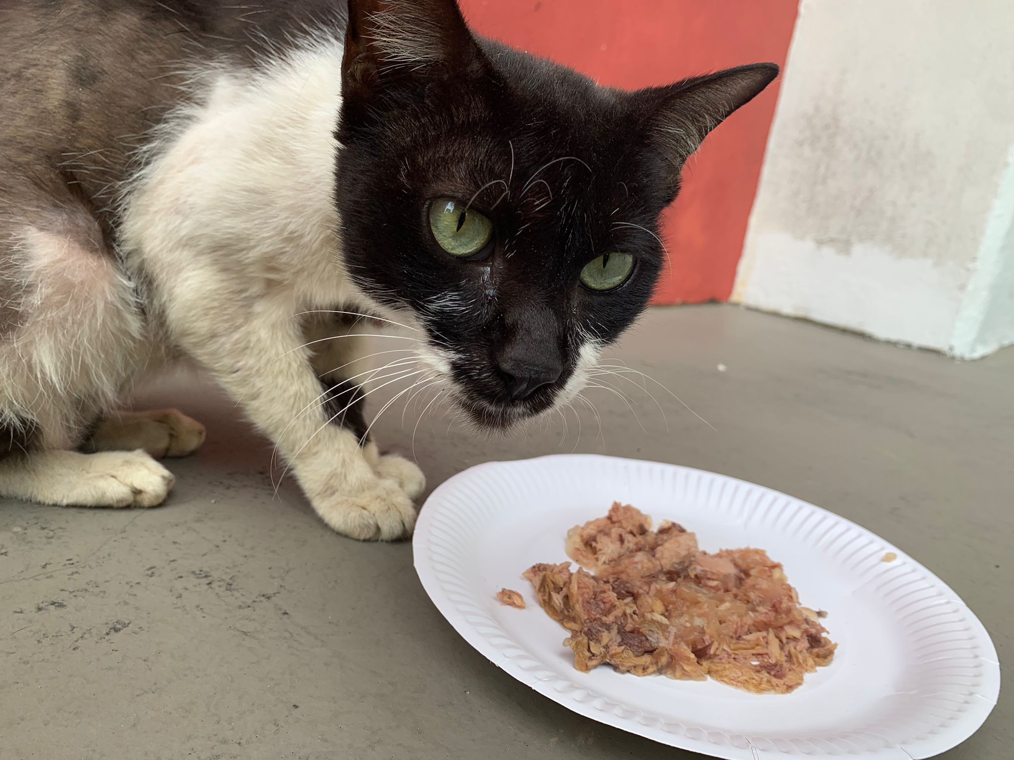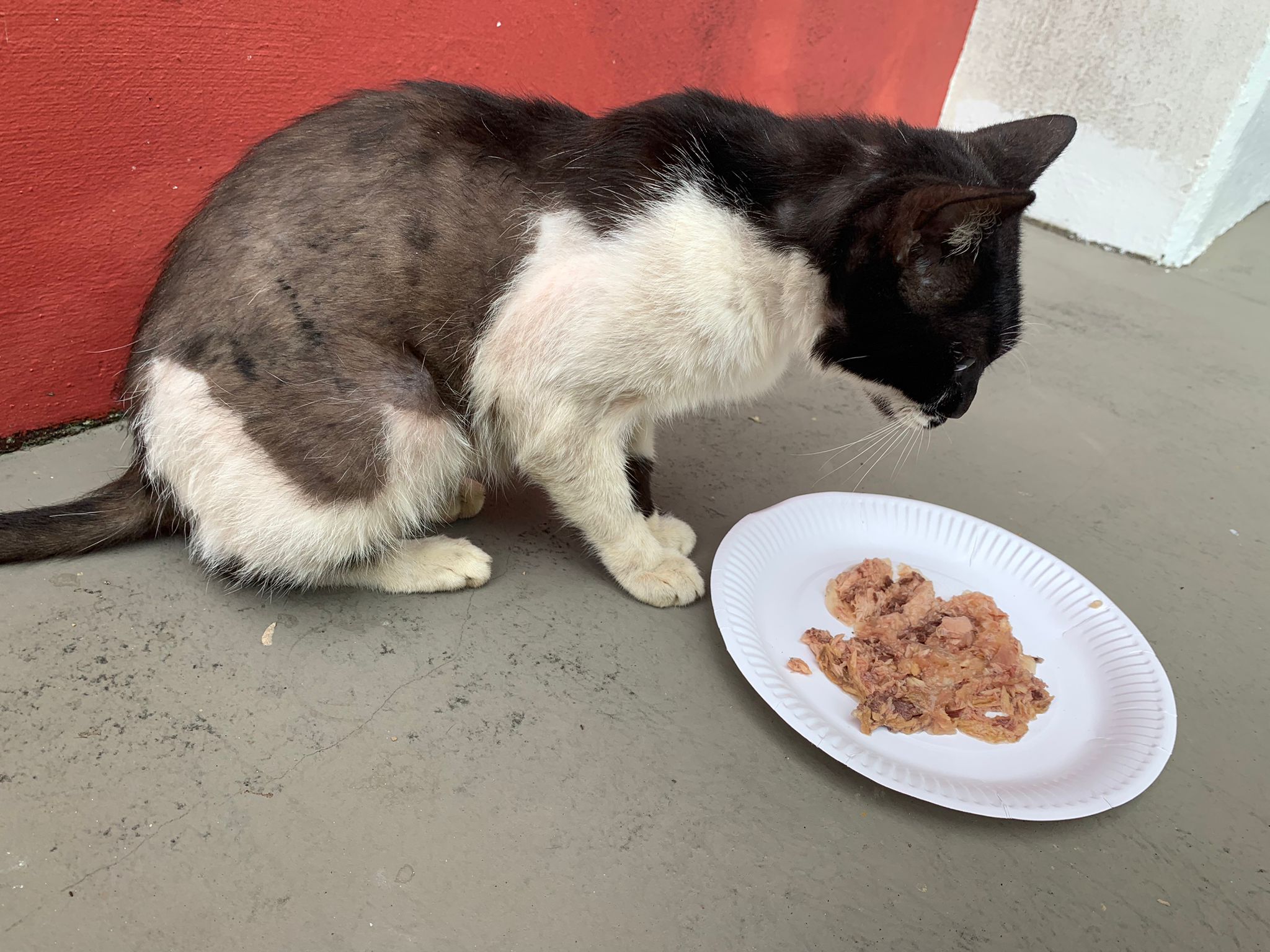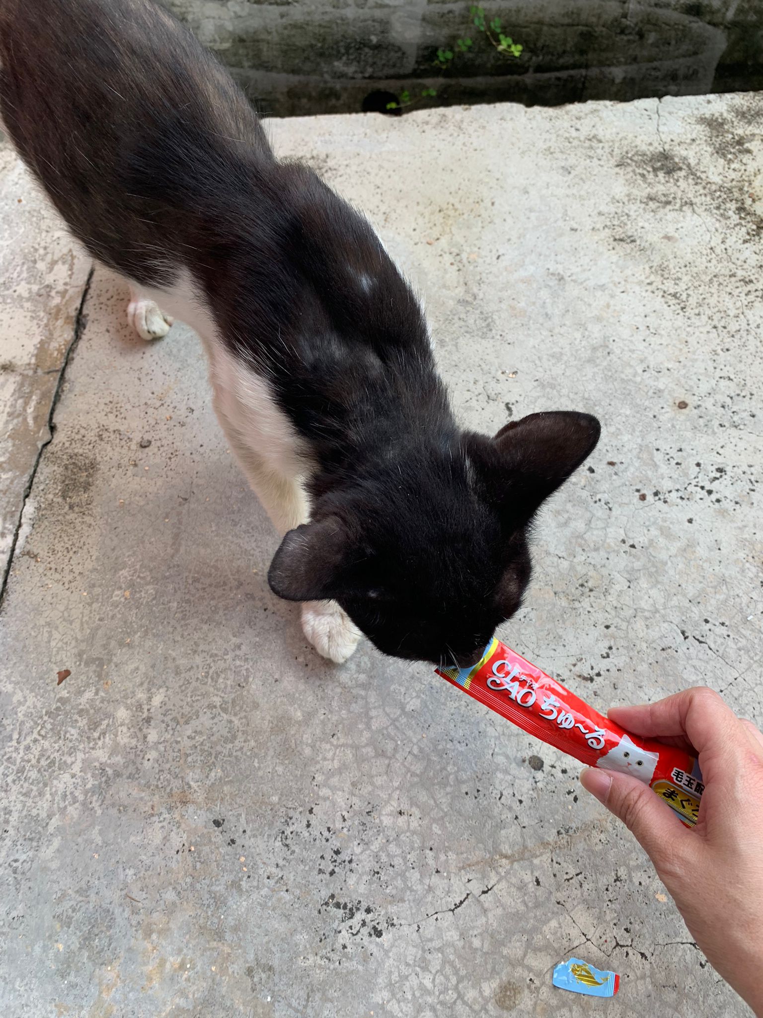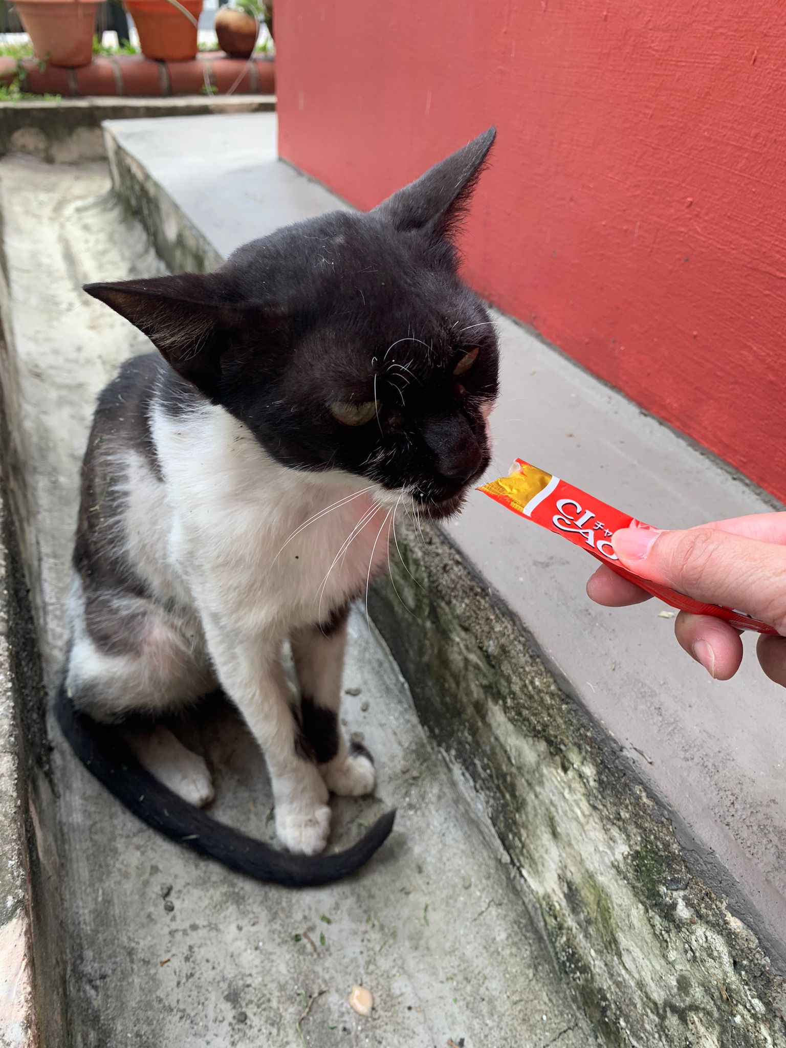 Since she don’t eat my wet food I visit her w ciao treat. She is in hidden drain but she come out for the treat. Confirm eat b4. But keep growl when licking I feel she will attack me. Sigh