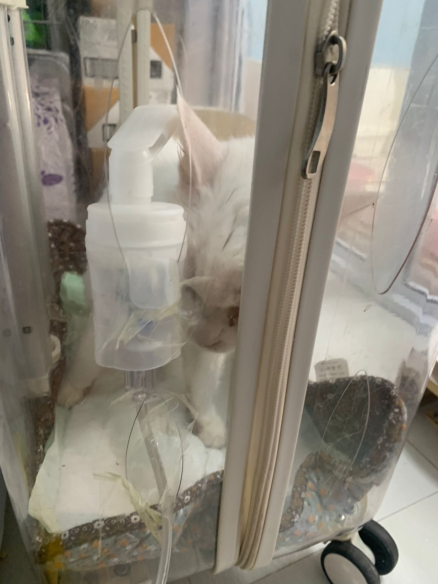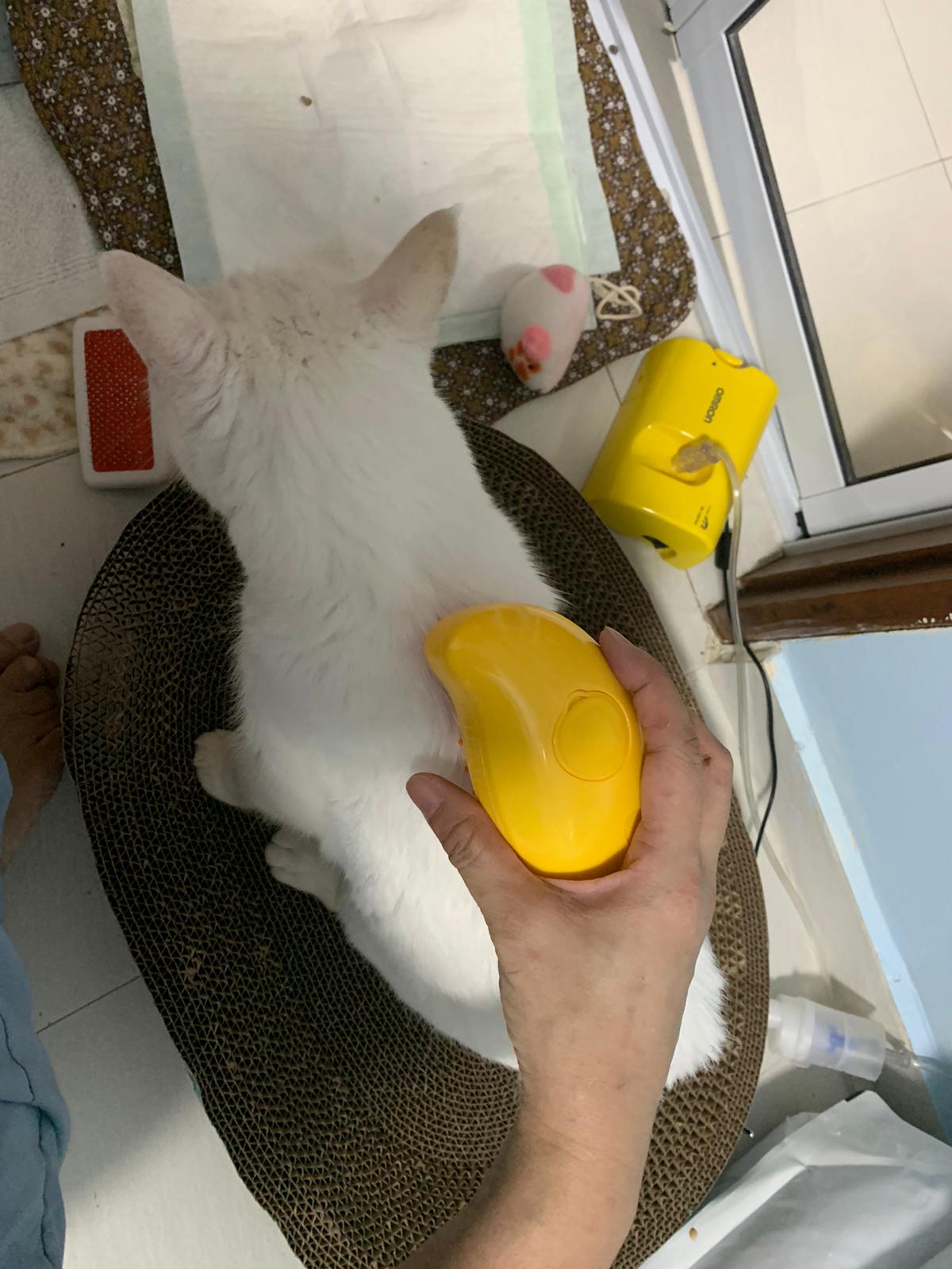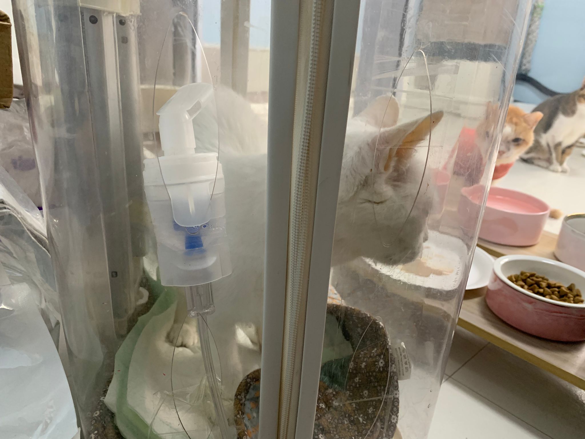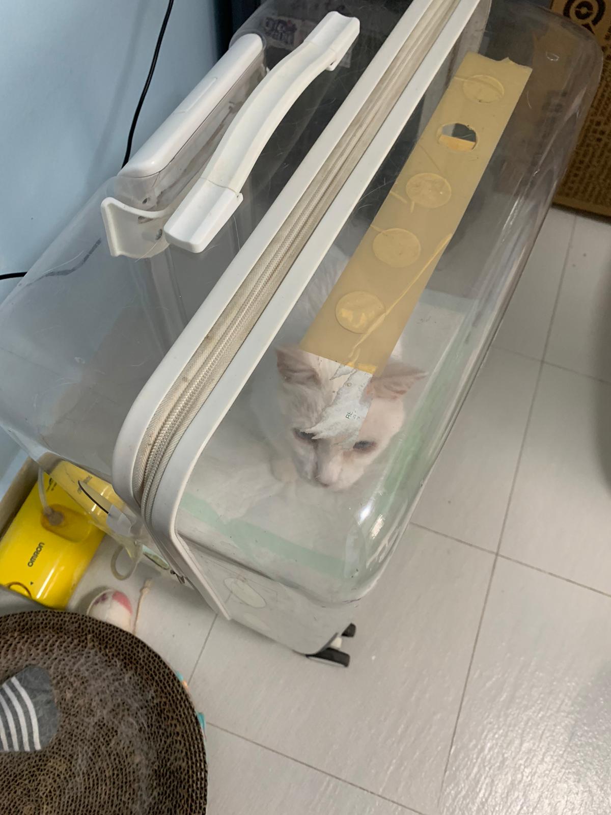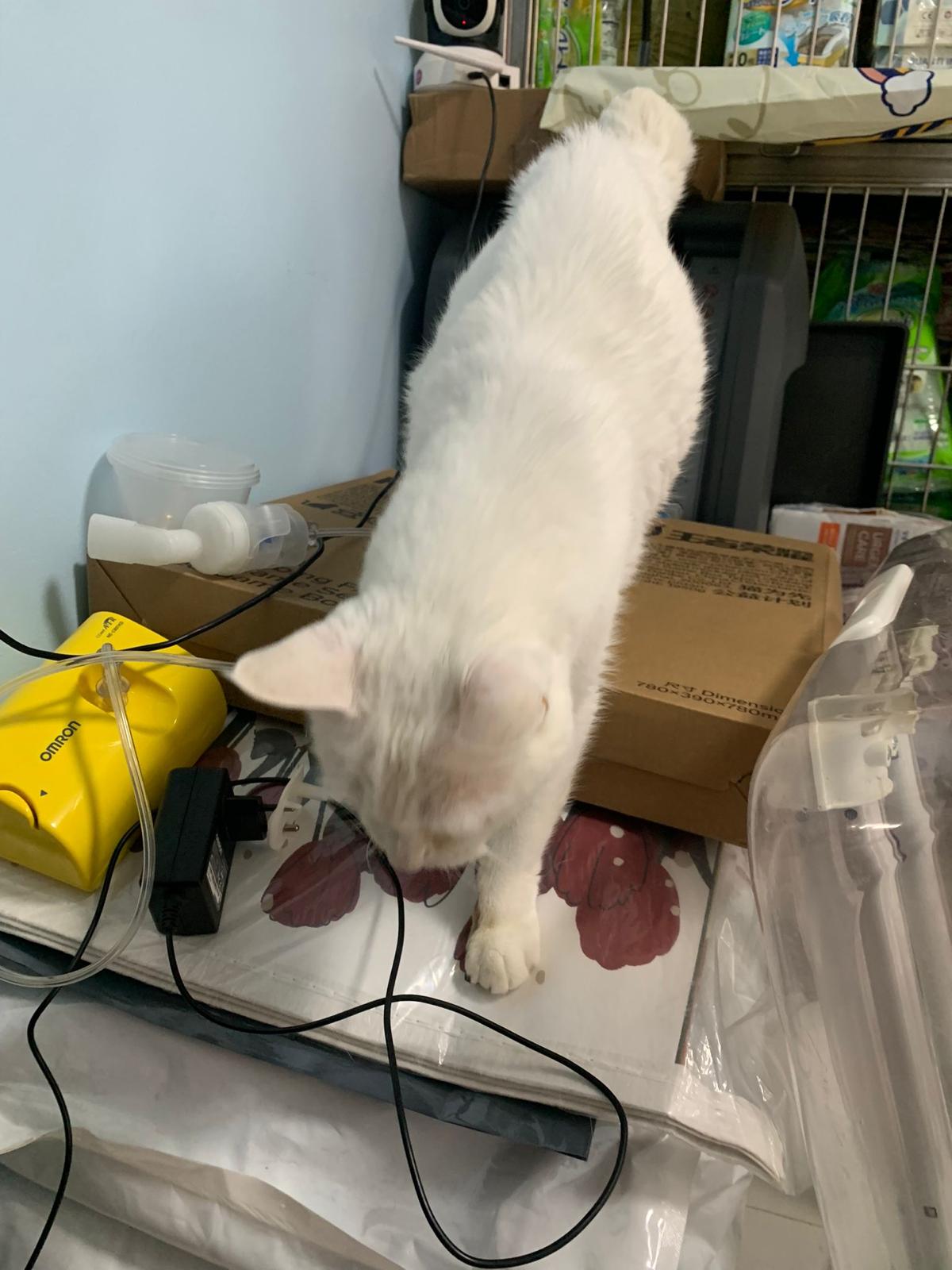 12.50pm: off nubulizing, clean her nose further. Look better. o2 remain in the room, she walk to bin again. Sayang her told her I go back to 猫房 to medicate the cats le.