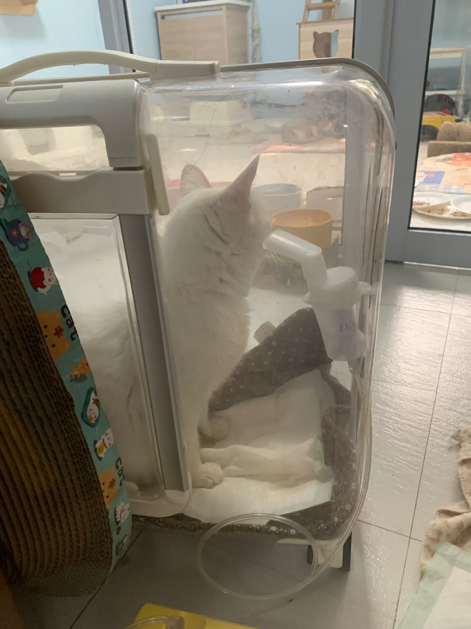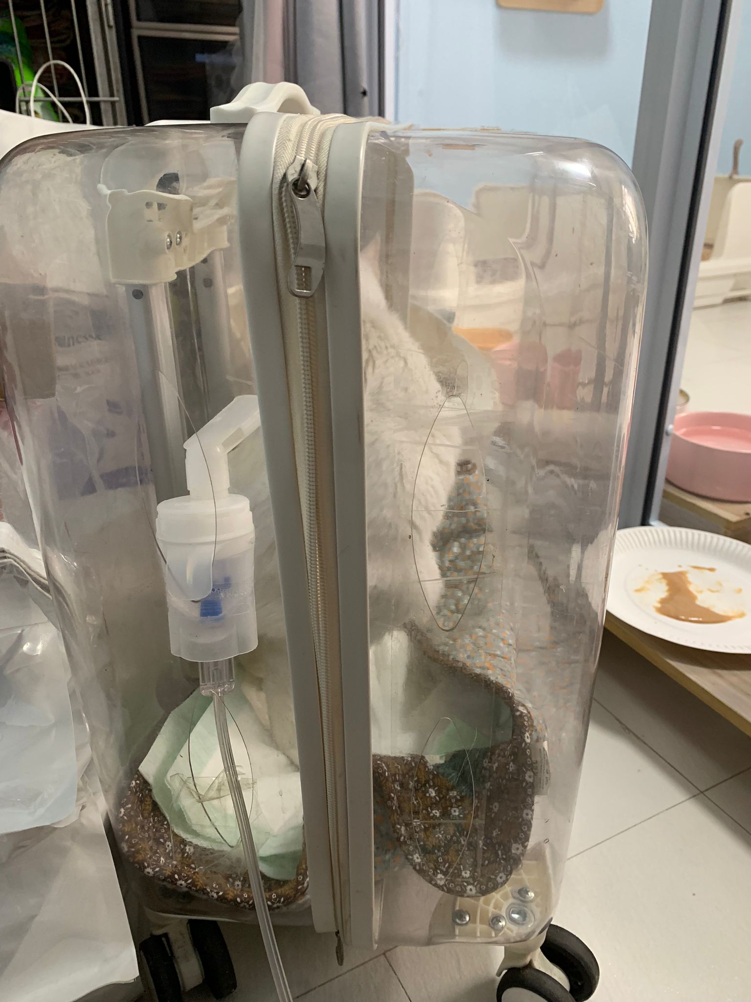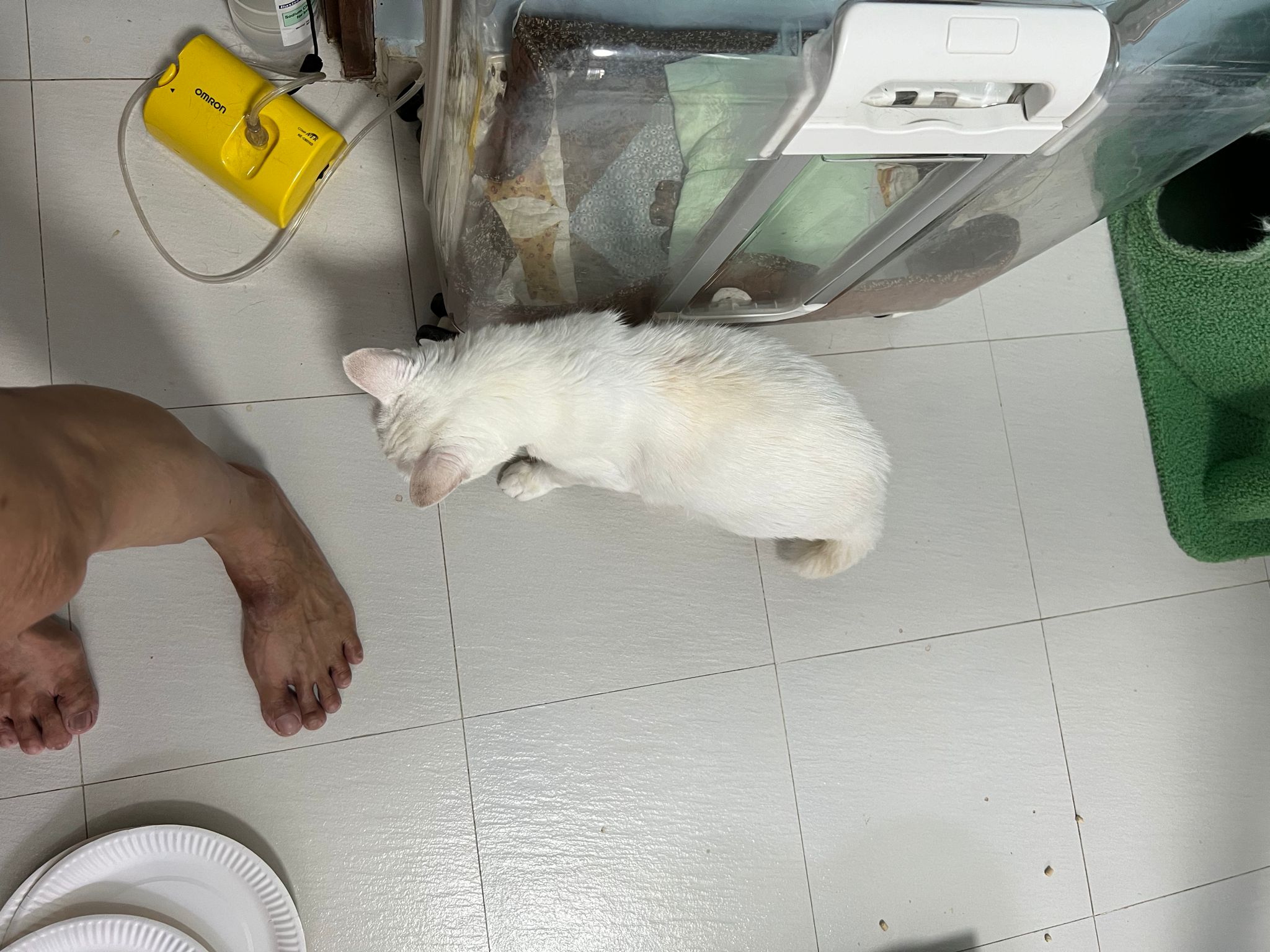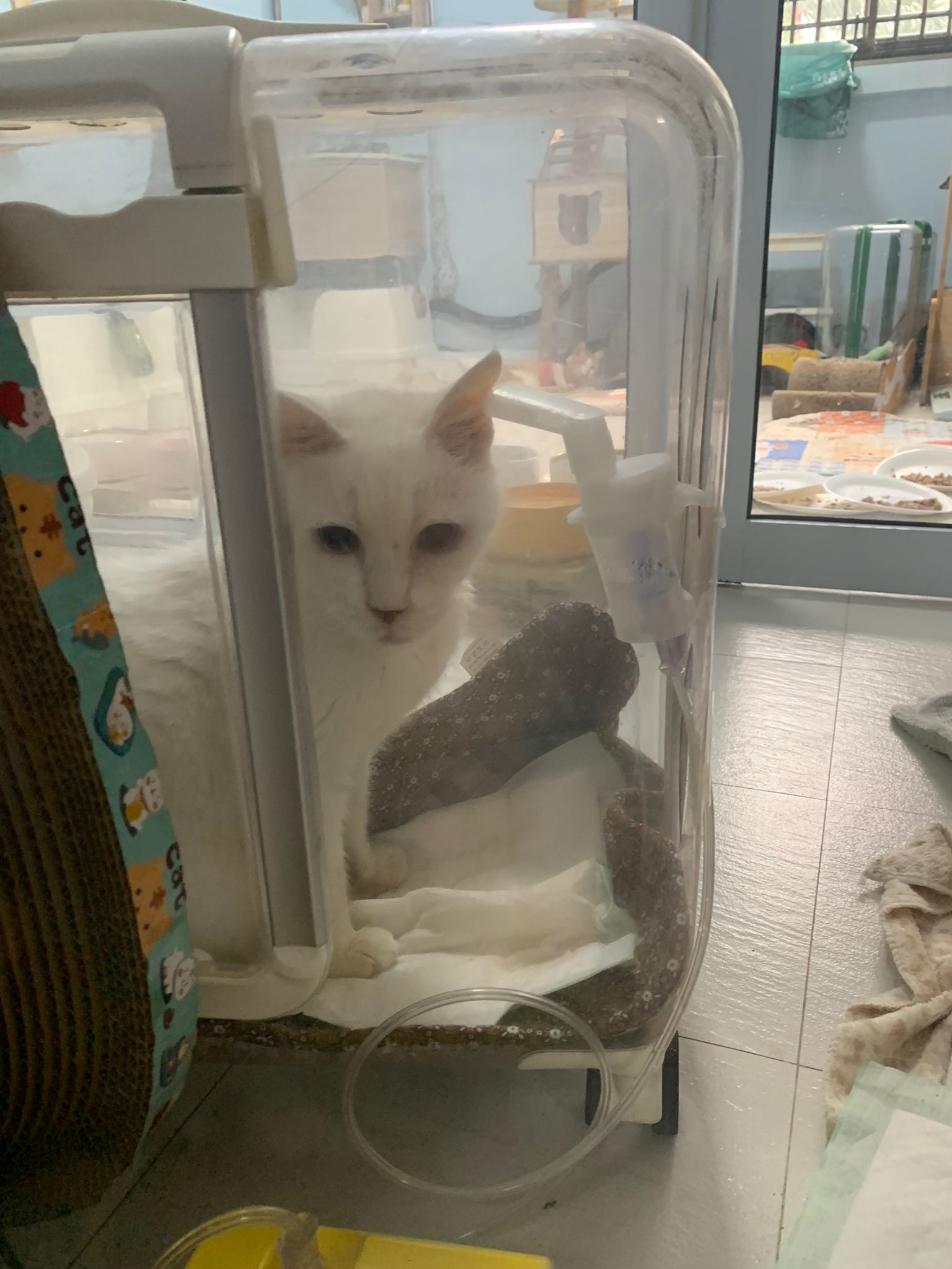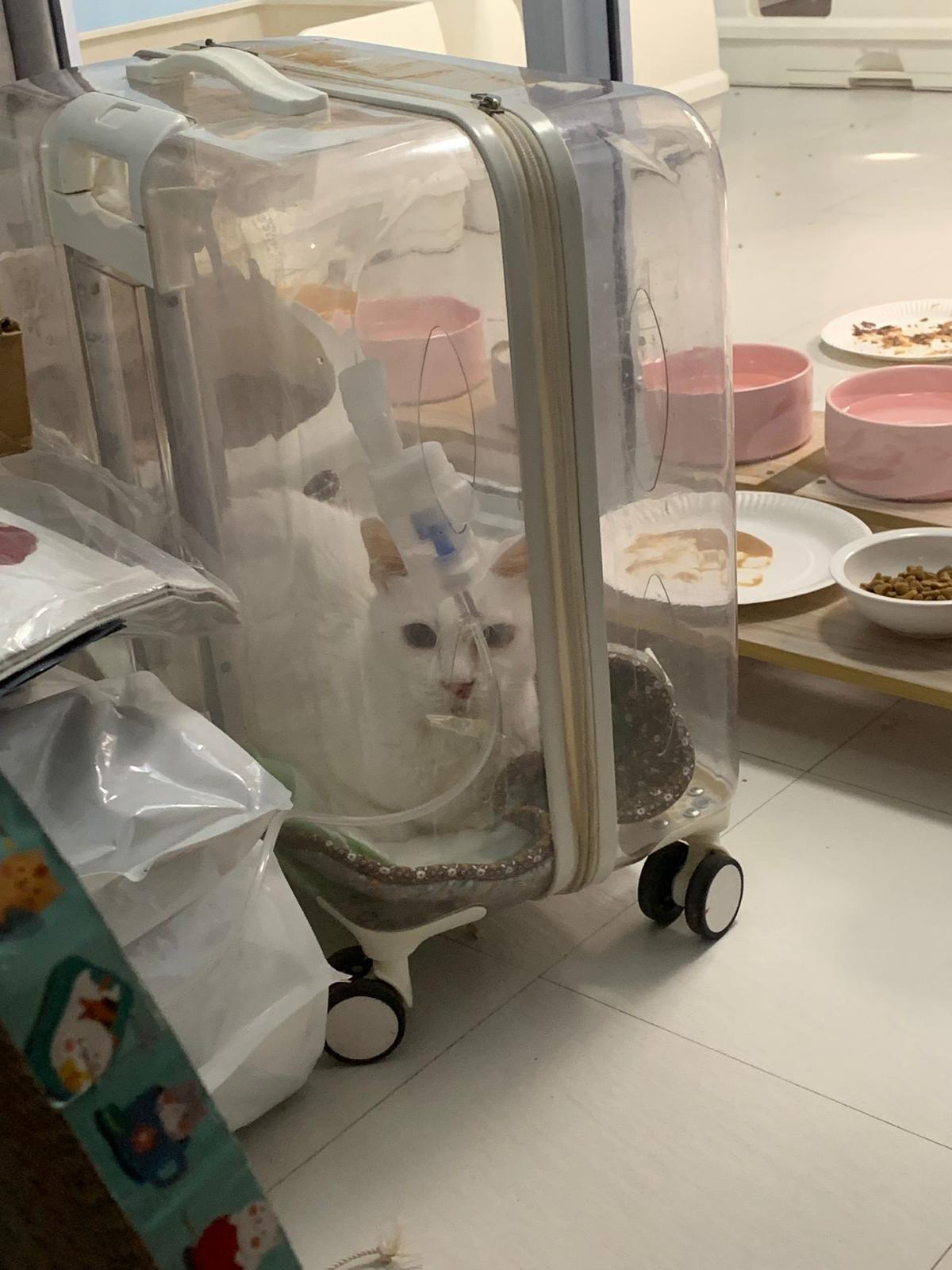 12.50pm: off nubulizing, clean her nose further. Look better. o2 remain in the room, she walk to bin again. Sayang her told her I go back to 猫房 to medicate the cats le.