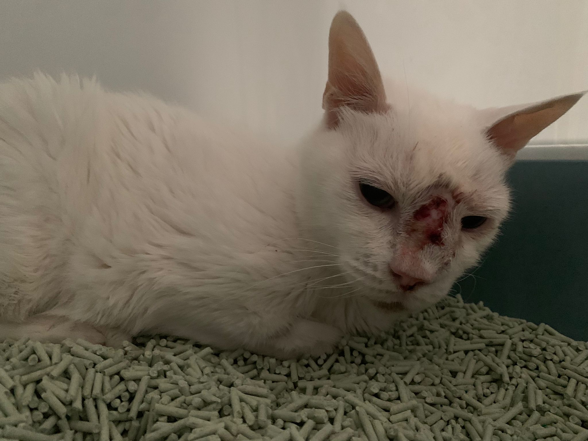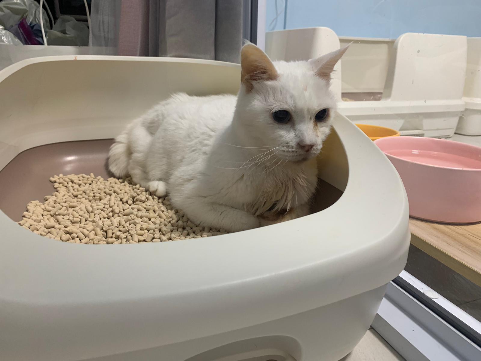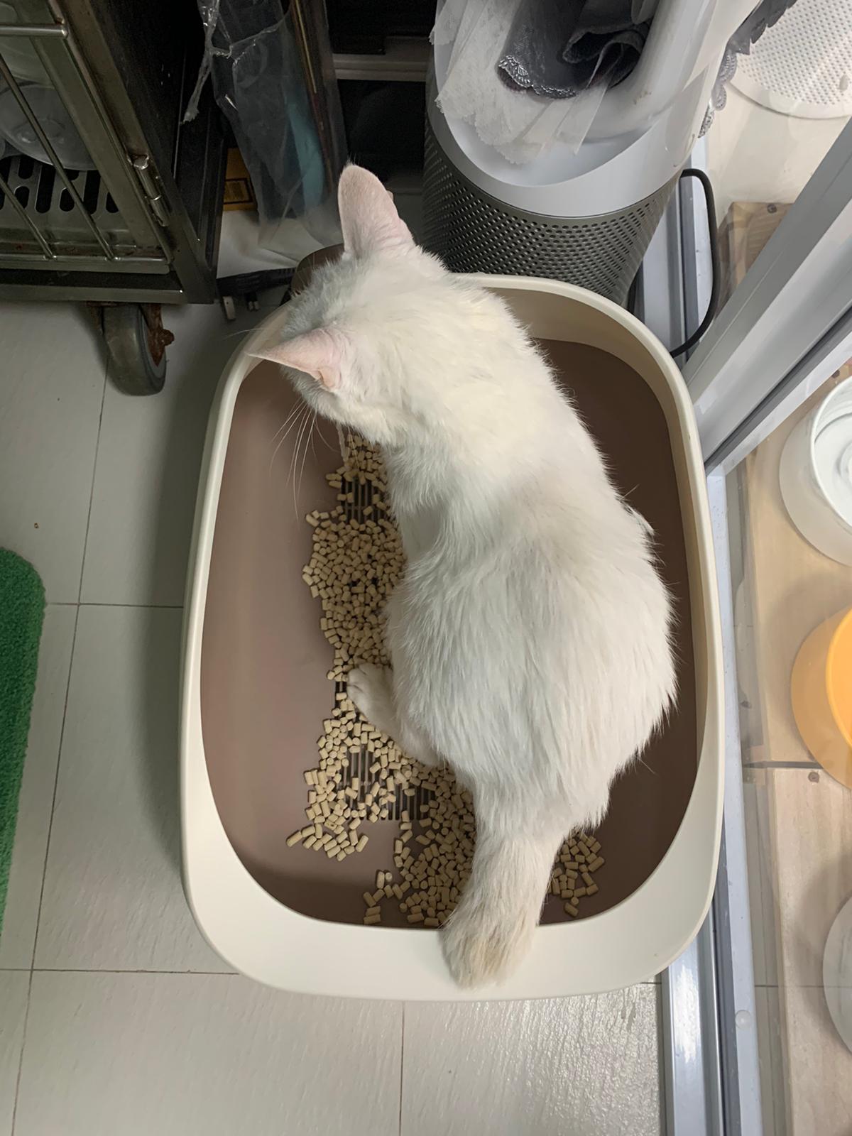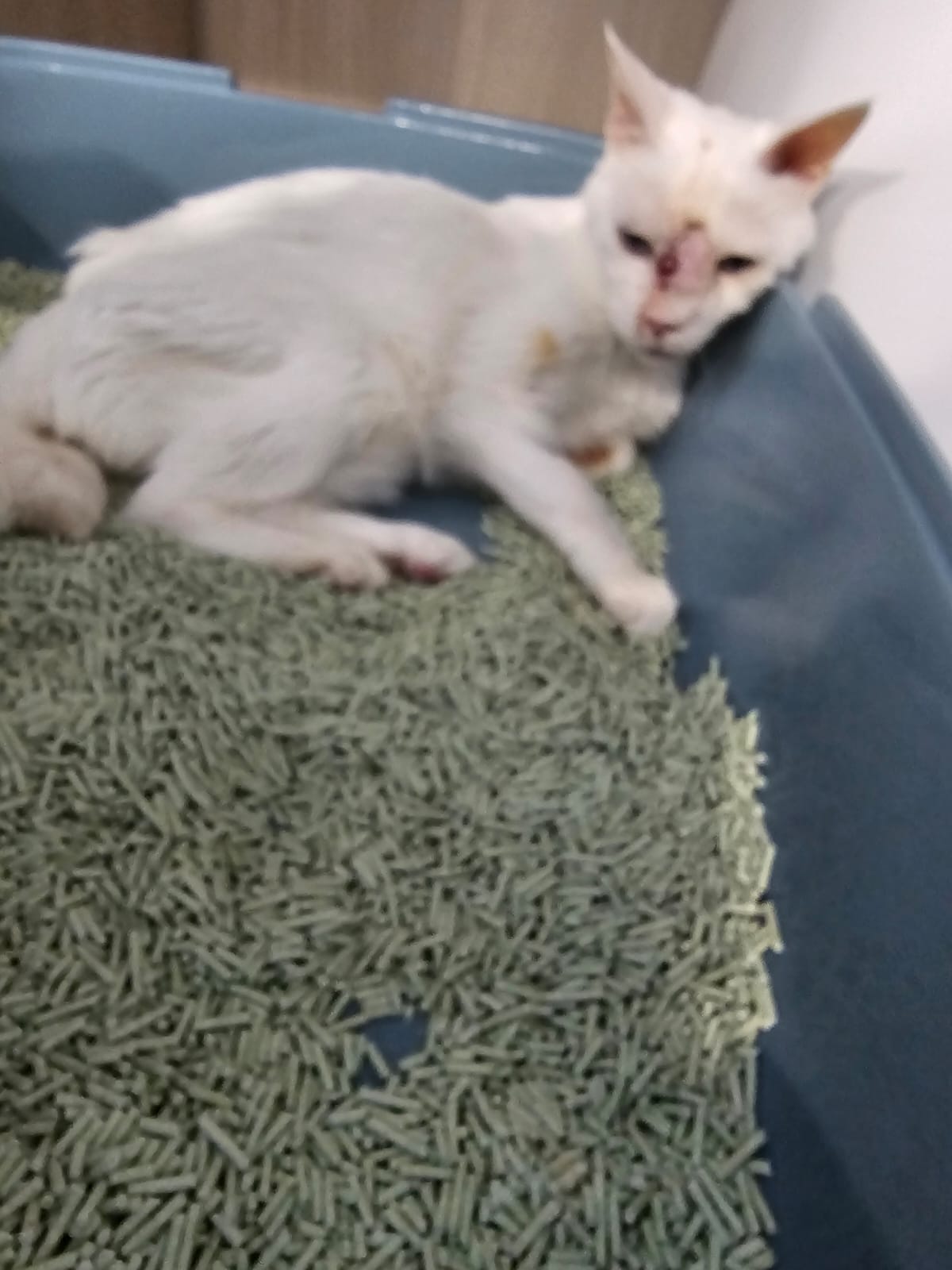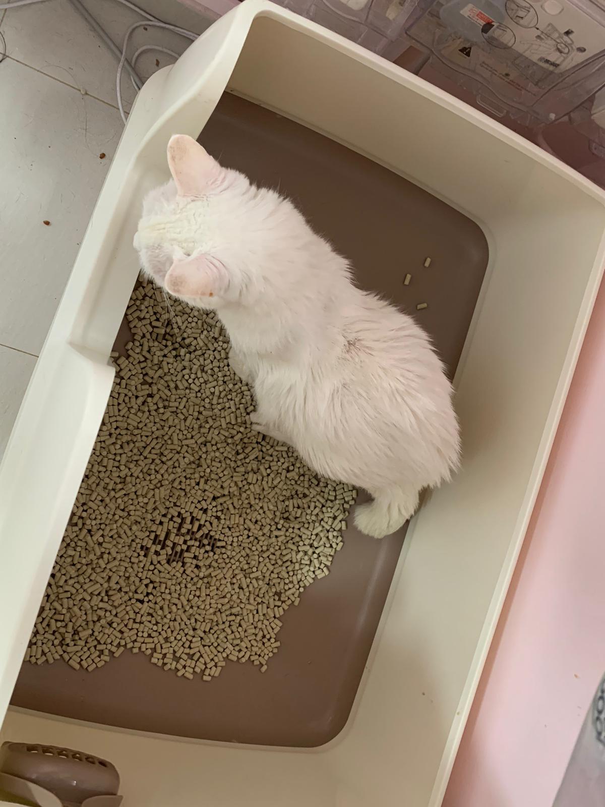 She sit in bin, like scratches and nose discharge still frequent. Clean for her.