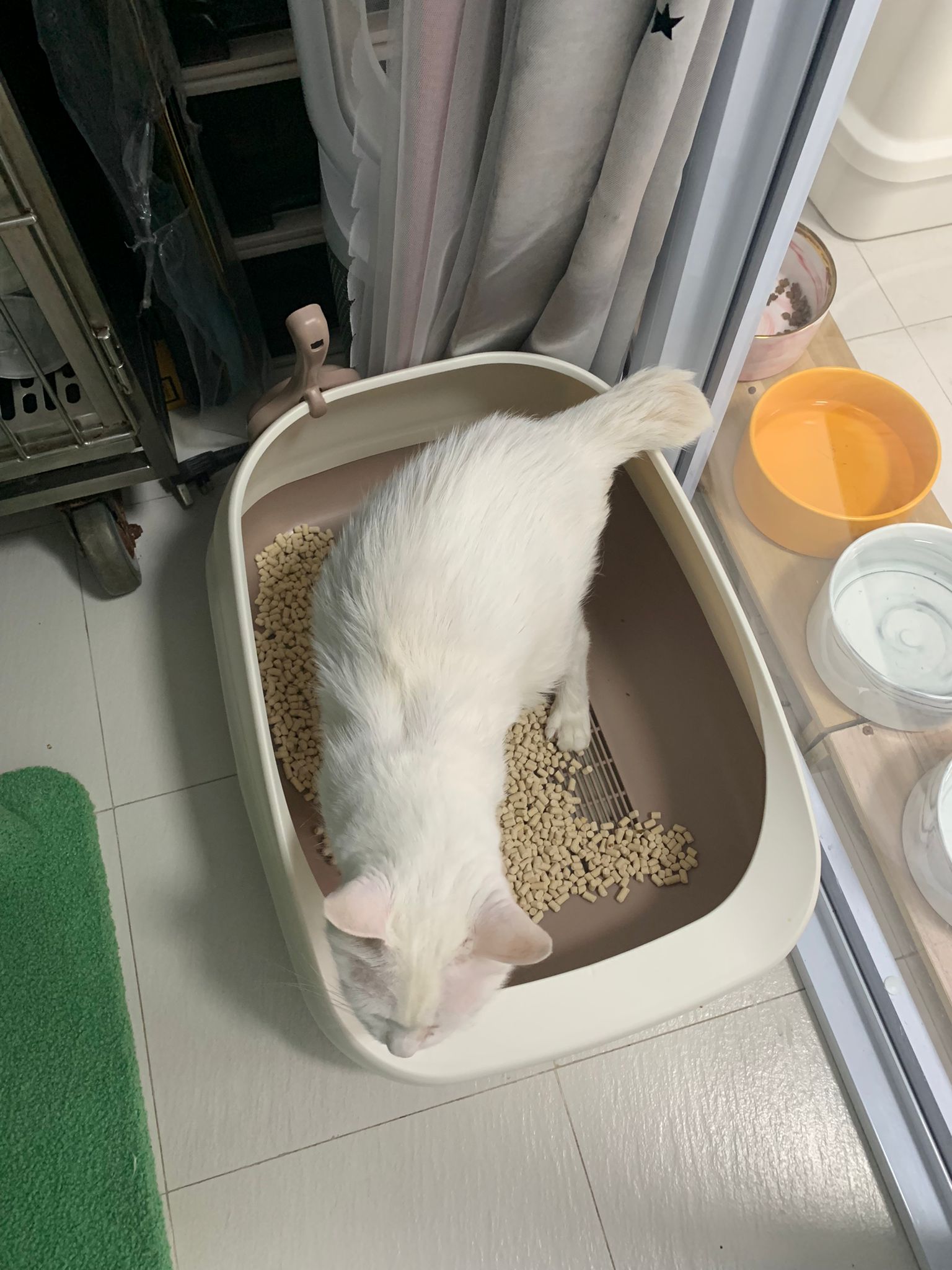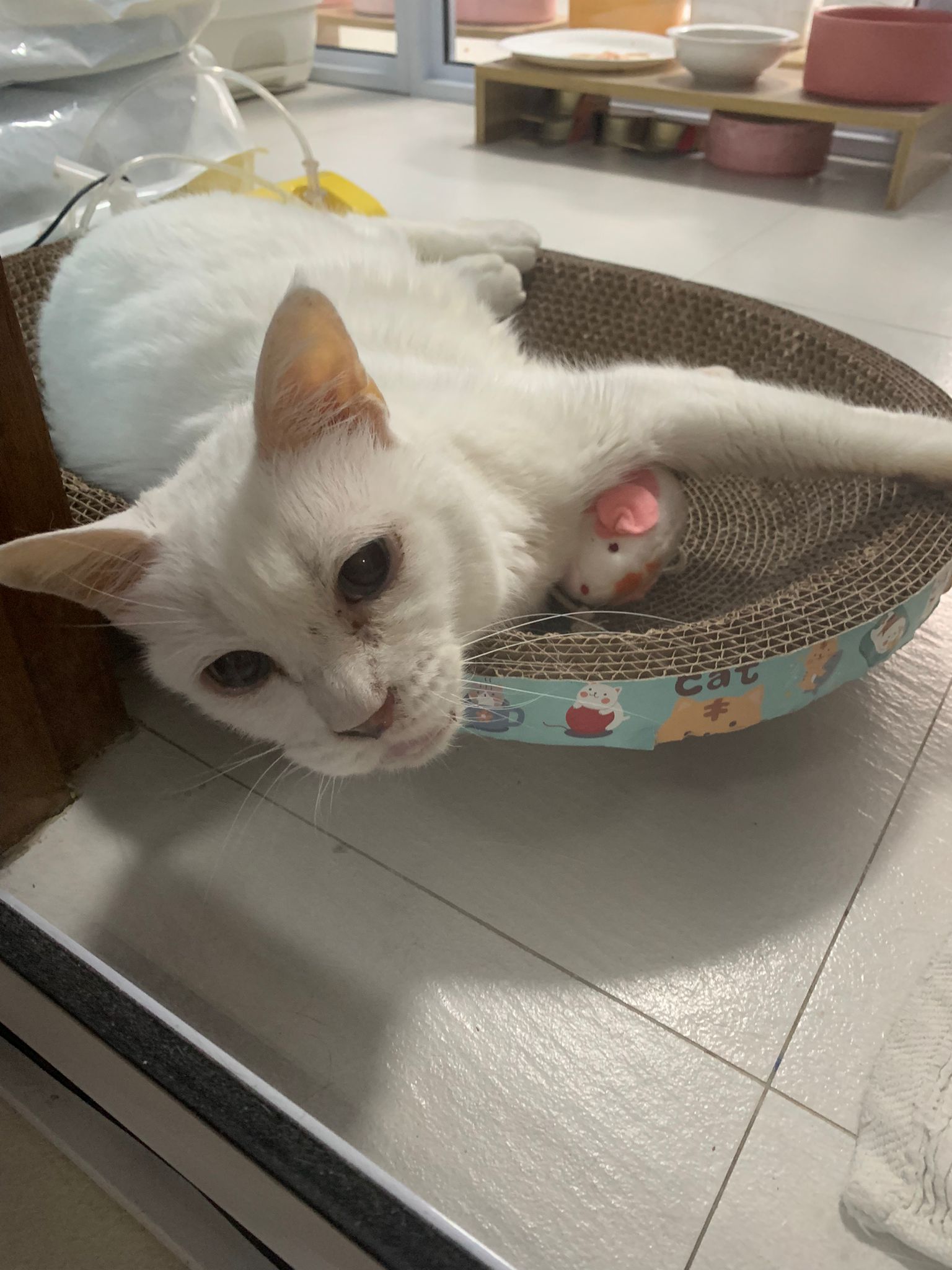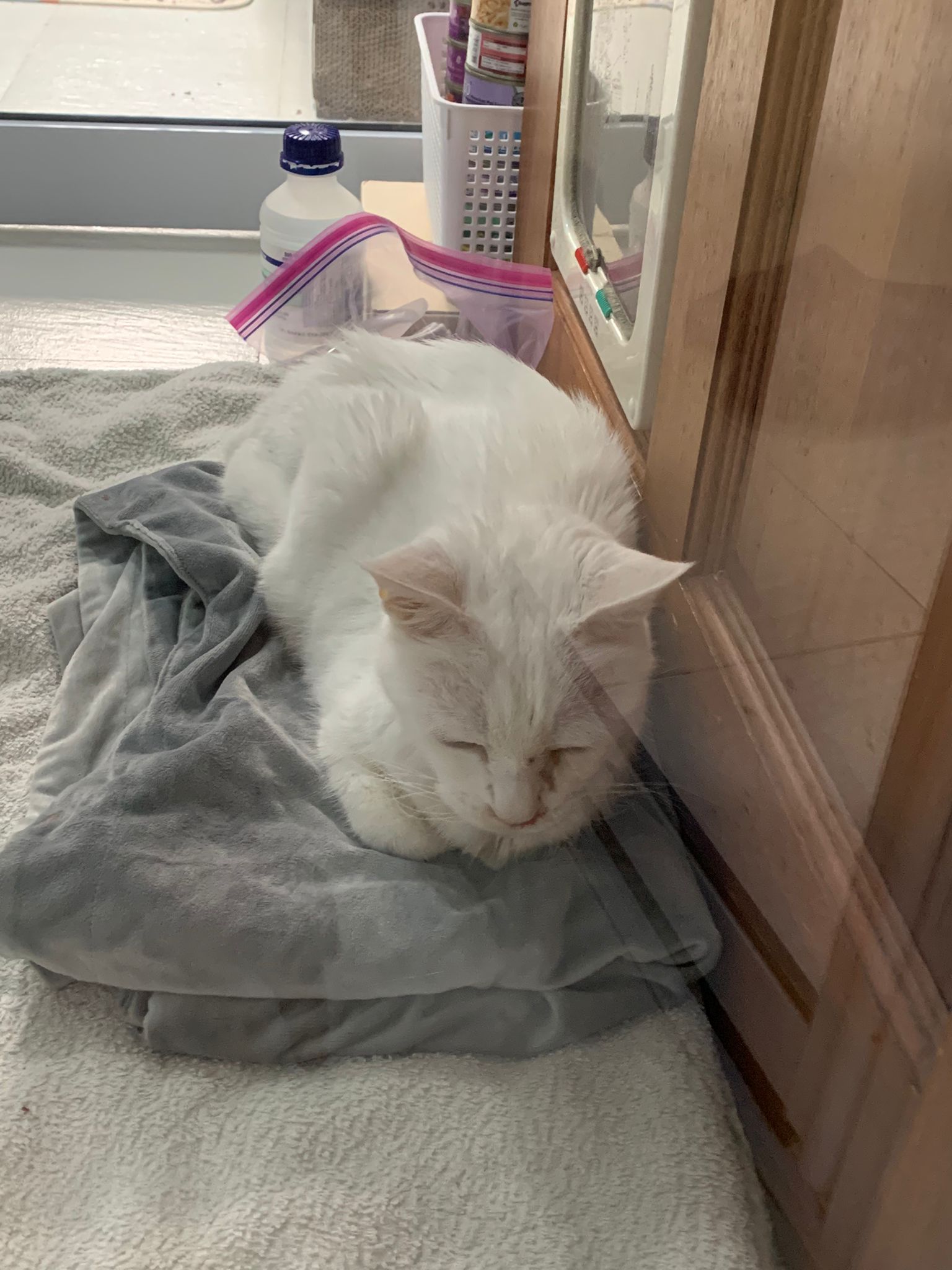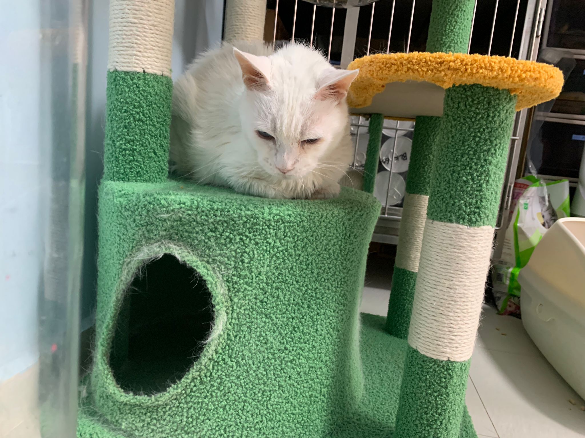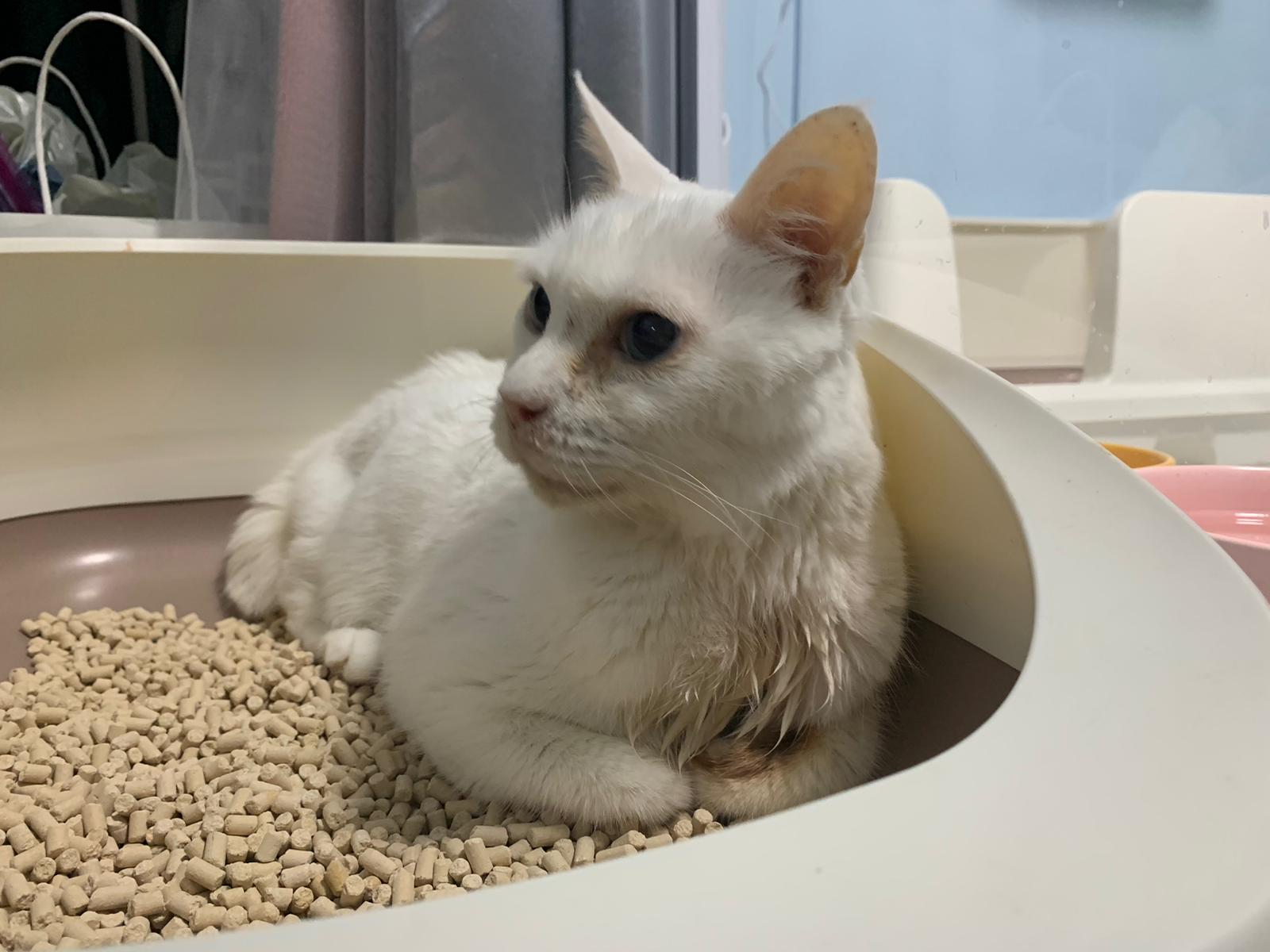 She sit in bin, like scratches and nose discharge still frequent. Clean for her.